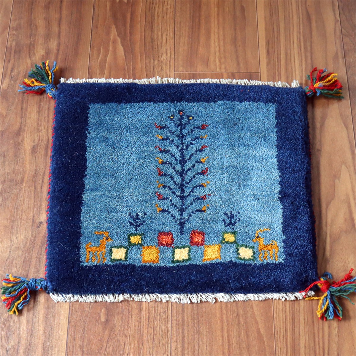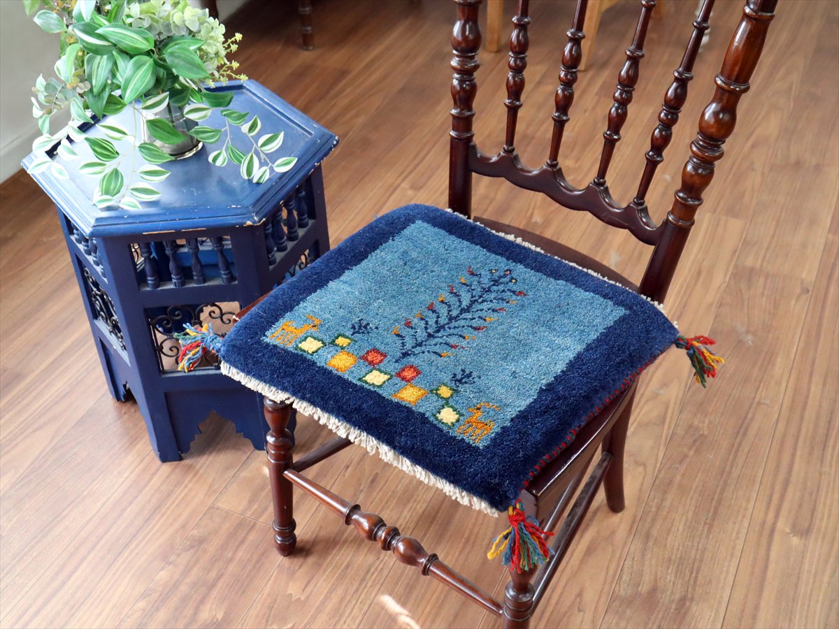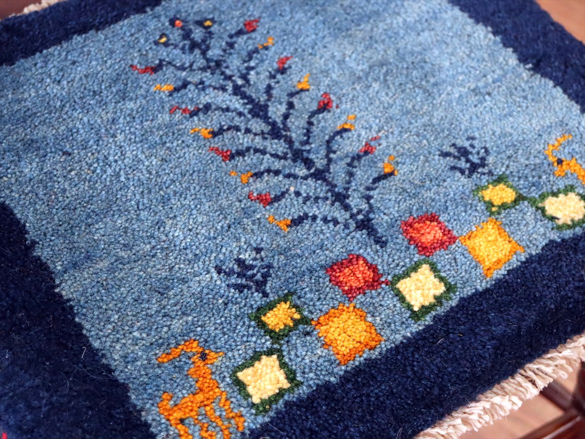 何枚も集めたくなる、40cm角の座布団サイズギャベ。四隅に大きなポンポンのついた、伝統的なスタイルでおられています。フローリングに並べて座布団がわりに使ったり、ベンチやダイニングチェアの座面など、使い方はいろいろ。壁にタペストリーのように飾るのもおすすめです。
