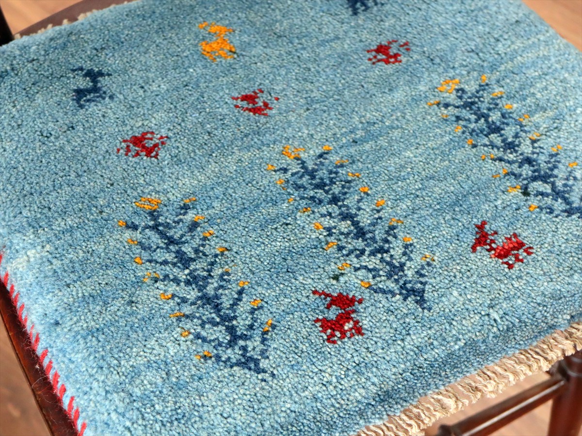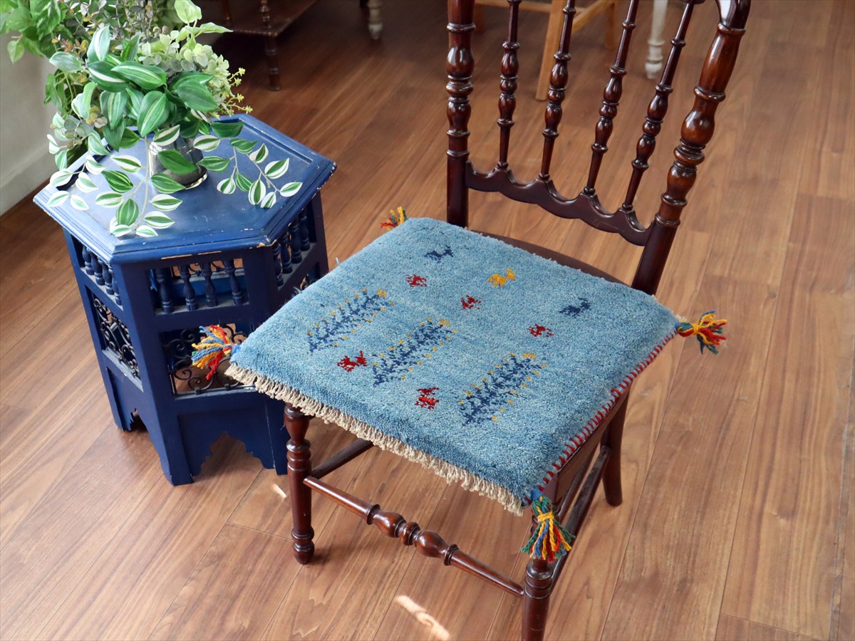 何枚も集めたくなる、40cm角の座布団サイズギャベ。四隅に大きなポンポンのついた、伝統的なスタイルでおられています。フローリングに並べて座布団がわりに使ったり、ベンチやダイニングチェアの座面など、使い方はいろいろ。壁にタペストリーのように飾るのもおすすめです。