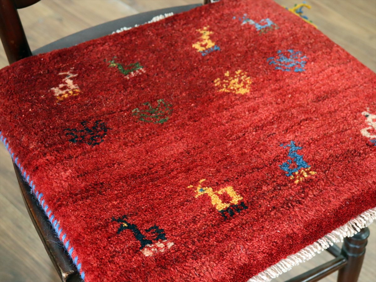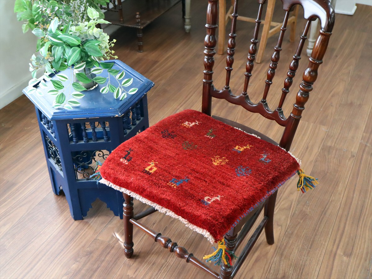 何枚も集めたくなる、40cm角の座布団サイズギャベ。四隅に大きなポンポンのついた、伝統的なスタイルでおられています。フローリングに並べて座布団がわりに使ったり、ベンチやダイニングチェアの座面など、使い方はいろいろ。壁にタペストリーのように飾るのもおすすめです。