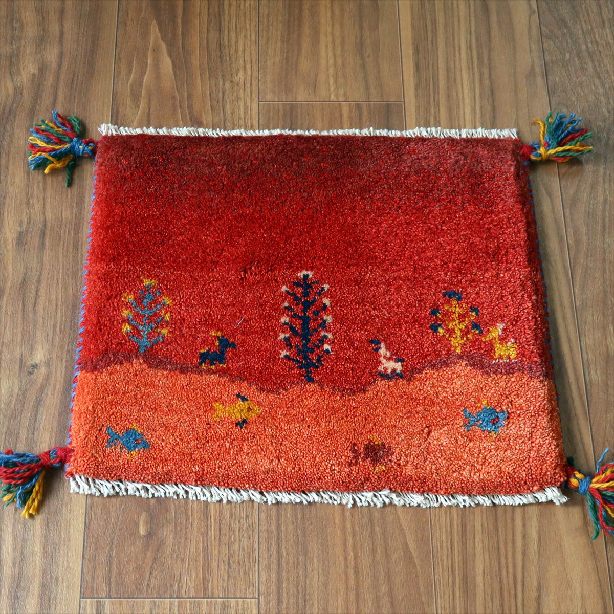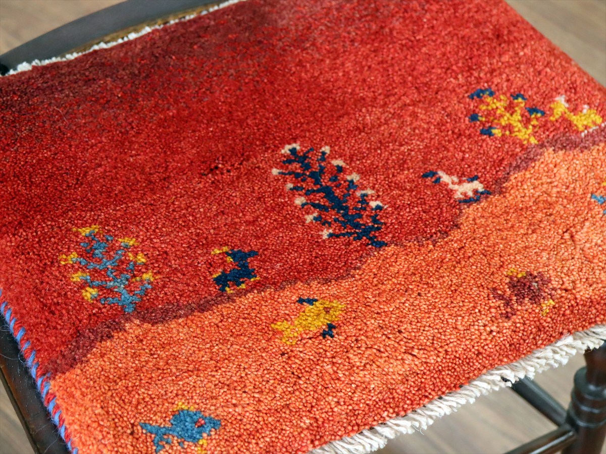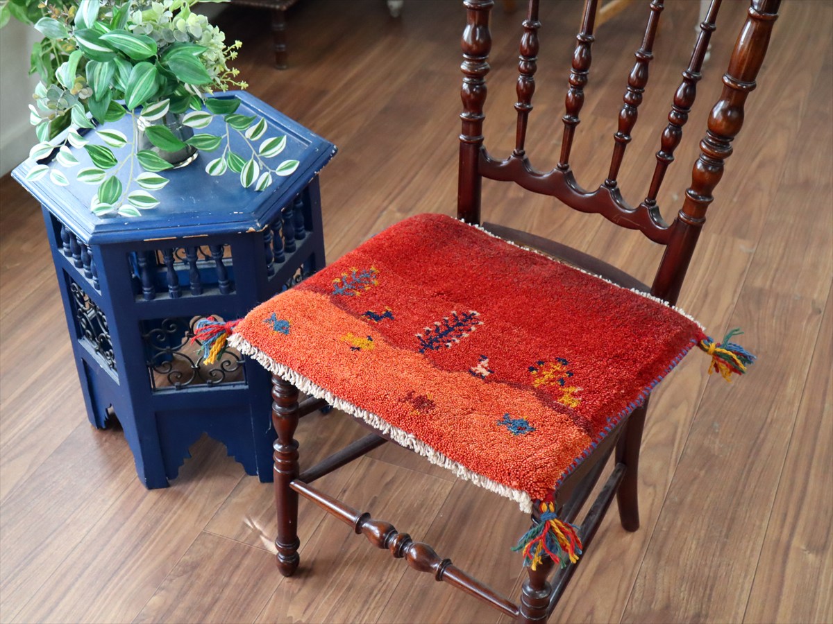 何枚も集めたくなる、40cm角の座布団サイズギャベ。四隅に大きなポンポンのついた、伝統的なスタイルでおられています。フローリングに並べて座布団がわりに使ったり、ベンチやダイニングチェアの座面など、使い方はいろいろ。壁にタペストリーのように飾るのもおすすめです。