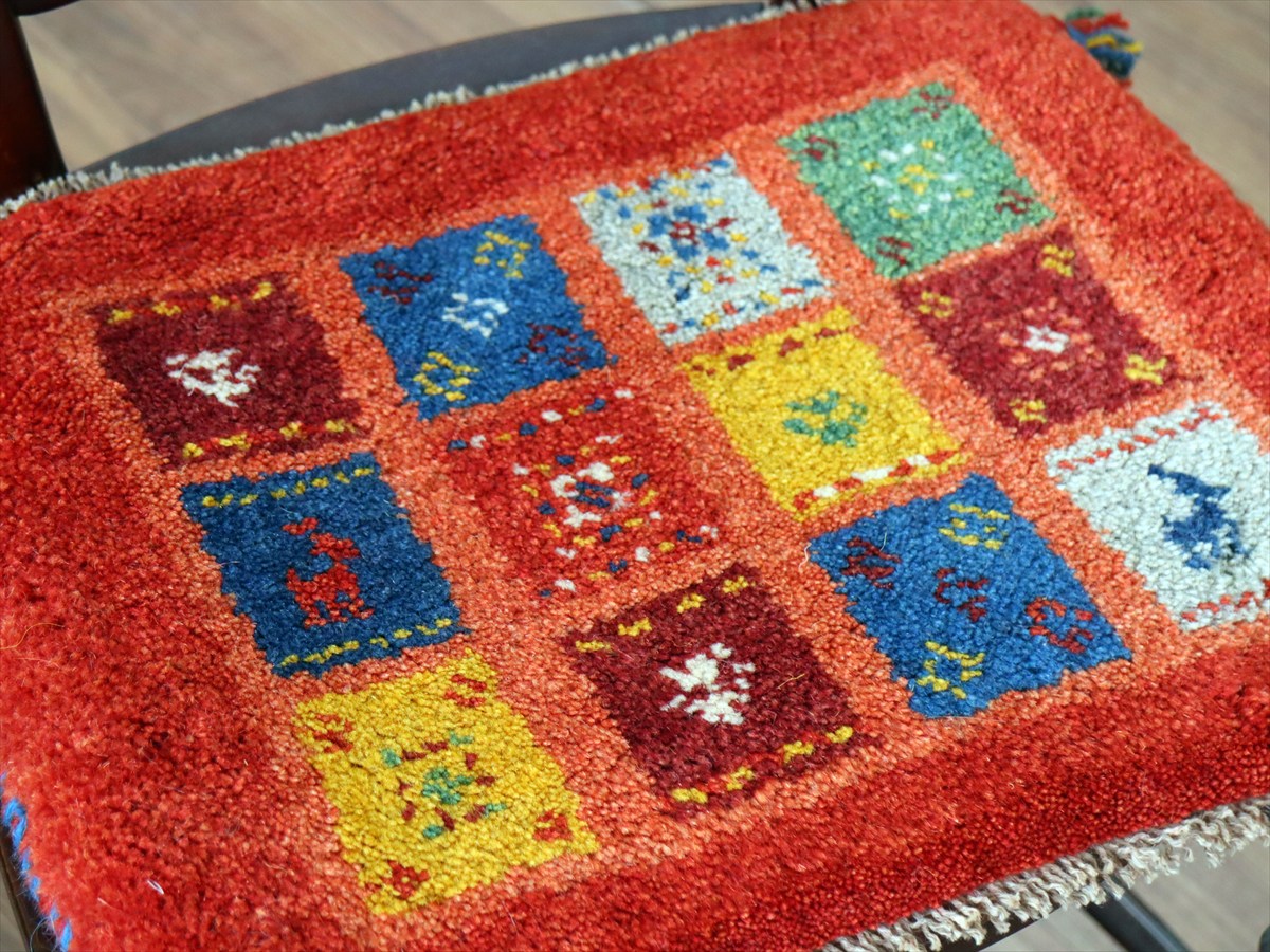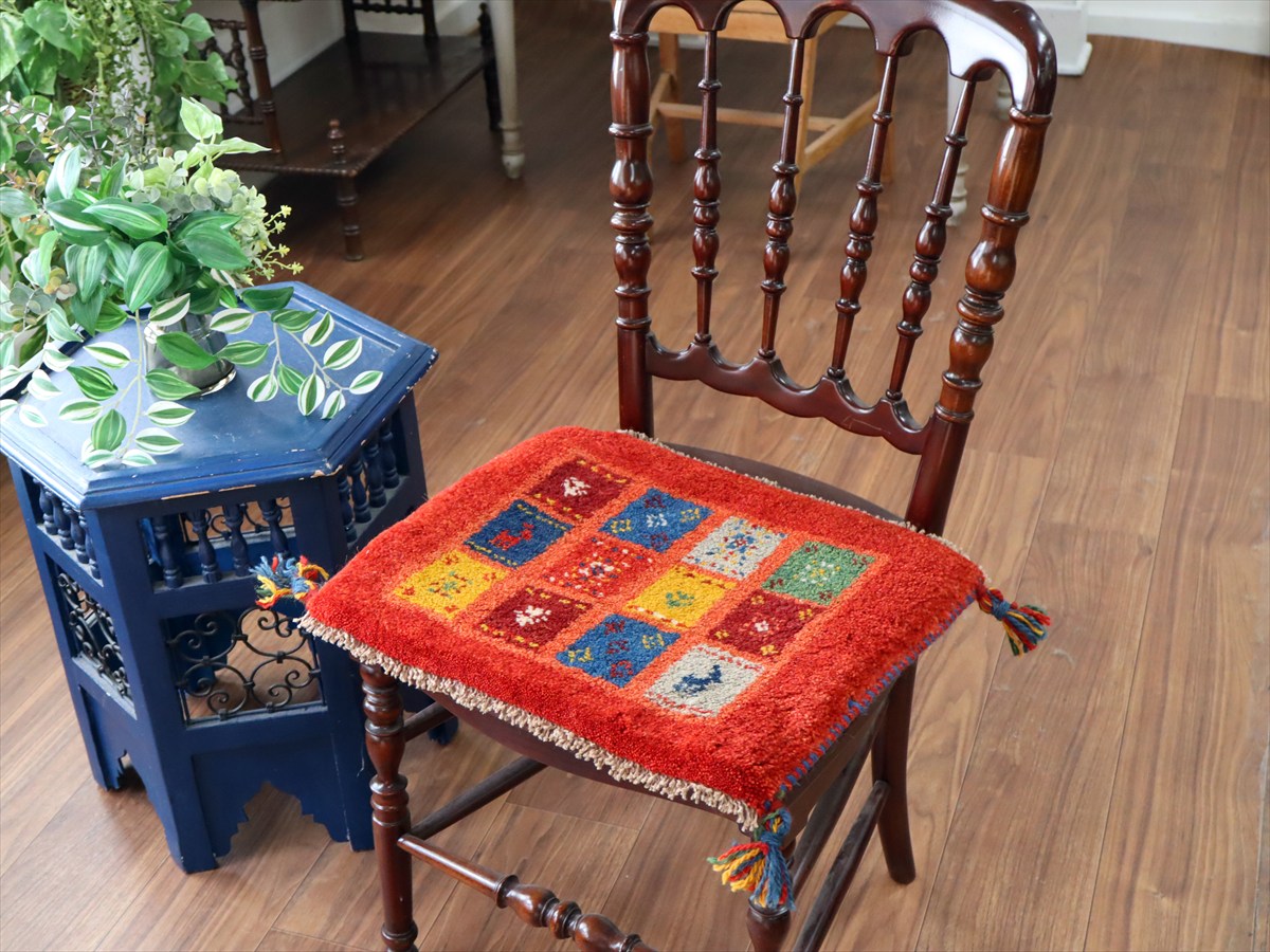 何枚も集めたくなる、40cm角の座布団サイズギャベ。四隅に大きなポンポンのついた、伝統的なスタイルでおられています。フローリングに並べて座布団がわりに使ったり、ベンチやダイニングチェアの座面など、使い方はいろいろ。壁にタペストリーのように飾るのもおすすめです。