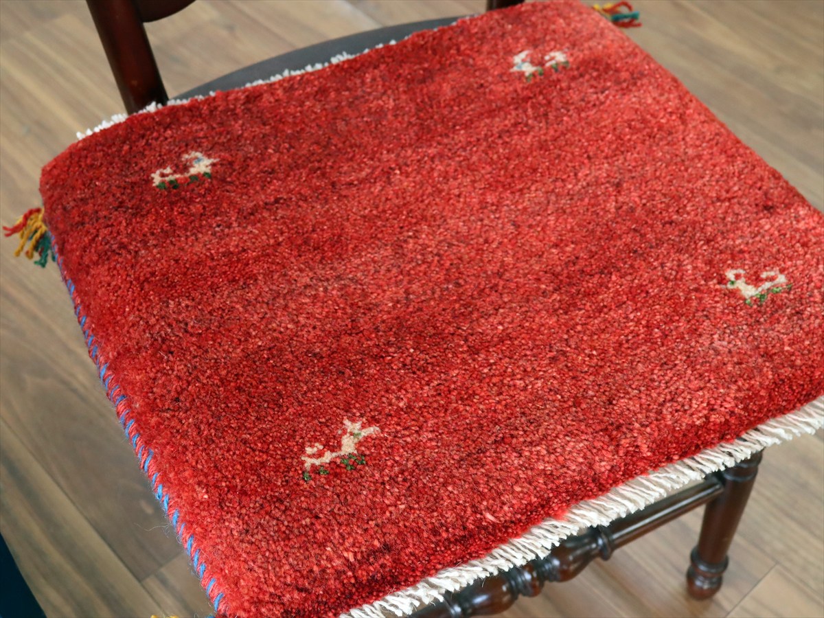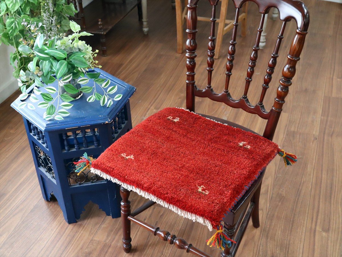 何枚も集めたくなる、40cm角の座布団サイズギャベ。四隅に大きなポンポンのついた、伝統的なスタイルでおられています。フローリングに並べて座布団がわりに使ったり、ベンチやダイニングチェアの座面など、使い方はいろいろ。壁にタペストリーのように飾るのもおすすめです。