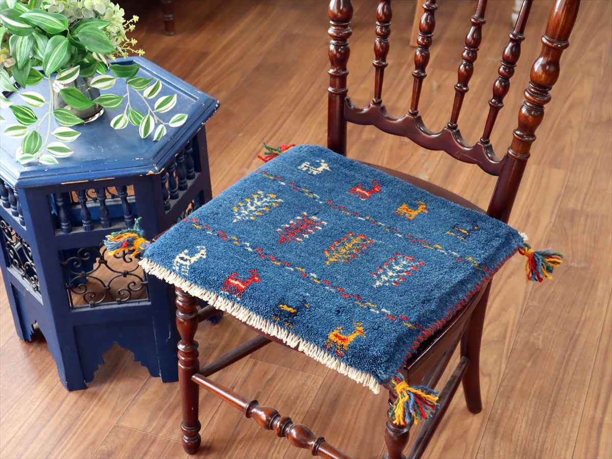 何枚も集めたくなる、40cm角の座布団サイズギャベ。四隅に大きなポンポンのついた、伝統的なスタイルでおられています。フローリングに並べて座布団がわりに使ったり、ベンチやダイニングチェアの座面など、使い方はいろいろ。壁にタペストリーのように飾るのもおすすめです。