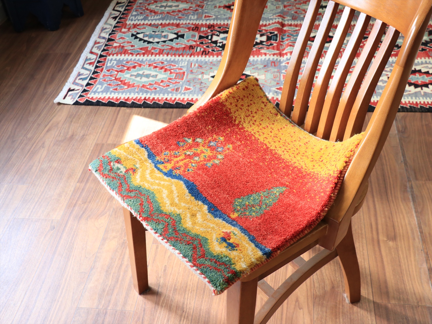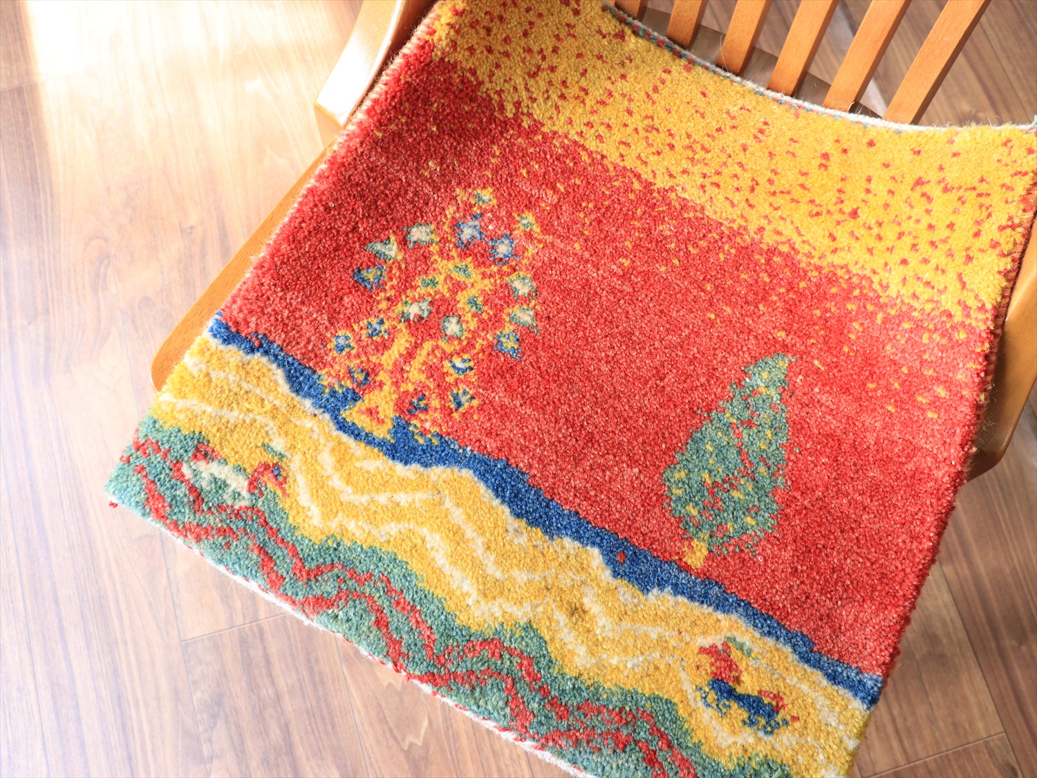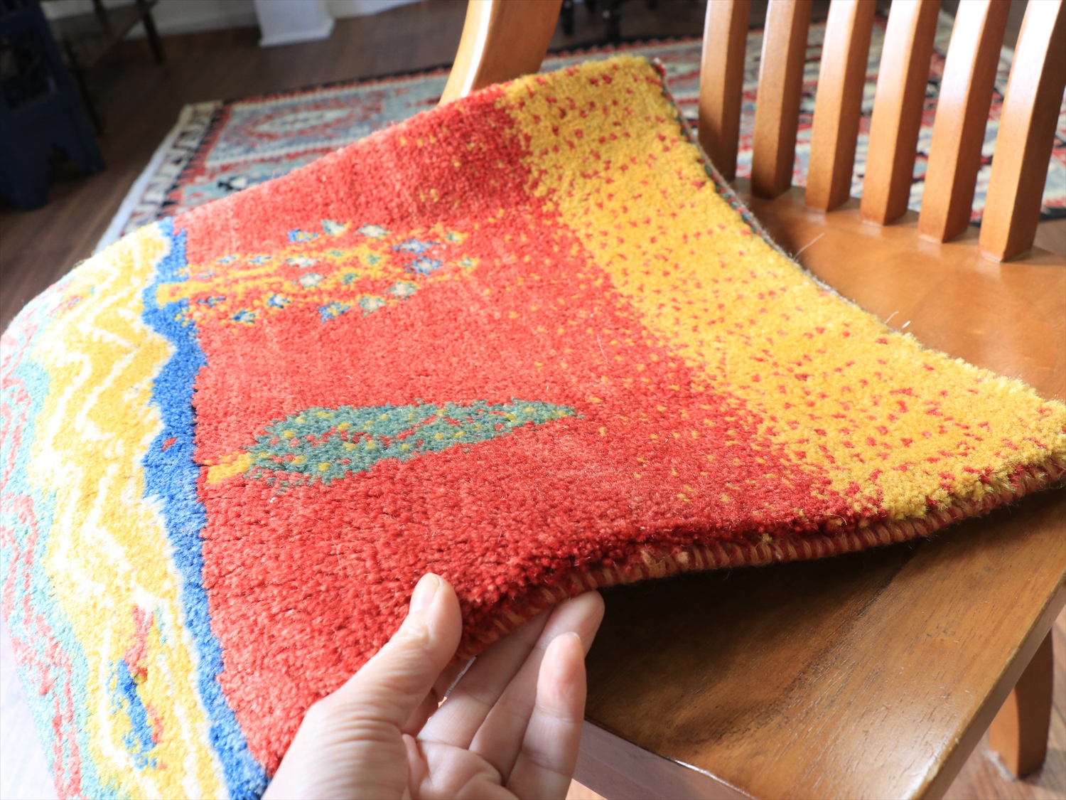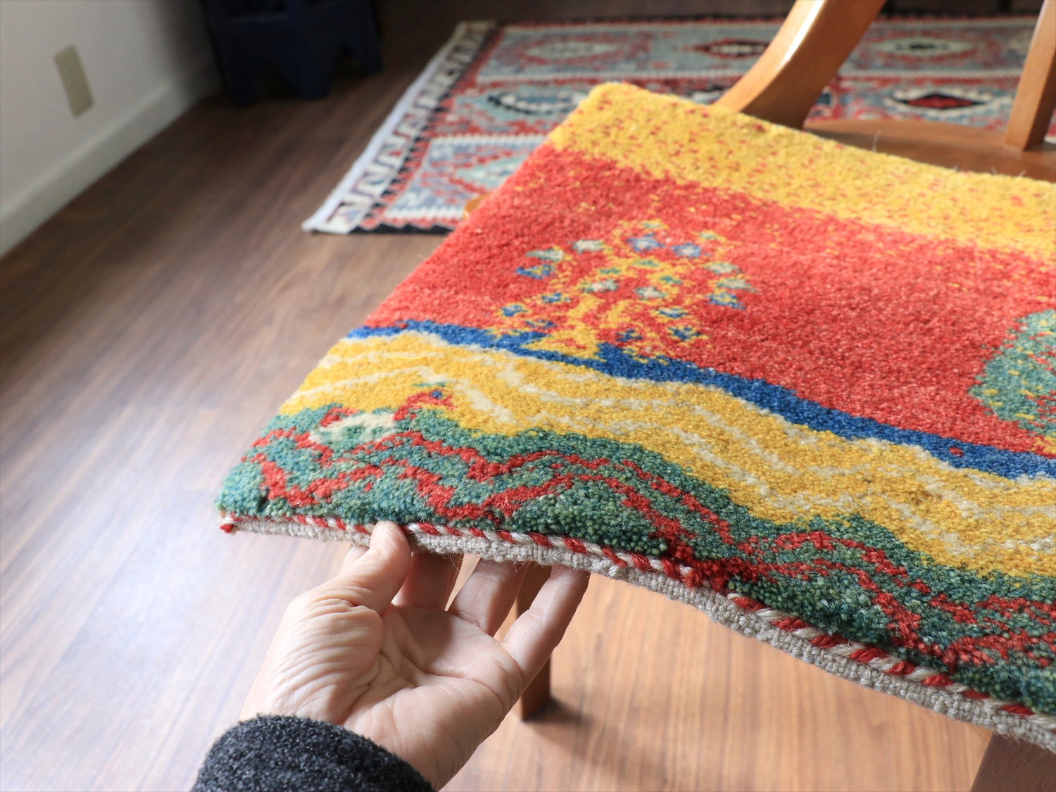 ふっくらとした厚みのある織り地で、パイル(毛足)を含めたギャッベの厚みは、1.7-1.8cm程度。上下の房を巻き込んだり、何度もシャーリングをしたり、丁寧に仕上げられたコレクションです。