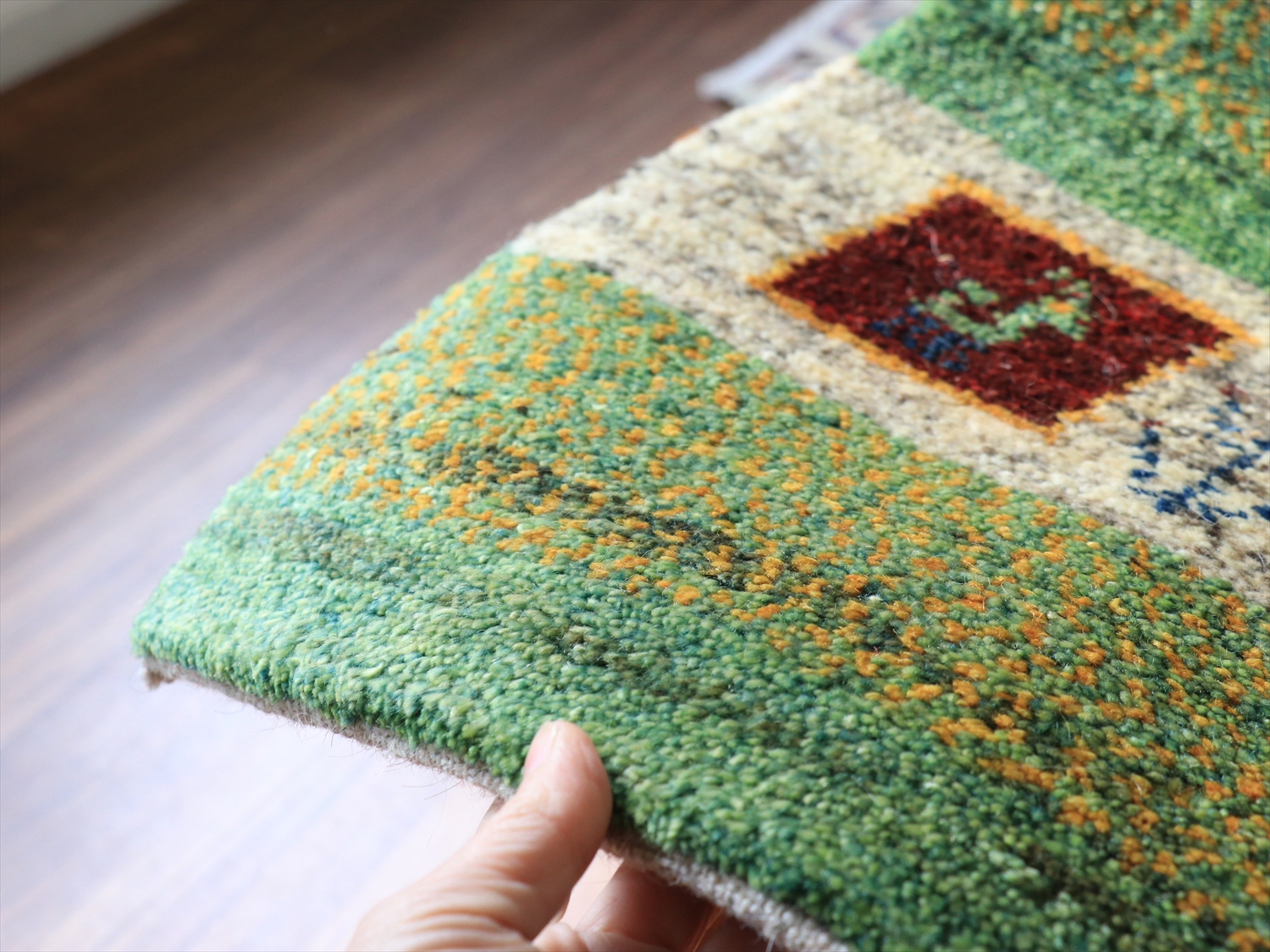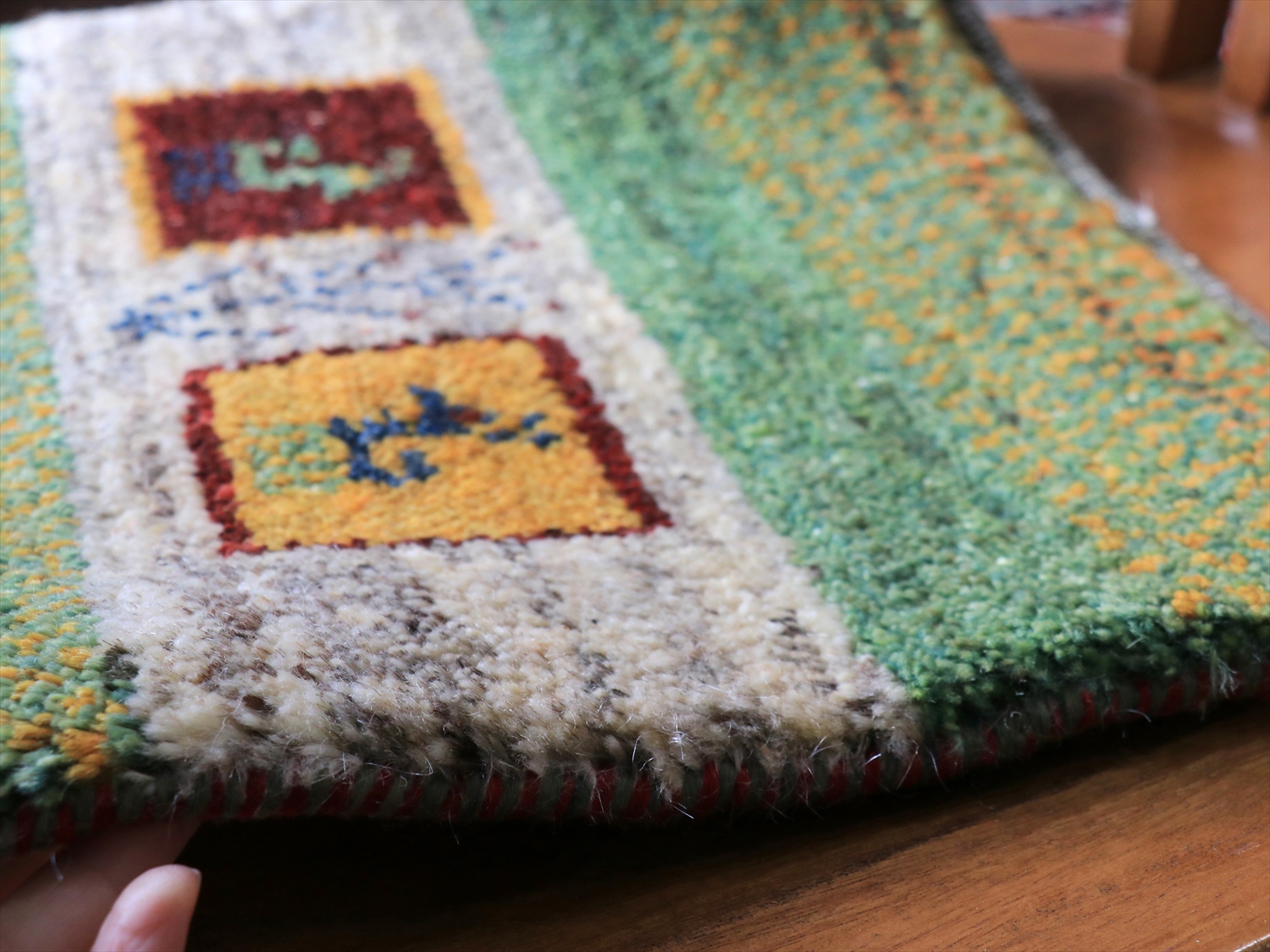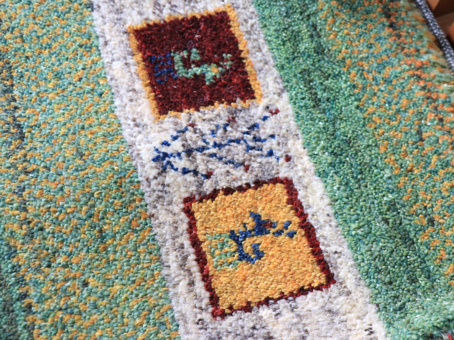 ・手紡ぎ、草木染(または無染色)、ウール100%、手織りのギャッベ。