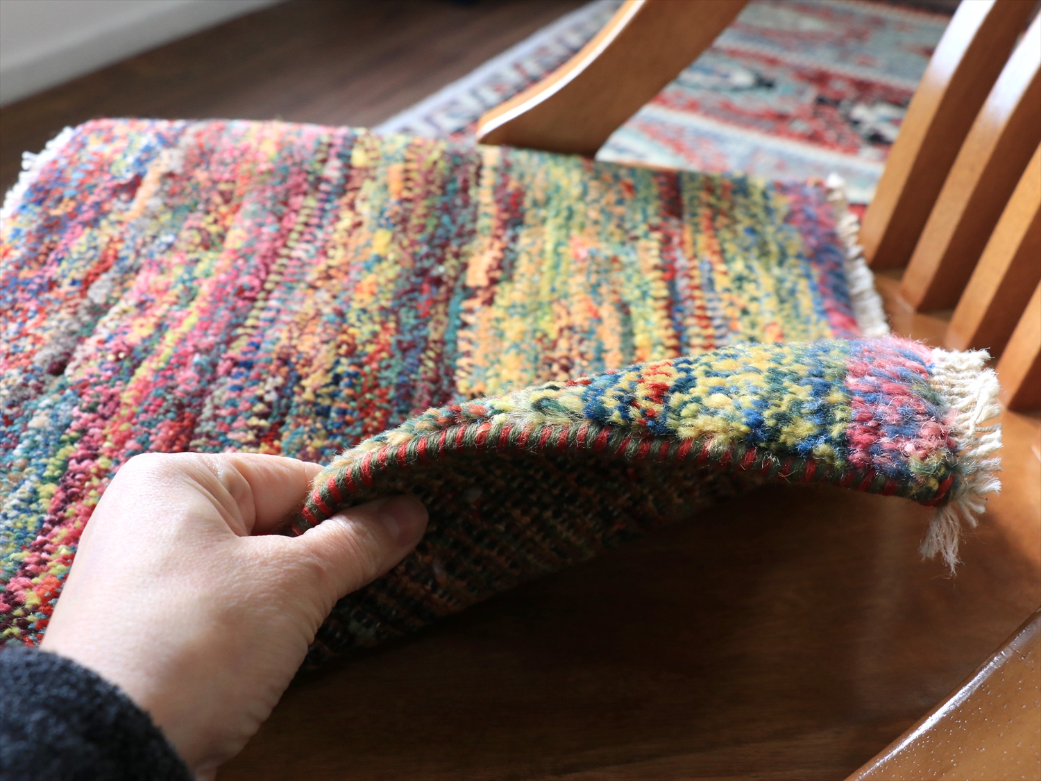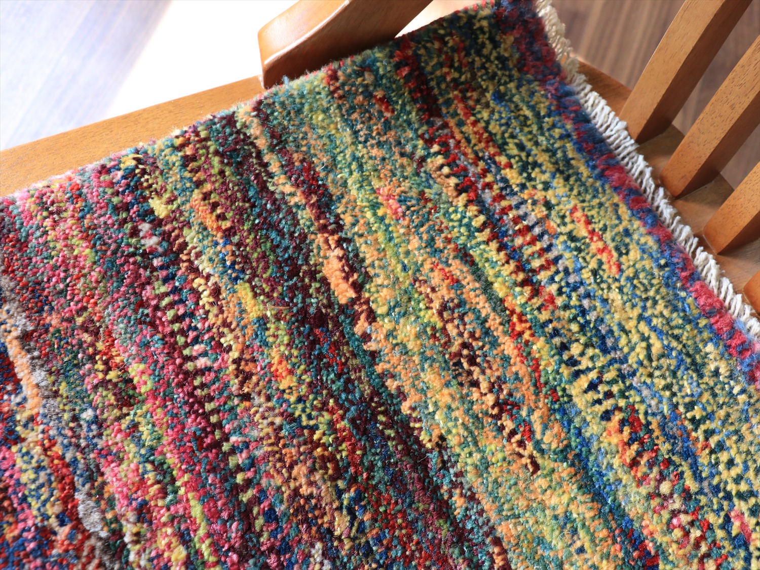 何色ものカラフルな毛糸を使って、織り子さんが色を変えては結んで、色を変えては結んで、を繰り返して仕上げられています。アーティスティックな一枚。