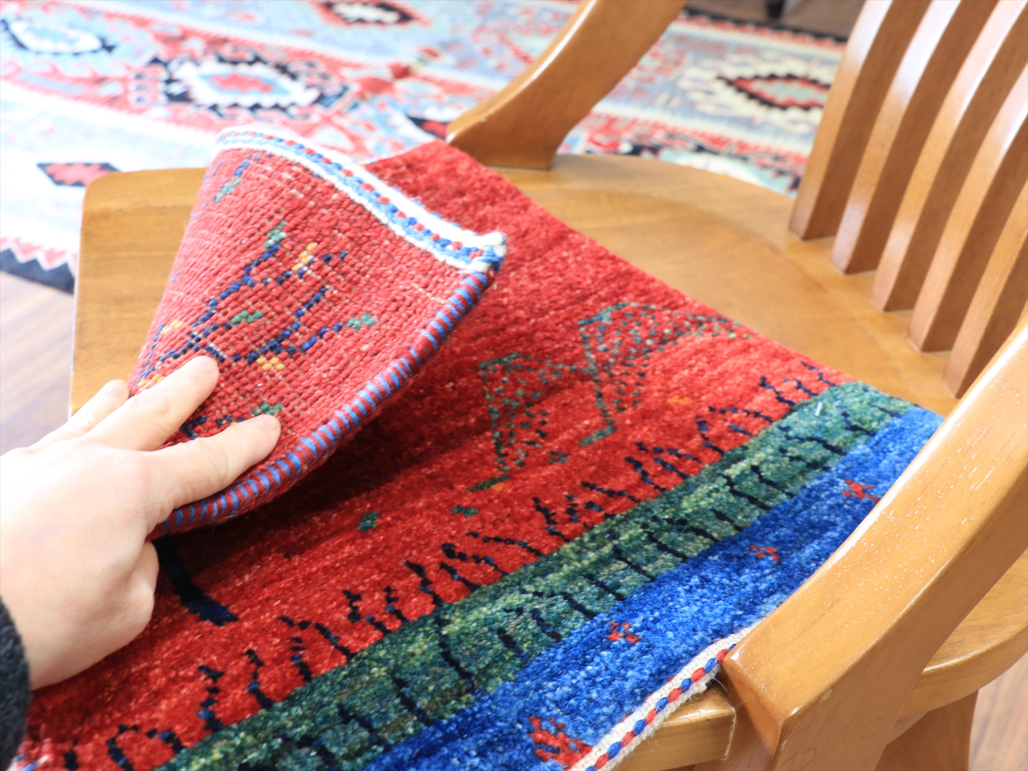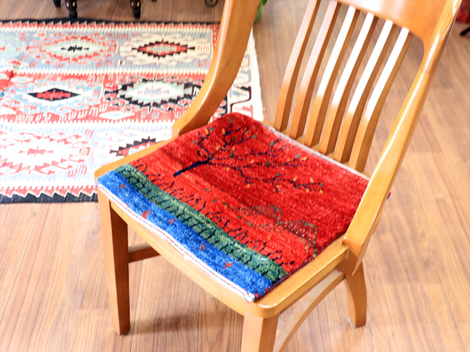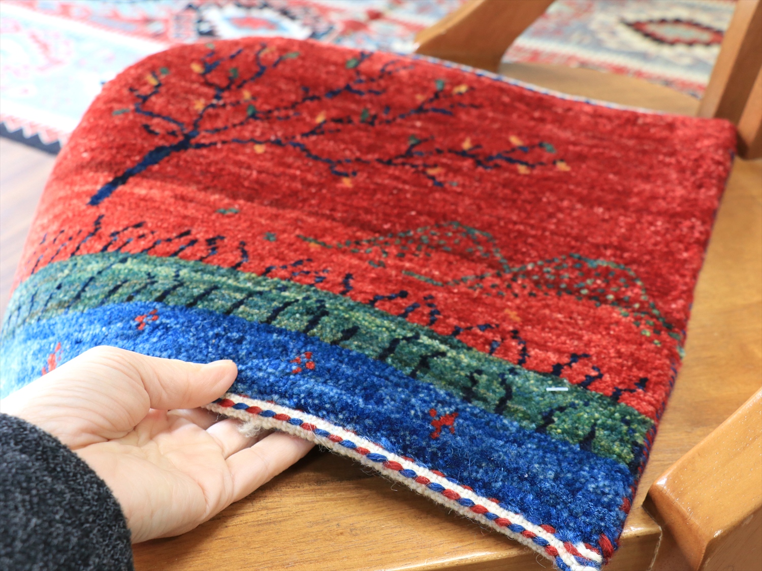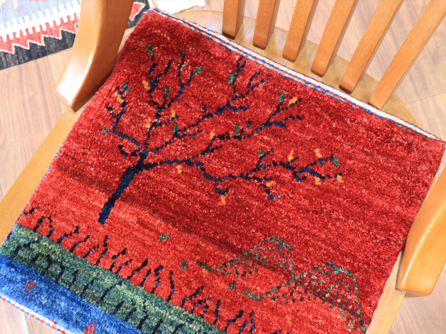 小さいサイズながら、枝葉を伸ばす生命の木と遠くにかすむ山々が表現された風景のギャッベ。織り目の細かなギャッベだからこそのデザインです。