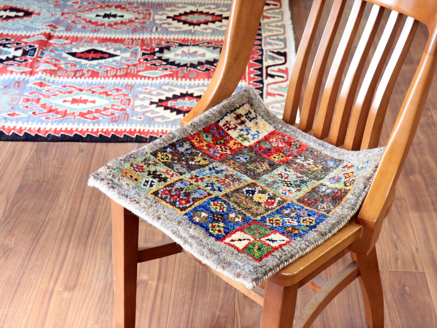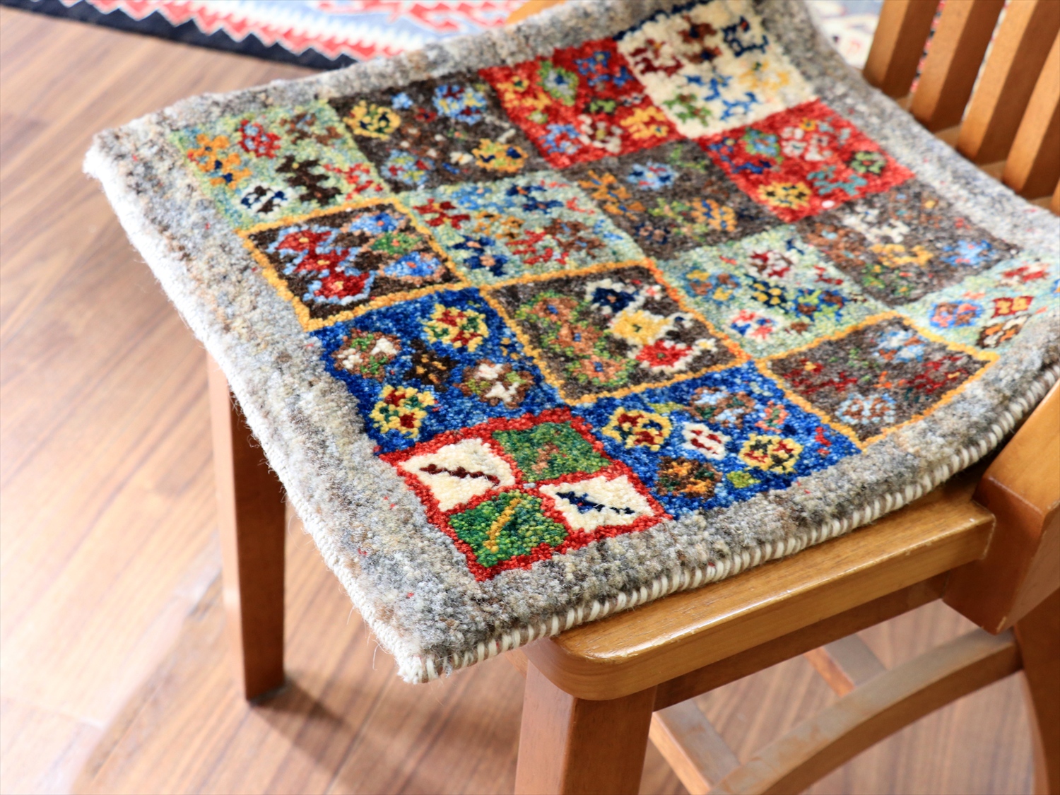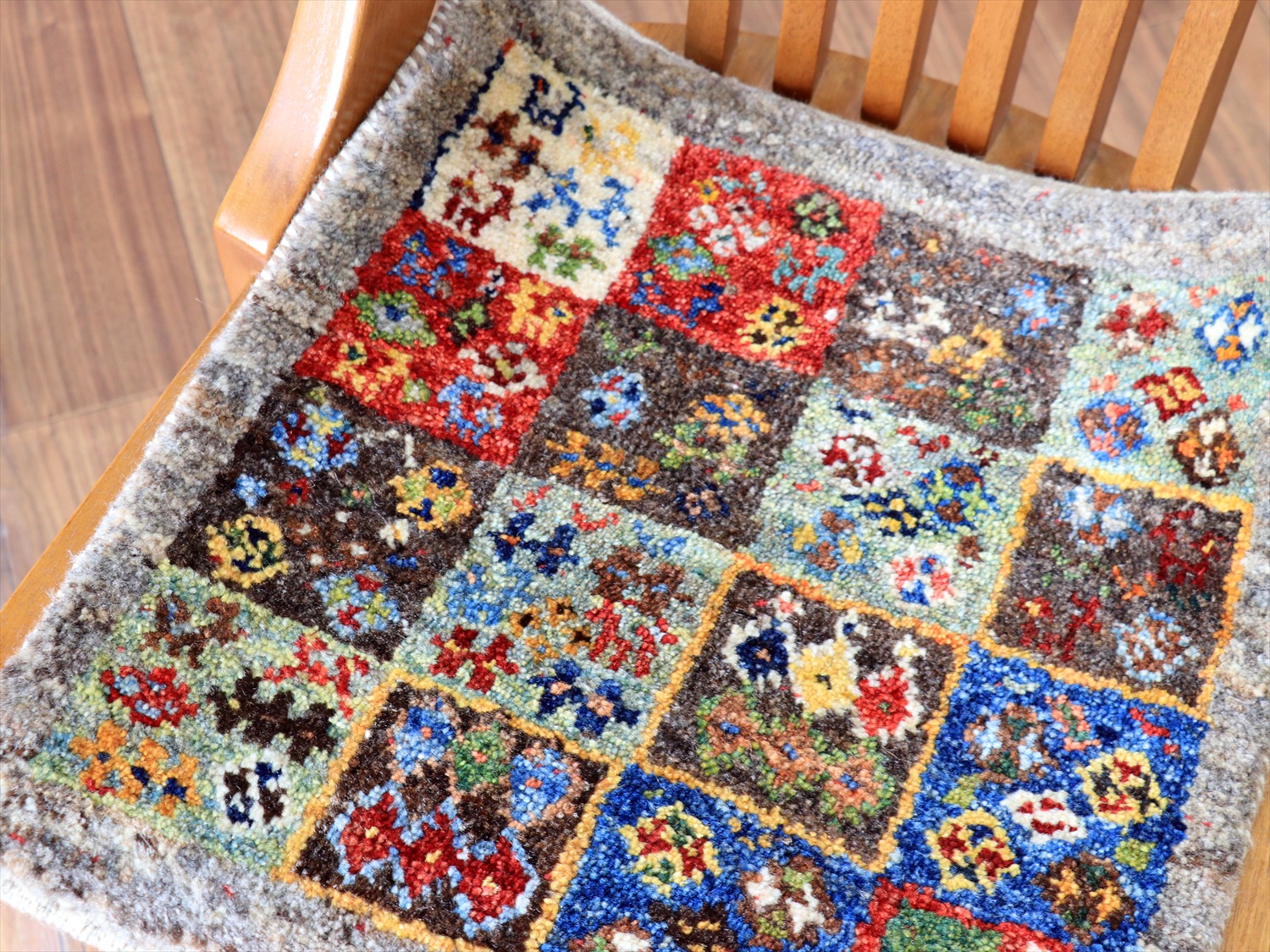 天然の羊毛のグレーをベースにして、タイルモチーフの中に小さなモチーフがたくさん織り込まれた楽しい一枚。