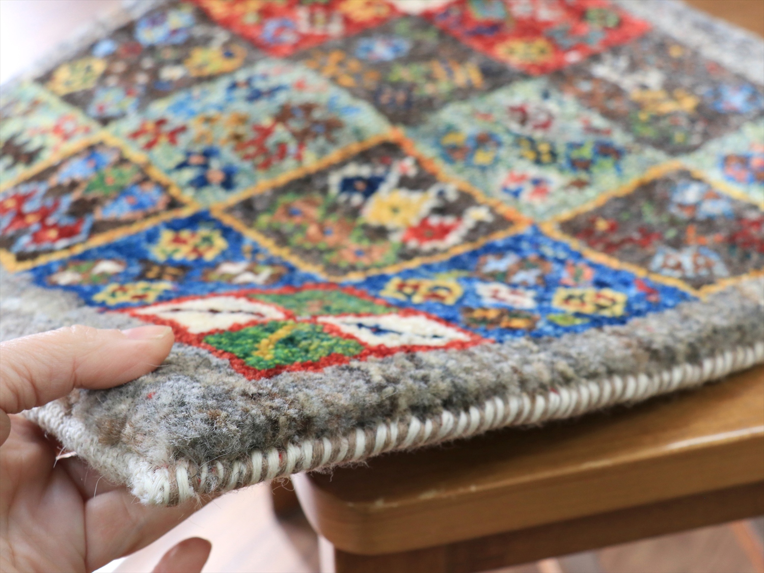 ふっくらとした厚みのある織り地で、パイル(毛足)を含めたギャッベの厚みは、1.7-1.8cm程度。上下の房を巻き込んだり、何度もシャーリングをしたり、丁寧に仕上げられたコレクションです。