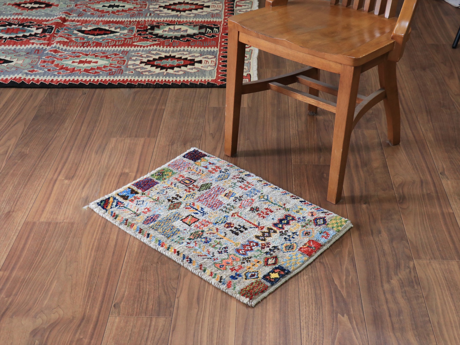 天然の羊毛のグレーをベースにして、小さなモチーフがたくさん織り込まれた楽しい一枚。