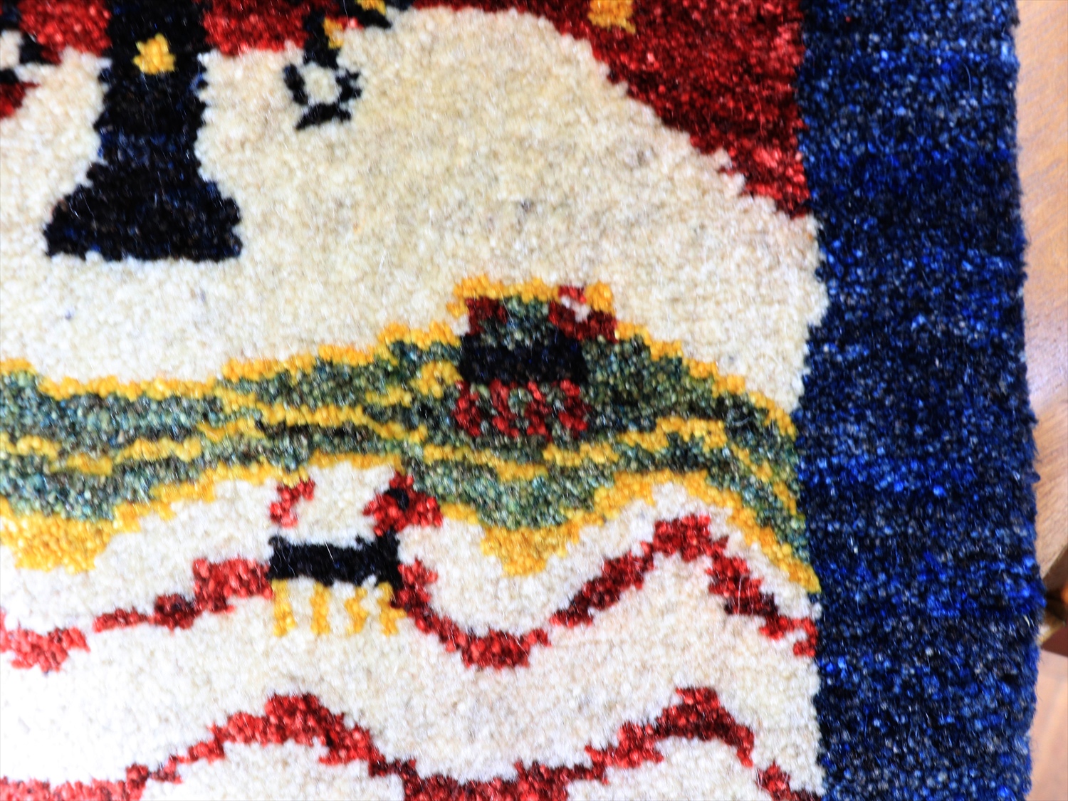 織り地はやわらかさがあり、厚みは1.3-1.4cm程度。・手紡ぎ、草木染(または無染色)、ウール100%、手織りのギャッベ。・余分なウール繊維を焼き飛ばして、水洗いとシャーリングを数回繰り返した丁寧な仕上げ。遊び毛はほとんどでません。