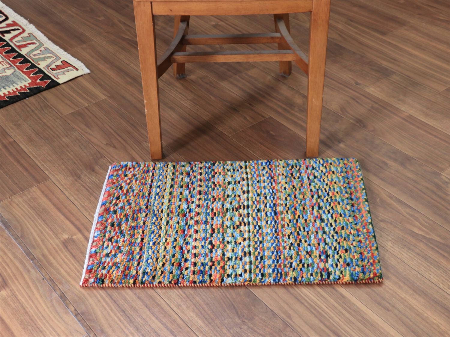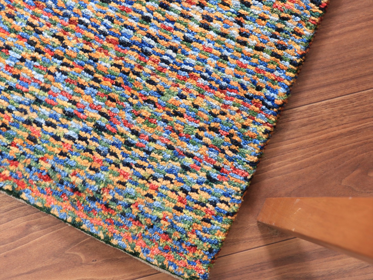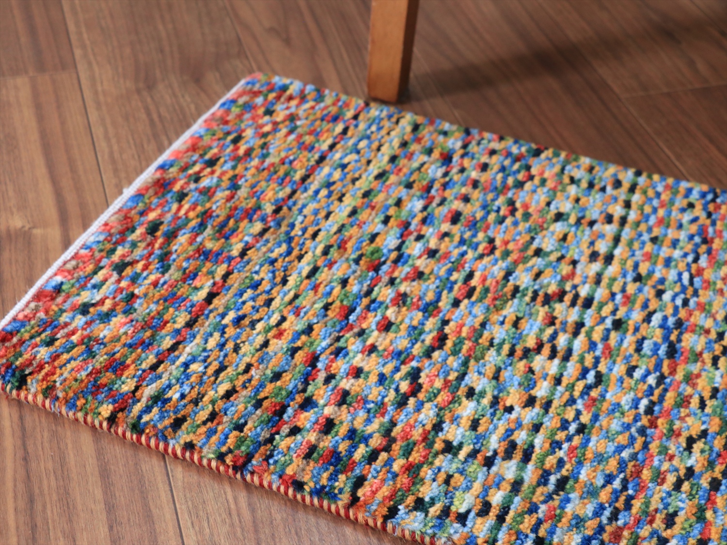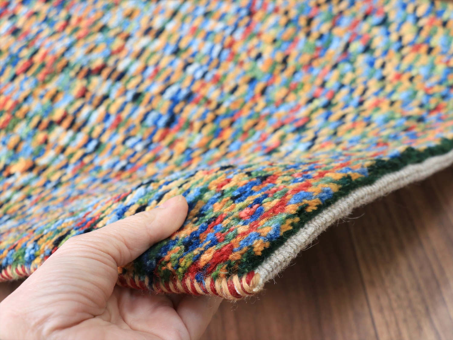 何色ものカラフルな毛糸を使って、織り子さんが色を変えては結んで、色を変えては結んで、を繰り返して仕上げられています。