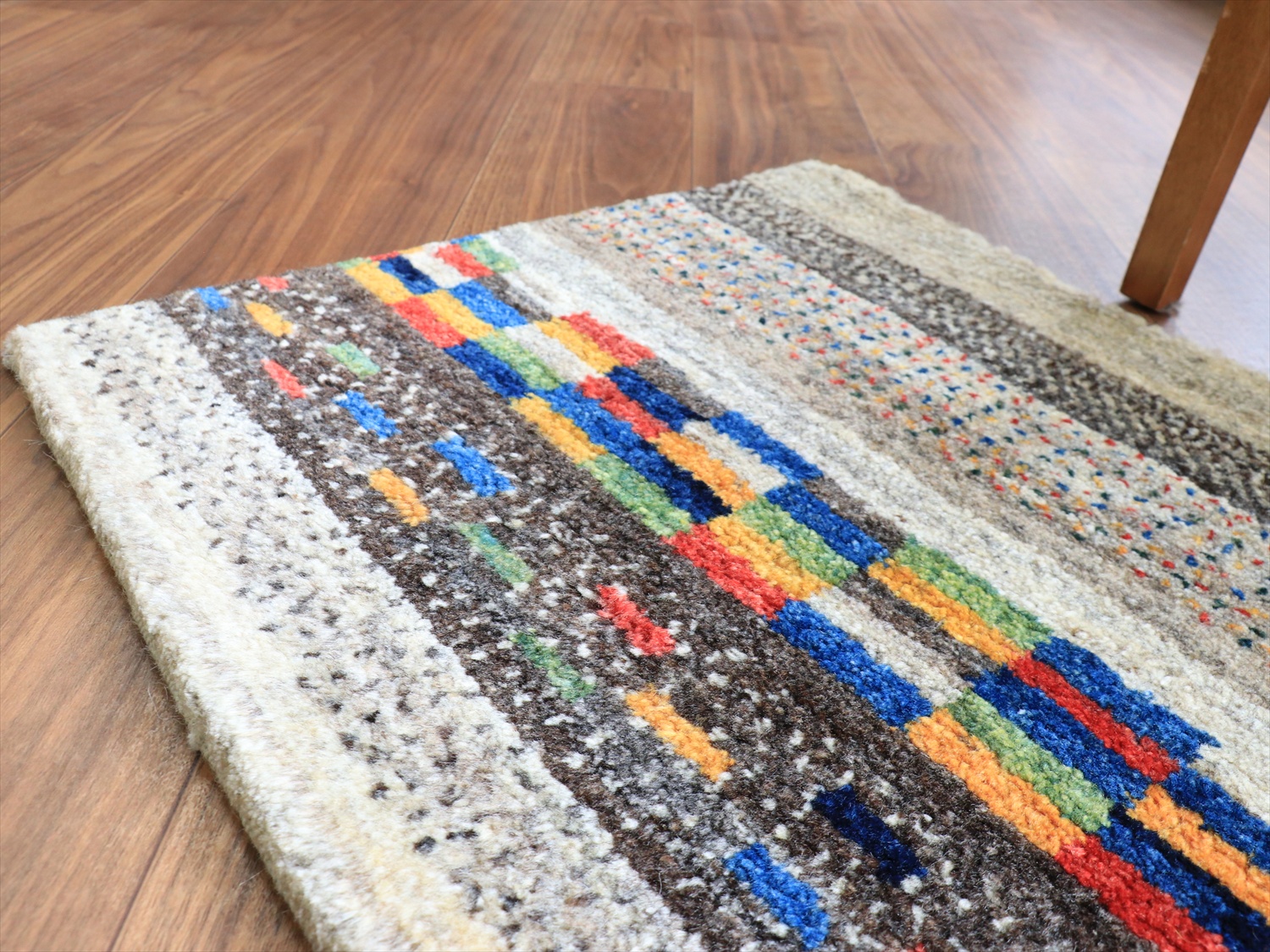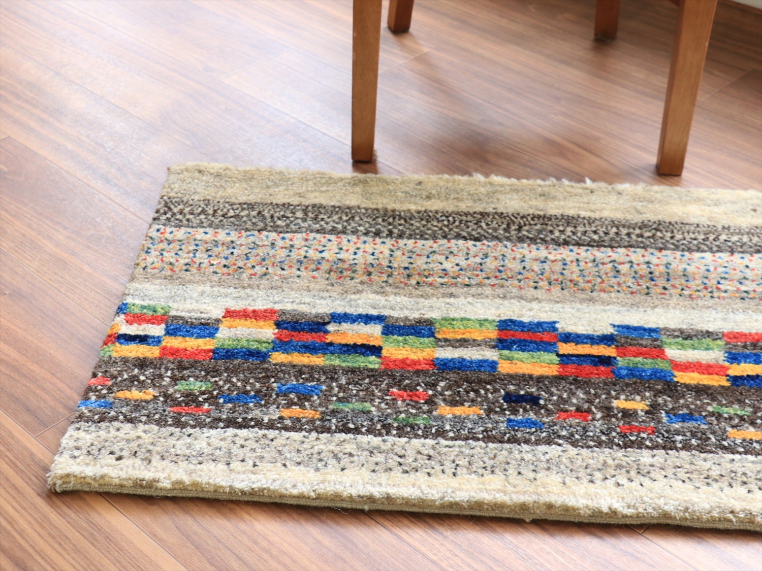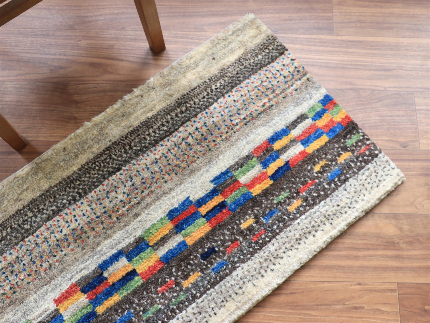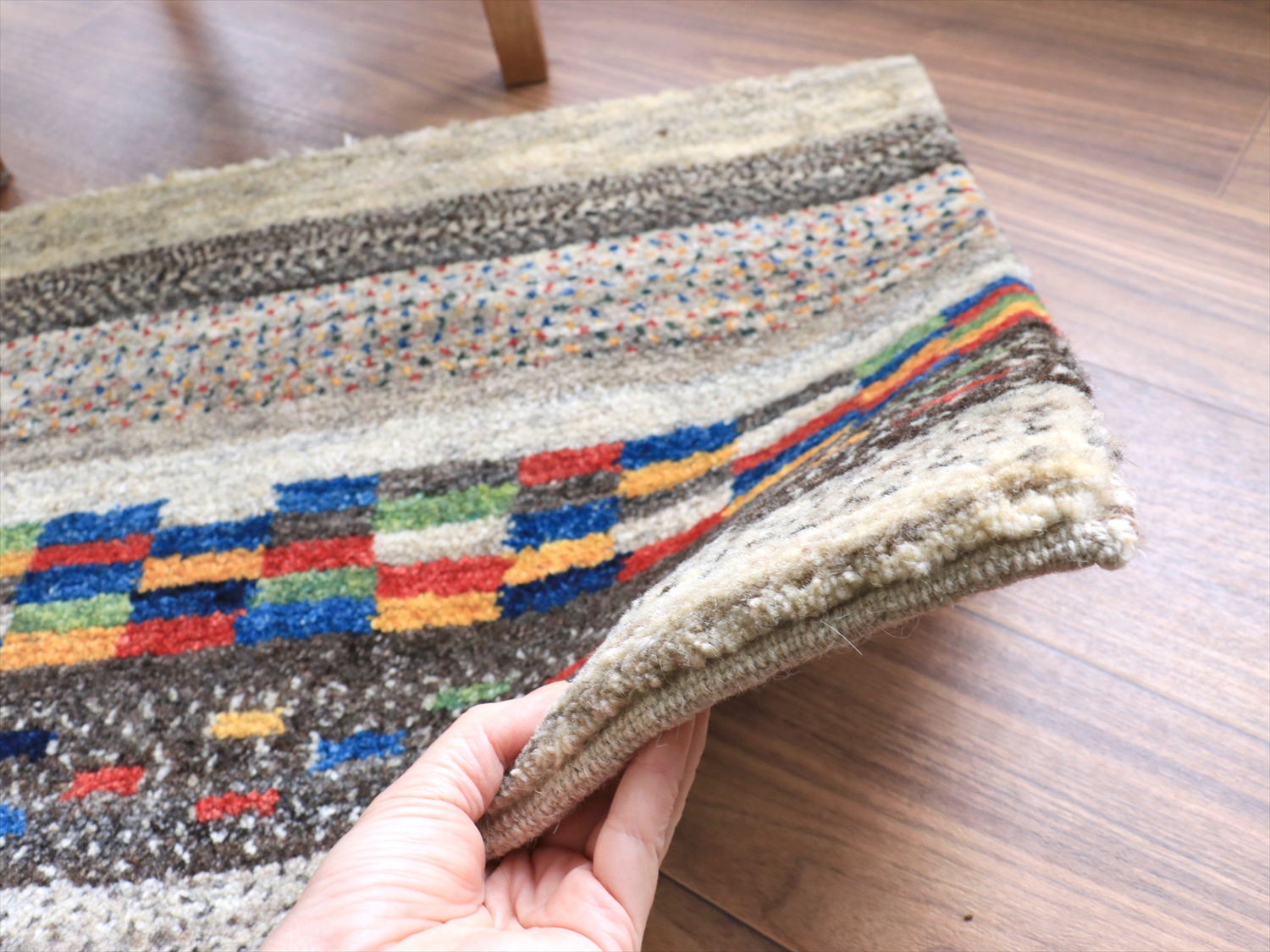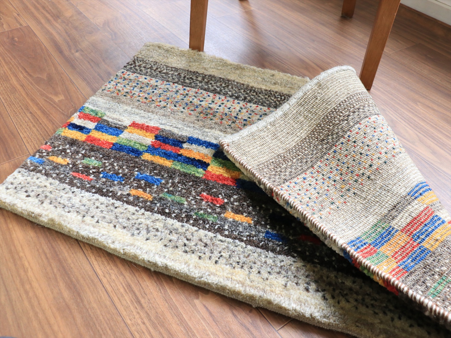 縦のストライプは珍しいと思われたかもしれませんが、このギャッベは経糸の方向からみると、横に長いサイズです。経糸の房は丁寧に巻き込んであるので、お使いになるときには縦横どちらの方向でも気にせずにおいてください!