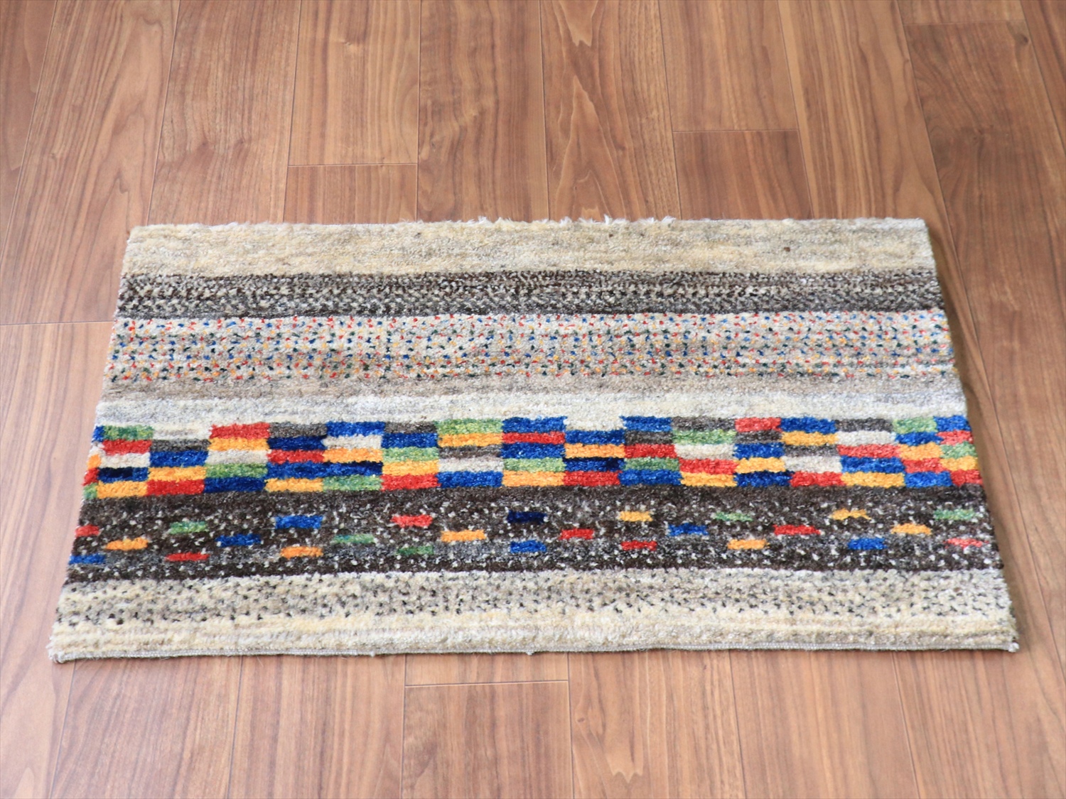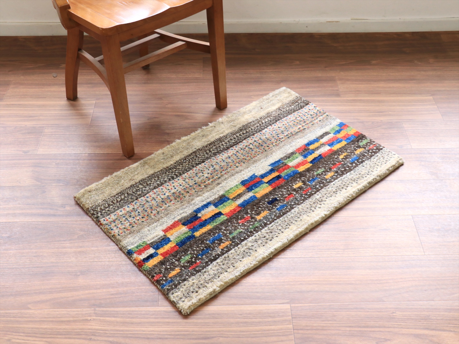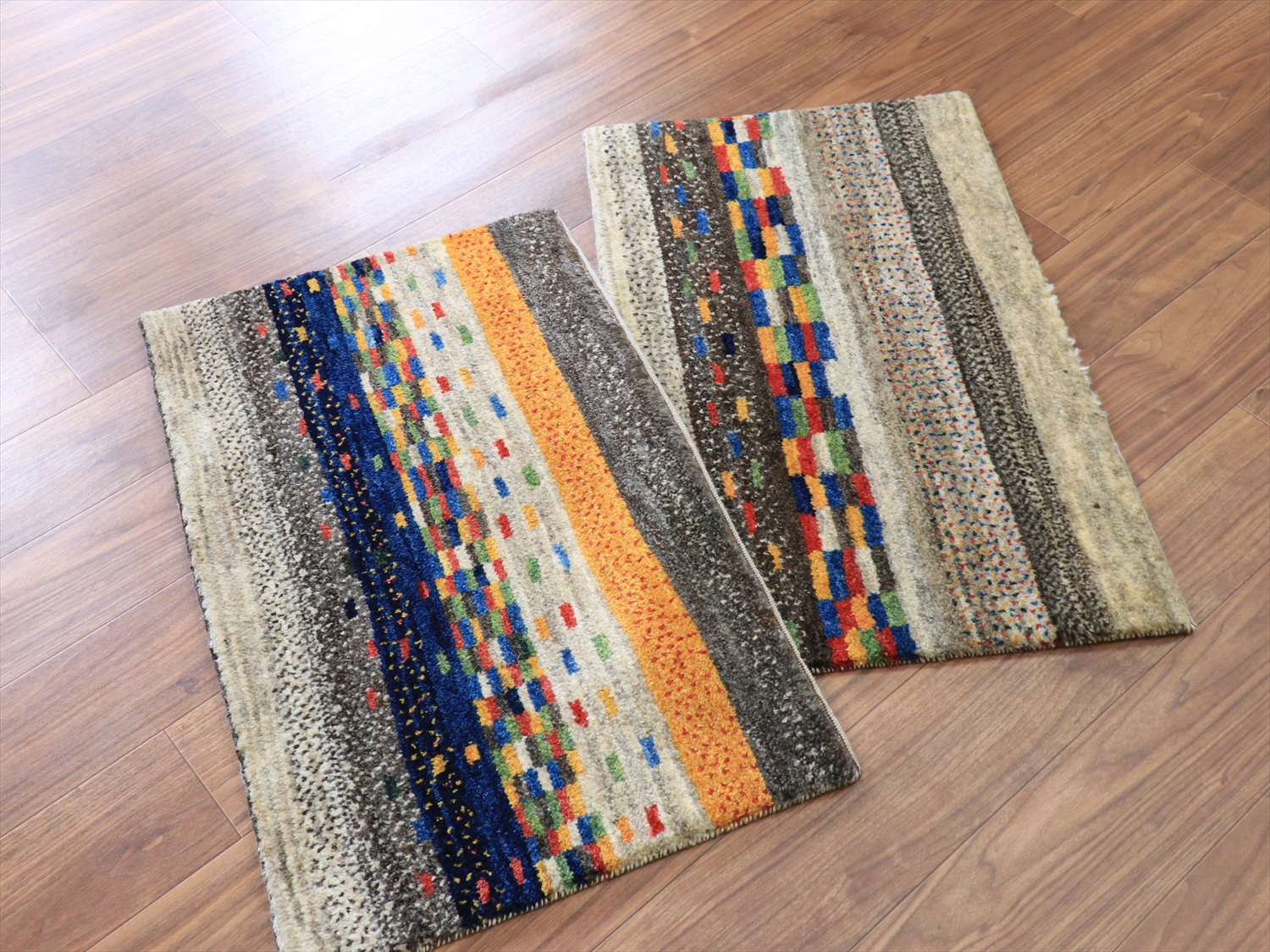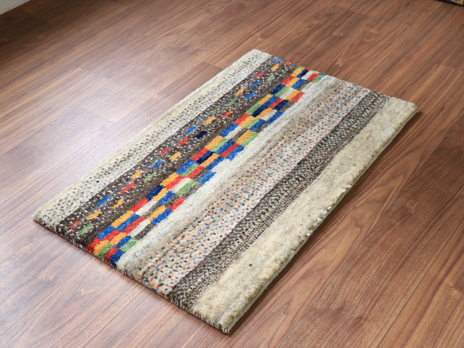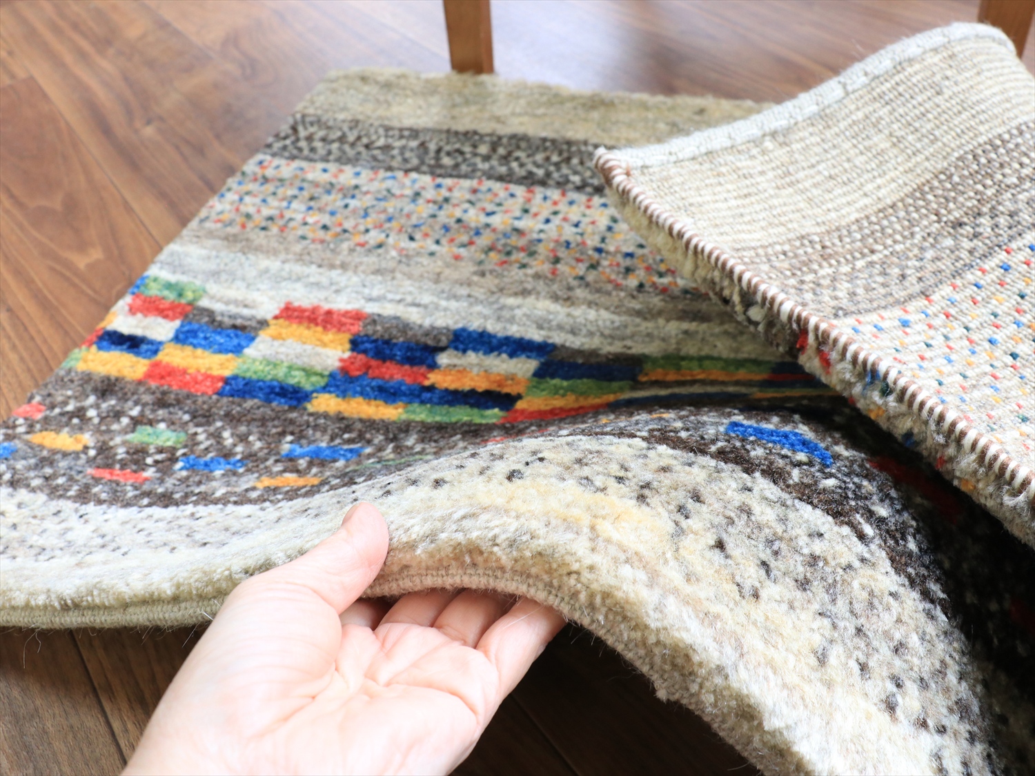 縦のストライプは珍しいと思われたかもしれませんが、このギャッベは経糸の方向からみると、横に長いサイズです。経糸の房は丁寧に巻き込んであるので、お使いになるときには縦横どちらの方向でも気にせずにおいてください!