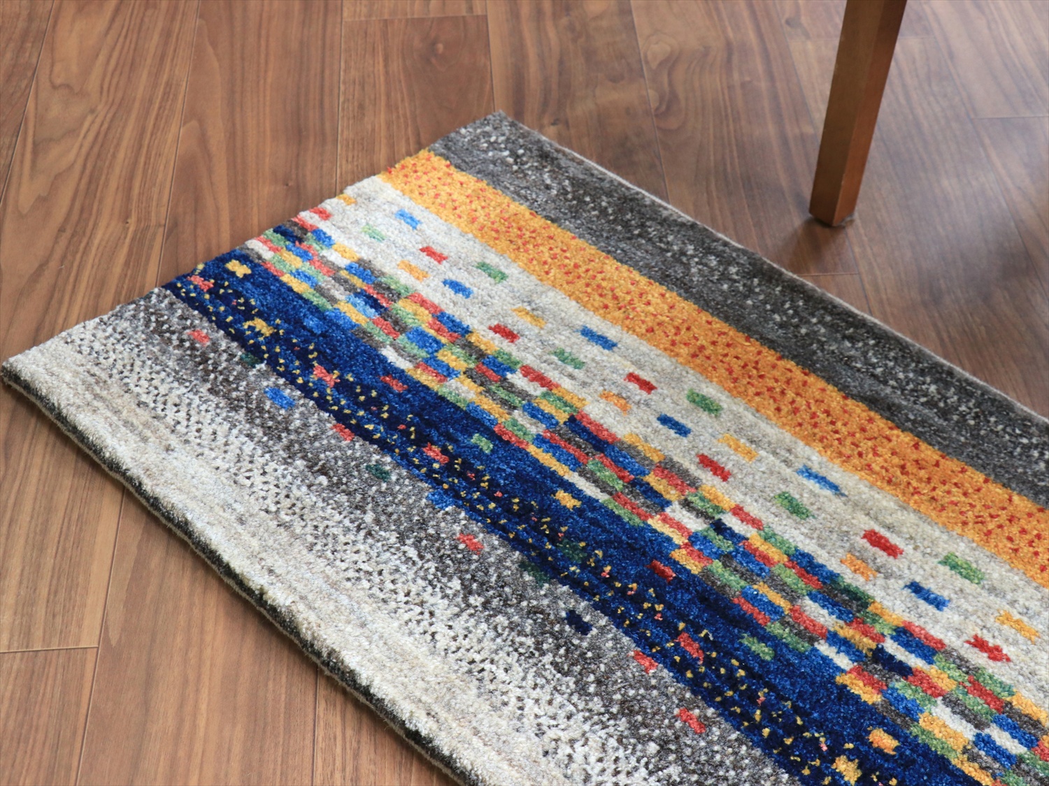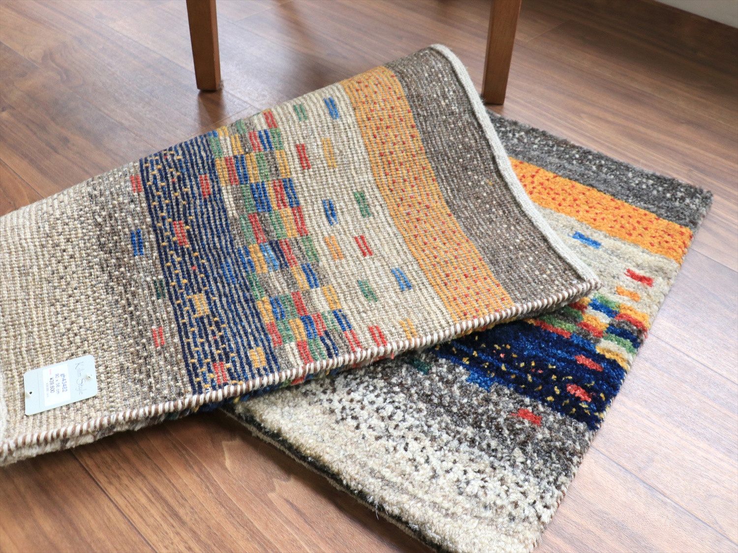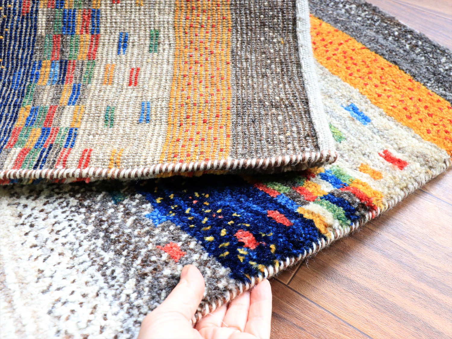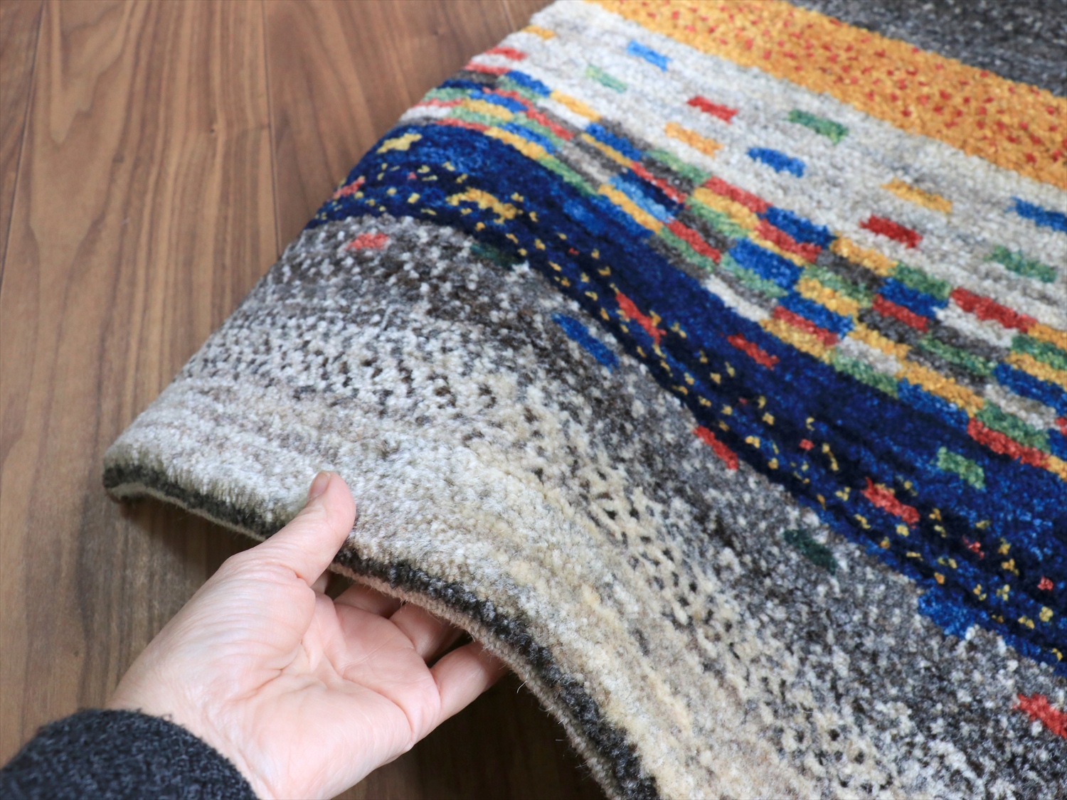 縦のストライプは珍しいと思われたかもしれませんが、このギャッベは経糸の方向からみると、横に長いサイズです。経糸の房は丁寧に巻き込んであるので、お使いになるときには縦横どちらの方向でも気にせずにおいてください!