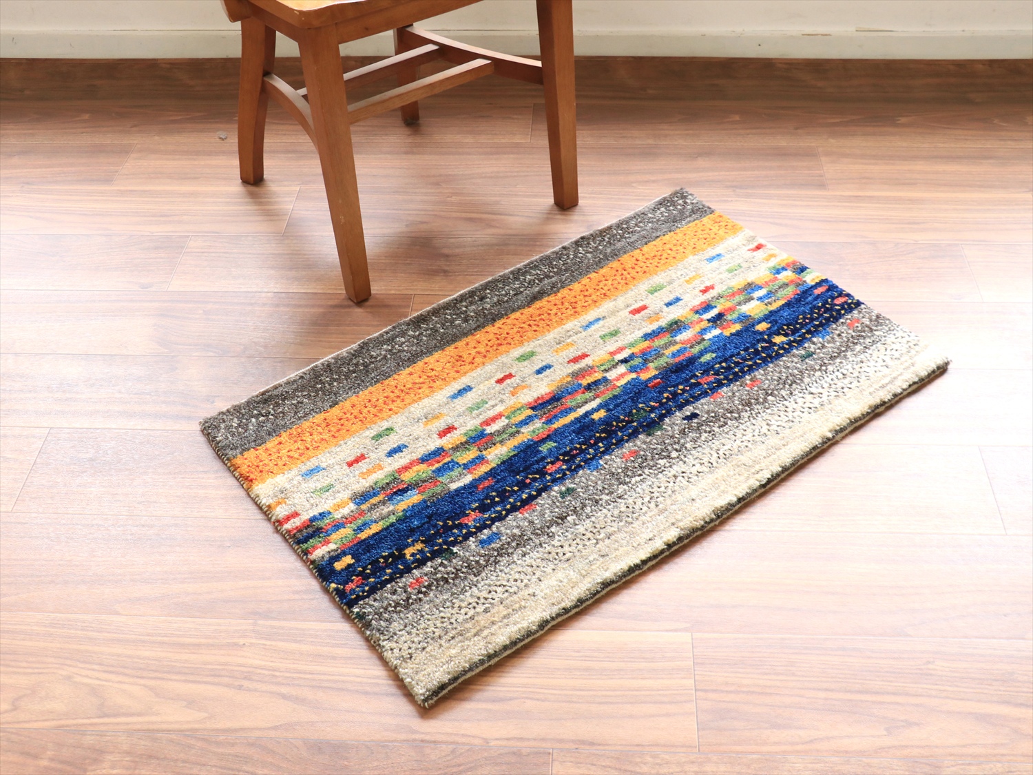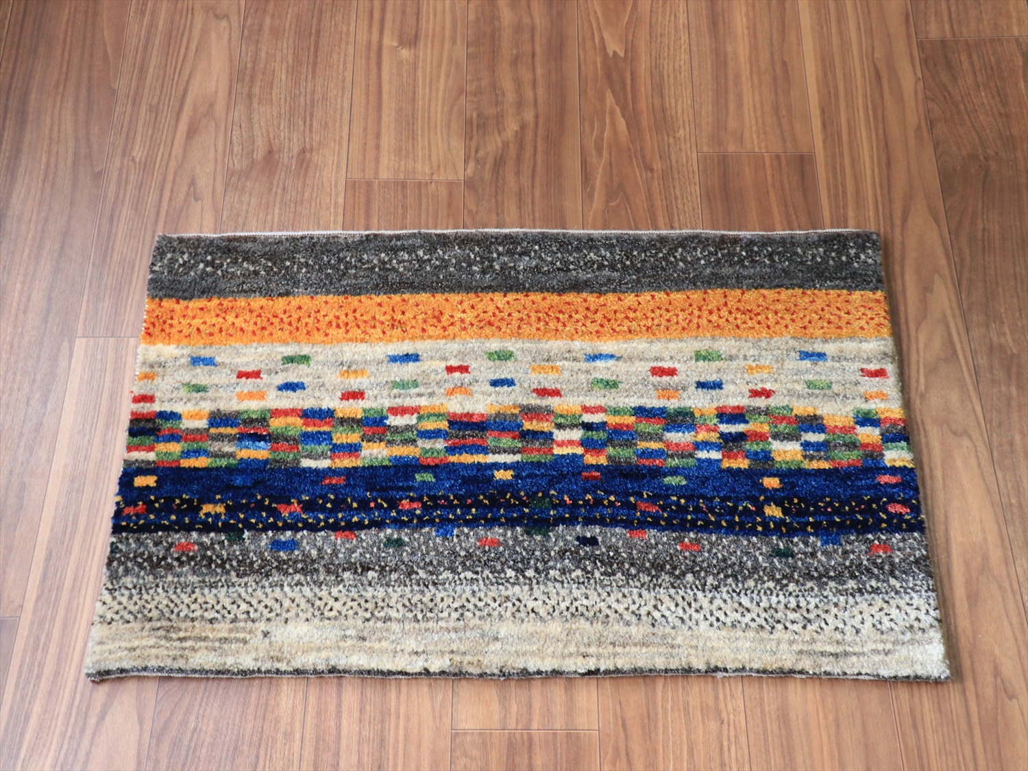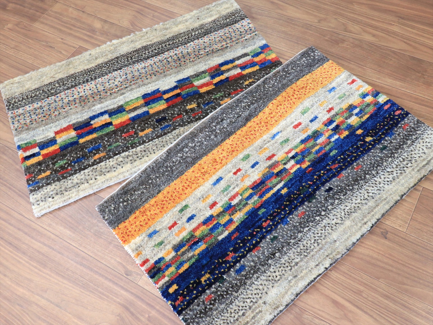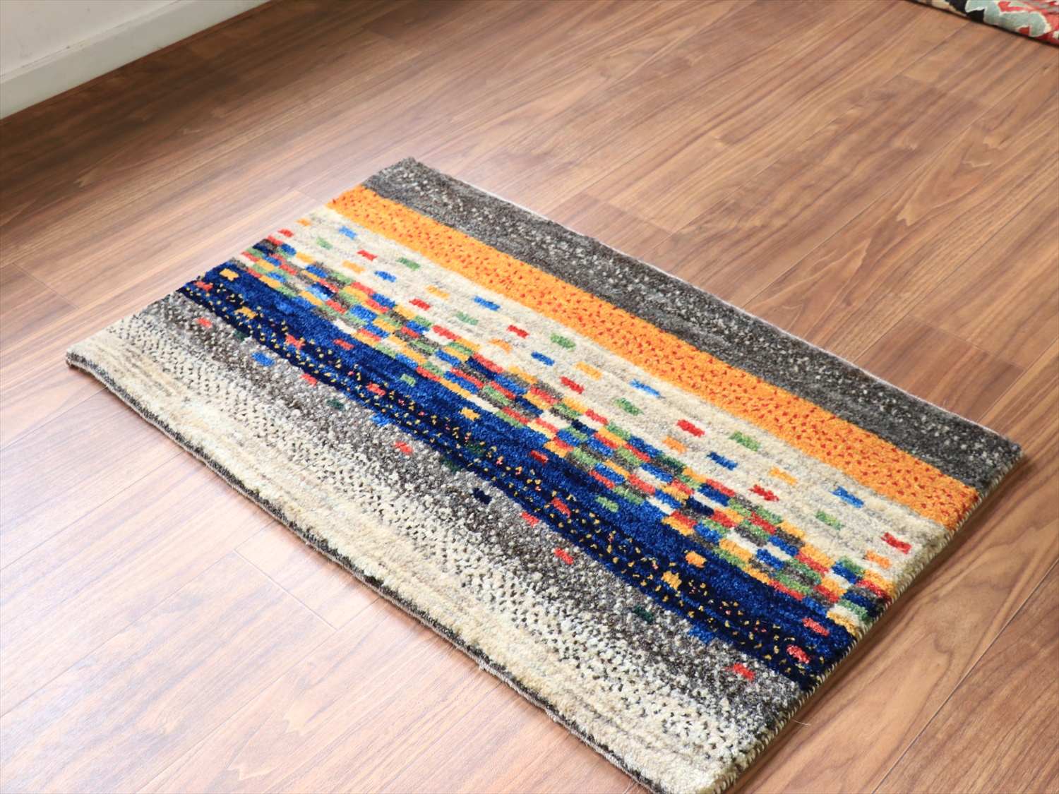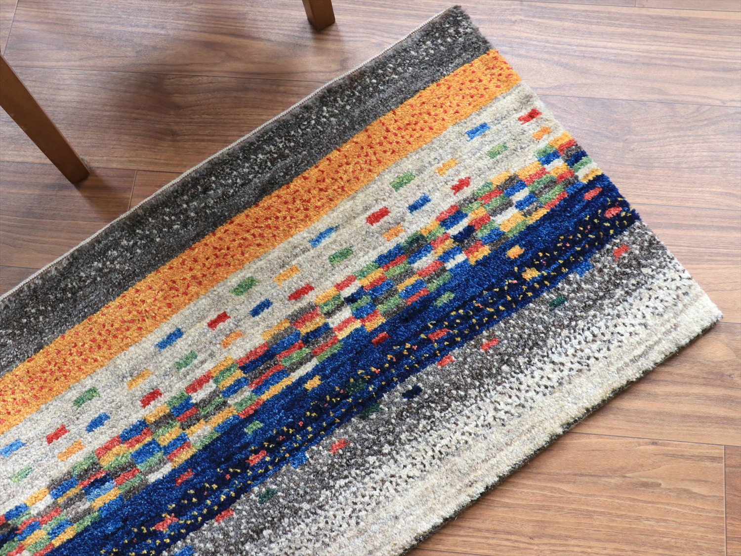 縦のストライプは珍しいと思われたかもしれませんが、このギャッベは経糸の方向からみると、横に長いサイズです。経糸の房は丁寧に巻き込んであるので、お使いになるときには縦横どちらの方向でも気にせずにおいてください!