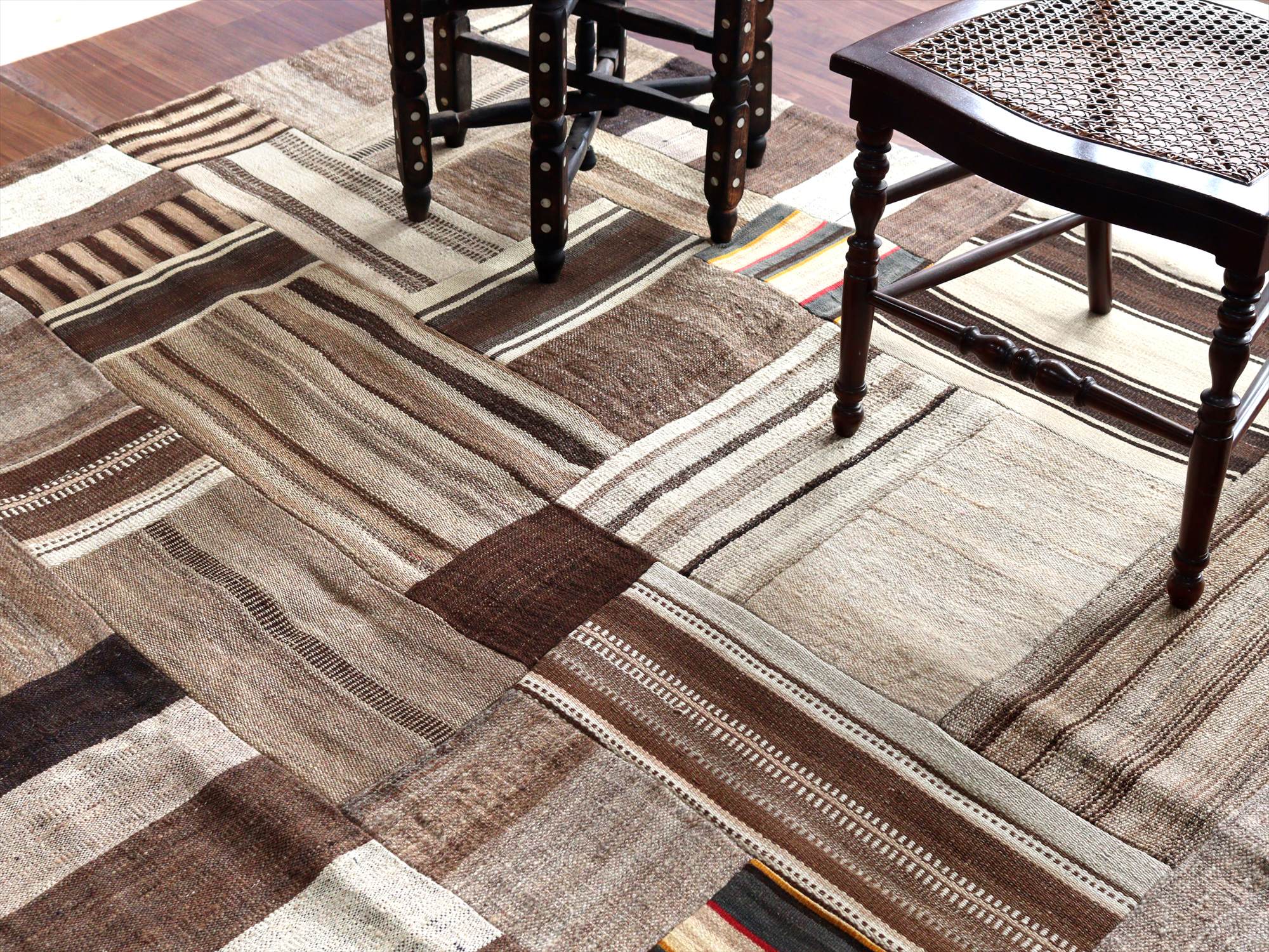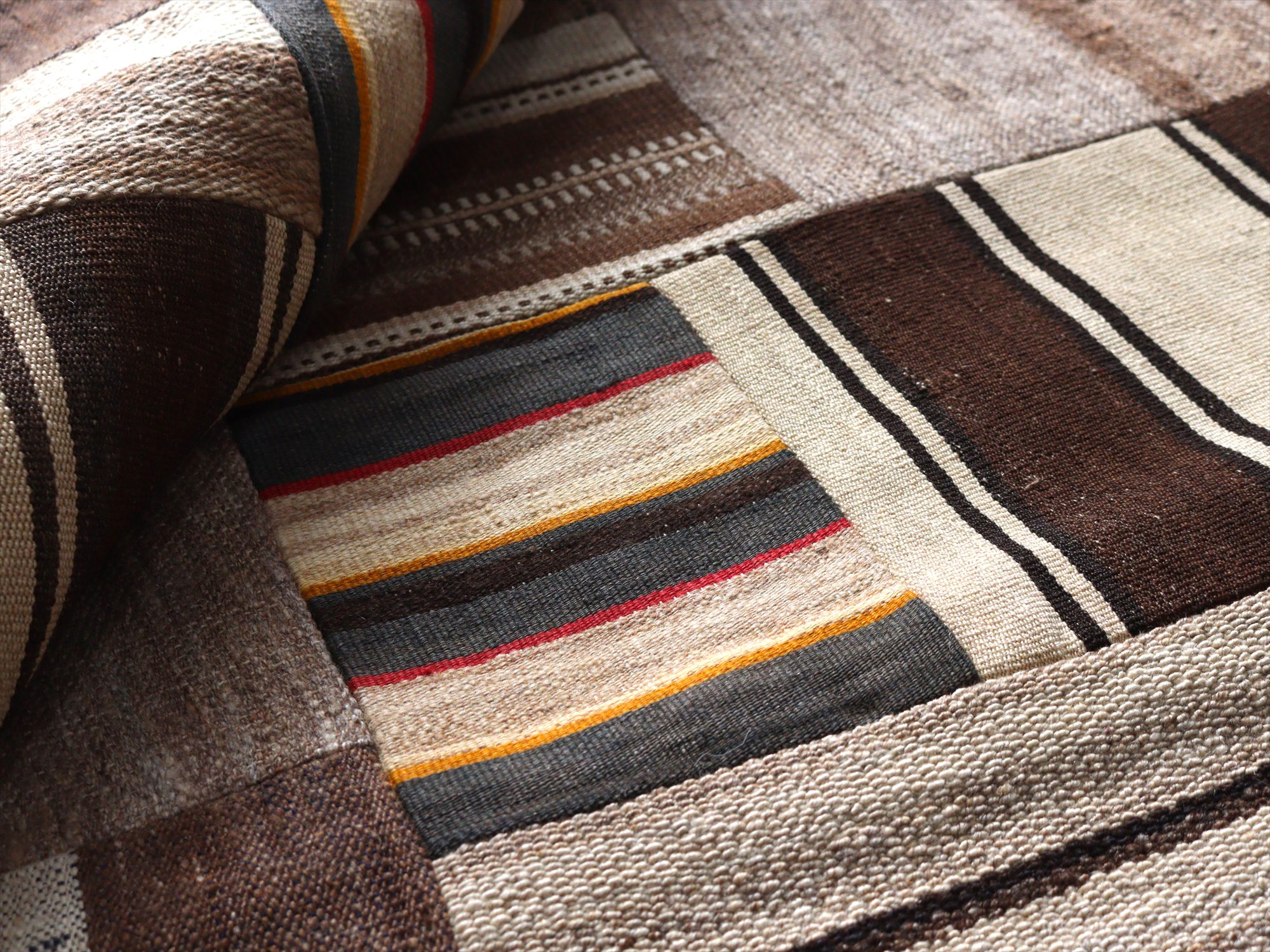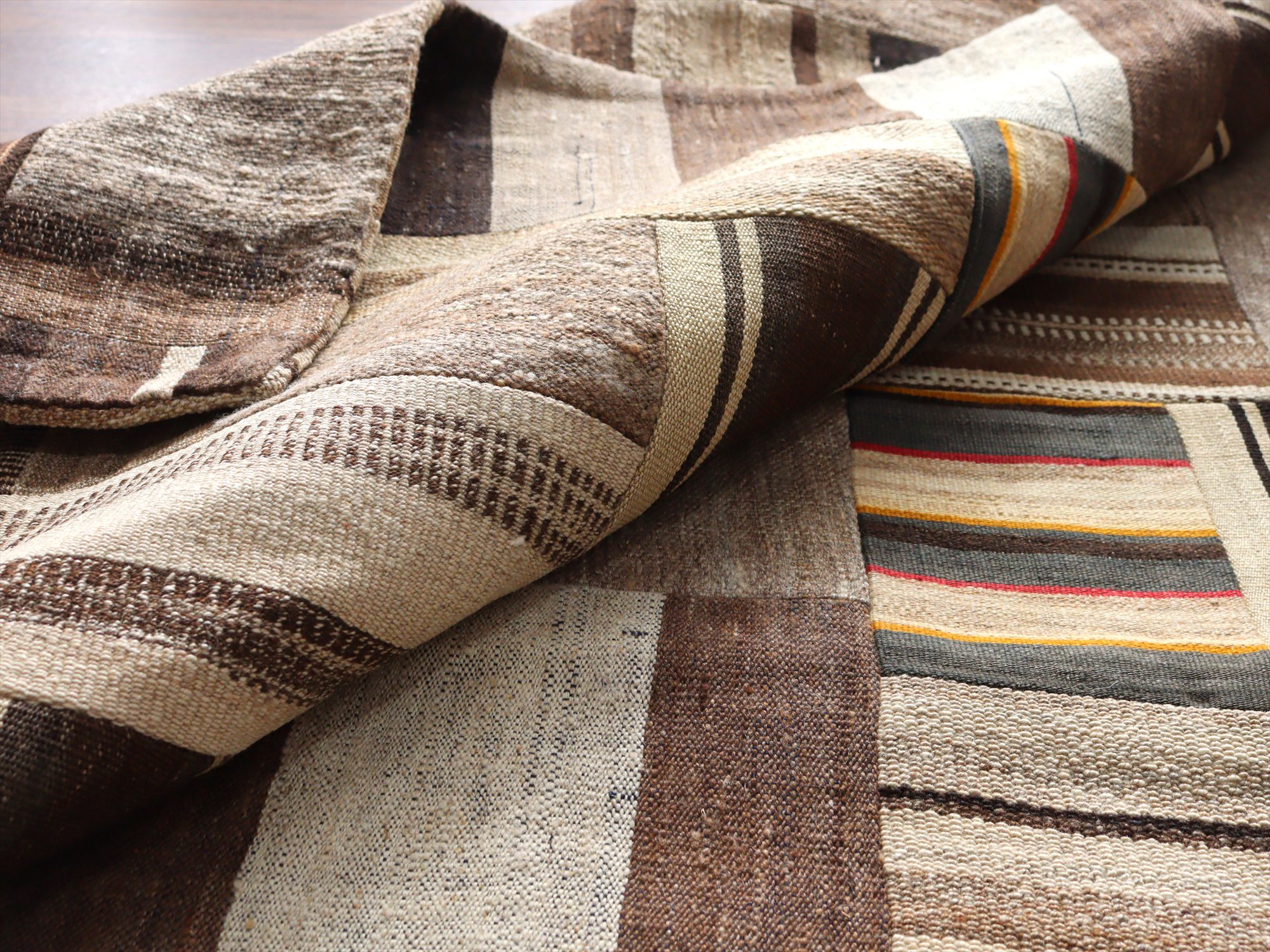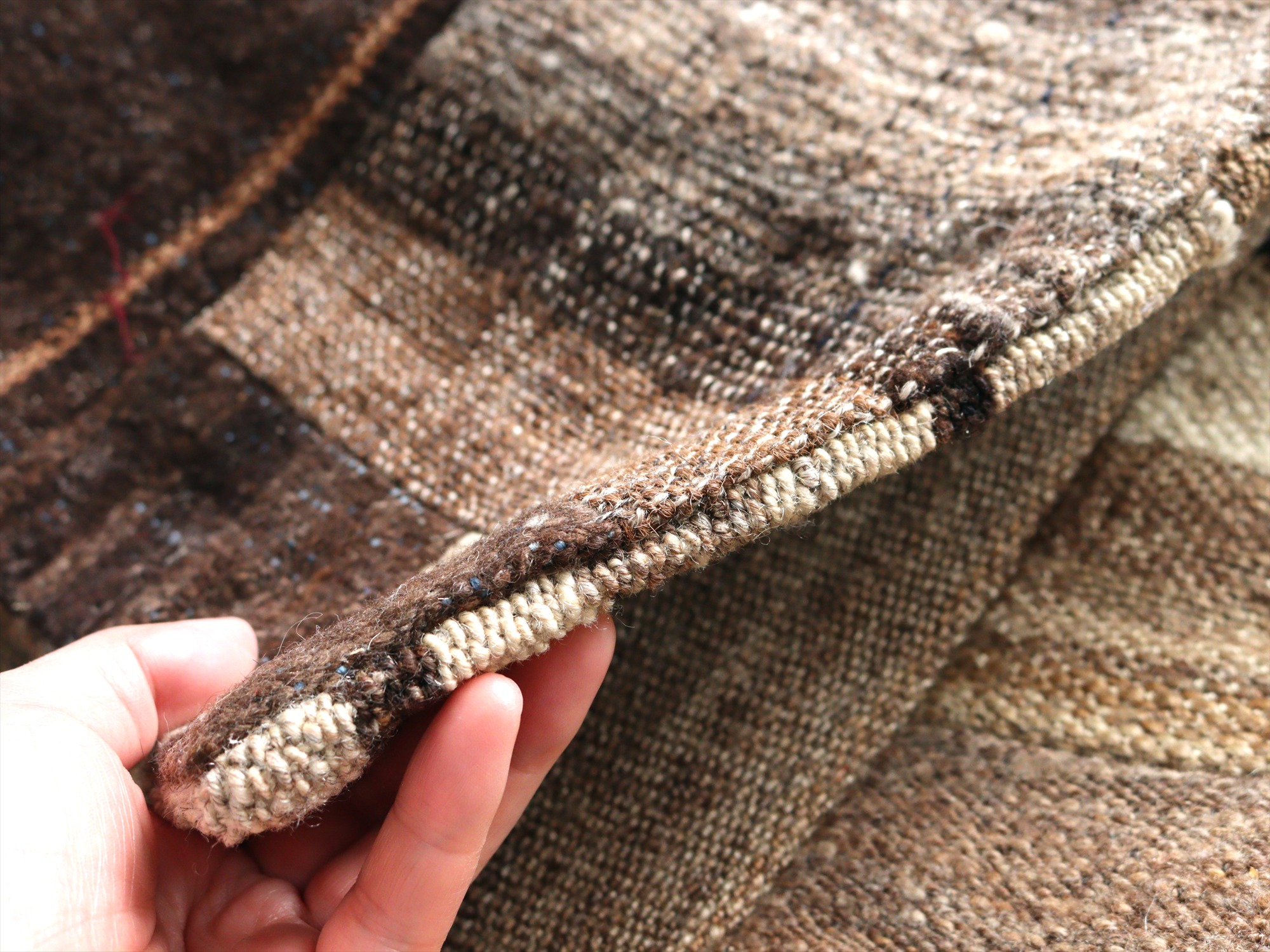 使われているキリムは薄手のものが選ばれ。縫い合わせ部分は、縫い代があるため厚みがあり、ラグの上を歩くと多少デコボコを感じます。オールドですので、使われていたときの名残で多少のシミなどがある場合がございますことをご了承願います。