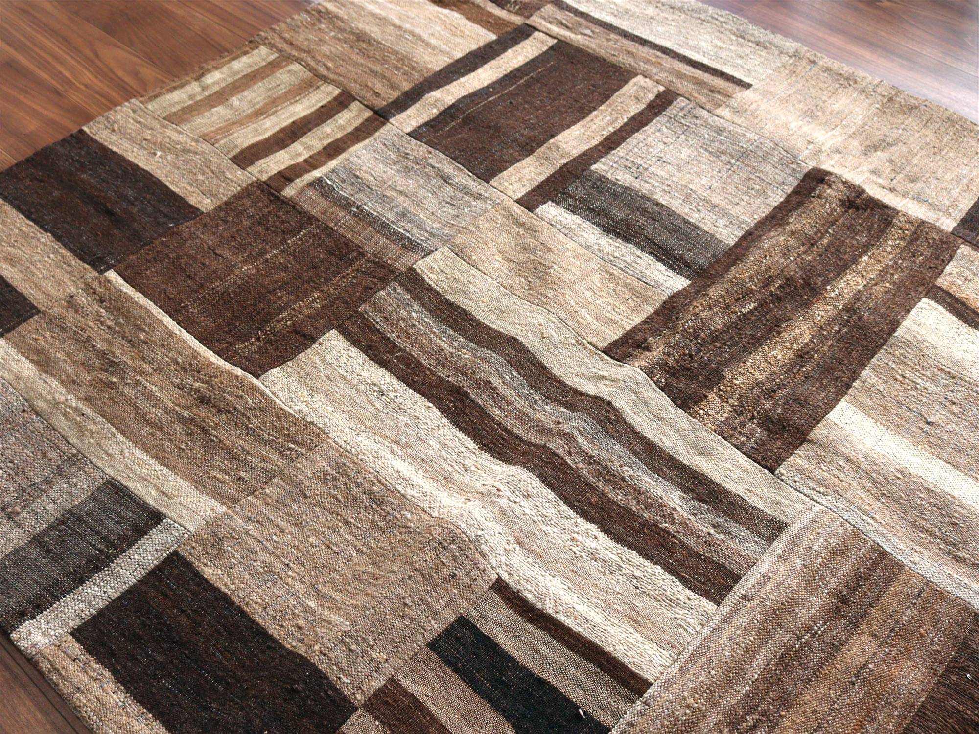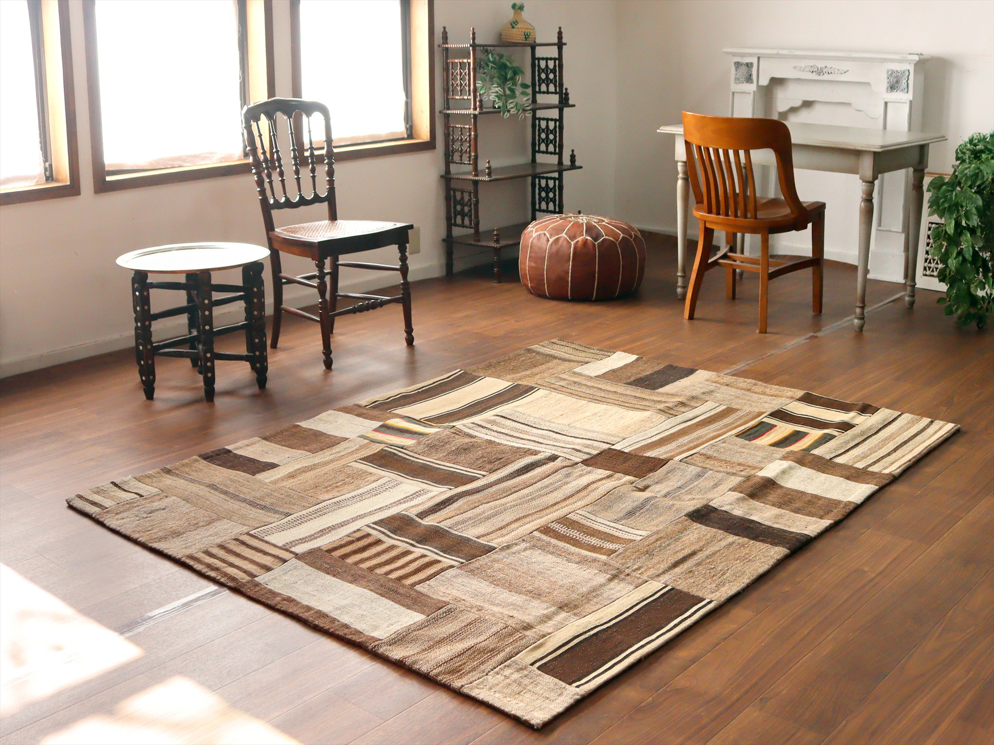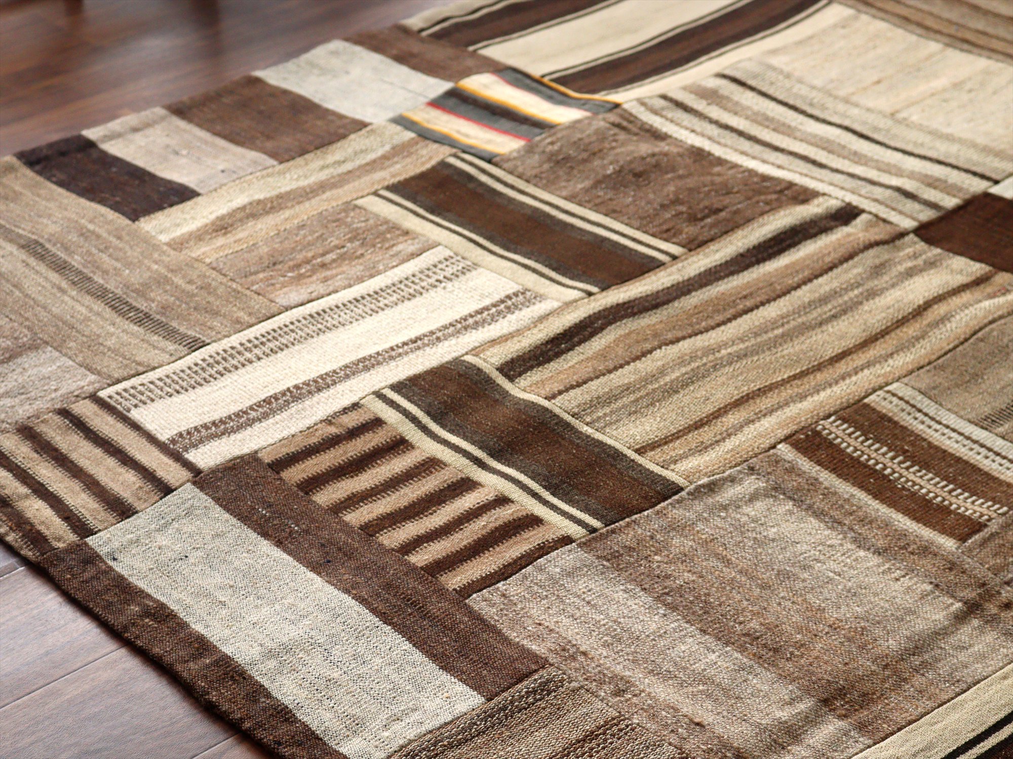 使われているキリムは薄手のものが選ばれ。縫い合わせ部分は、縫い代があるため厚みがあり、ラグの上を歩くと多少デコボコを感じます。オールドですので、使われていたときの名残で多少のシミなどがある場合がございますことをご了承願います。
