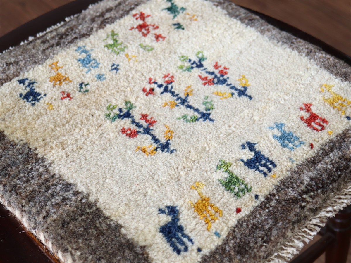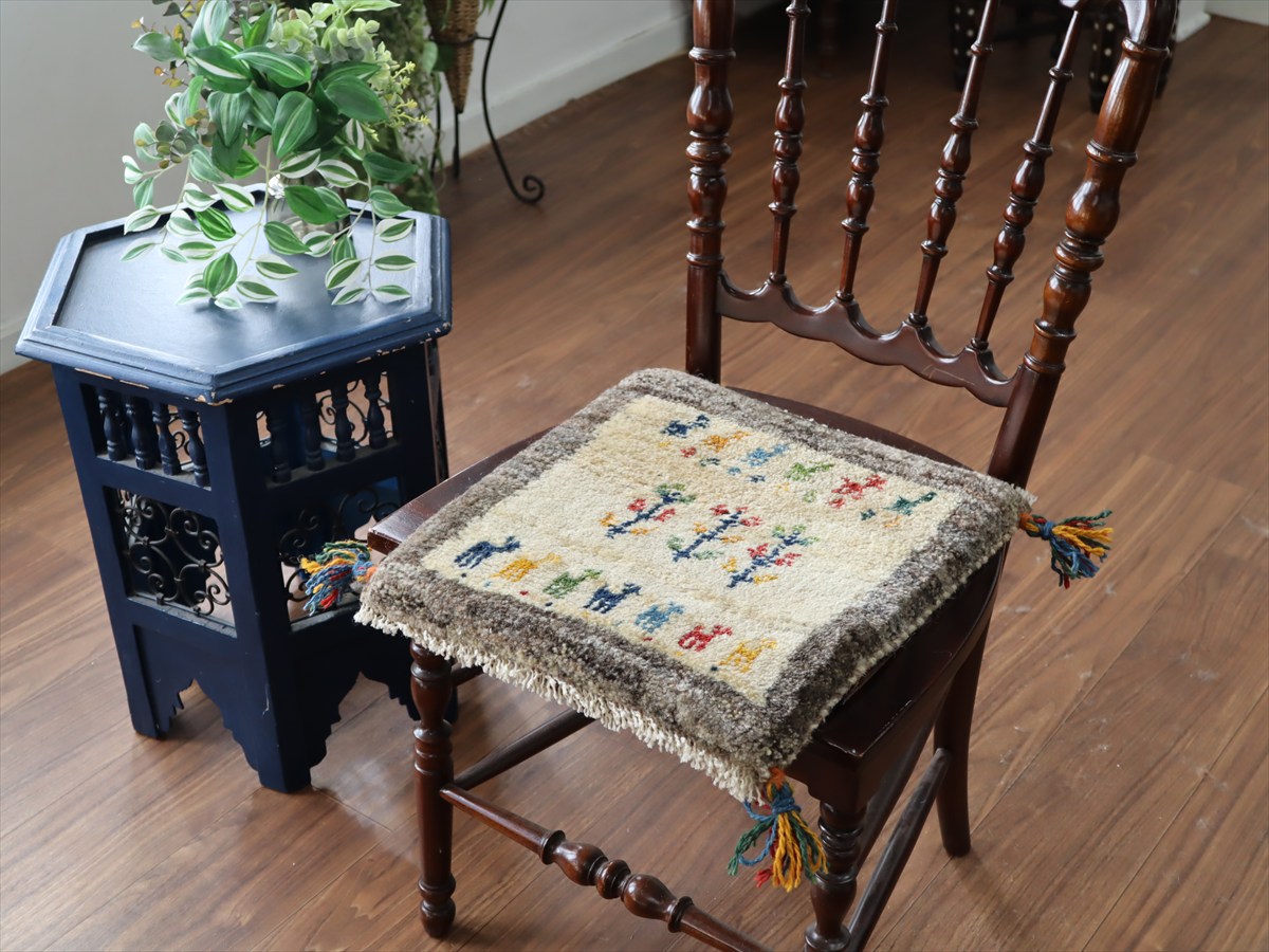 何枚も集めたくなる、40cm角の座布団サイズギャベ。四隅に大きなポンポンのついた、伝統的なスタイルで織られています。フローリングに並べて座布団がわりに使ったり、ベンチやダイニングチェアの座面など、使い方はいろいろ。壁にタペストリーのように飾るのもおすすめです。