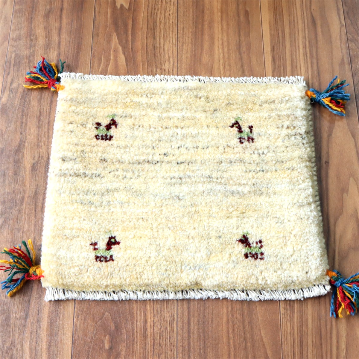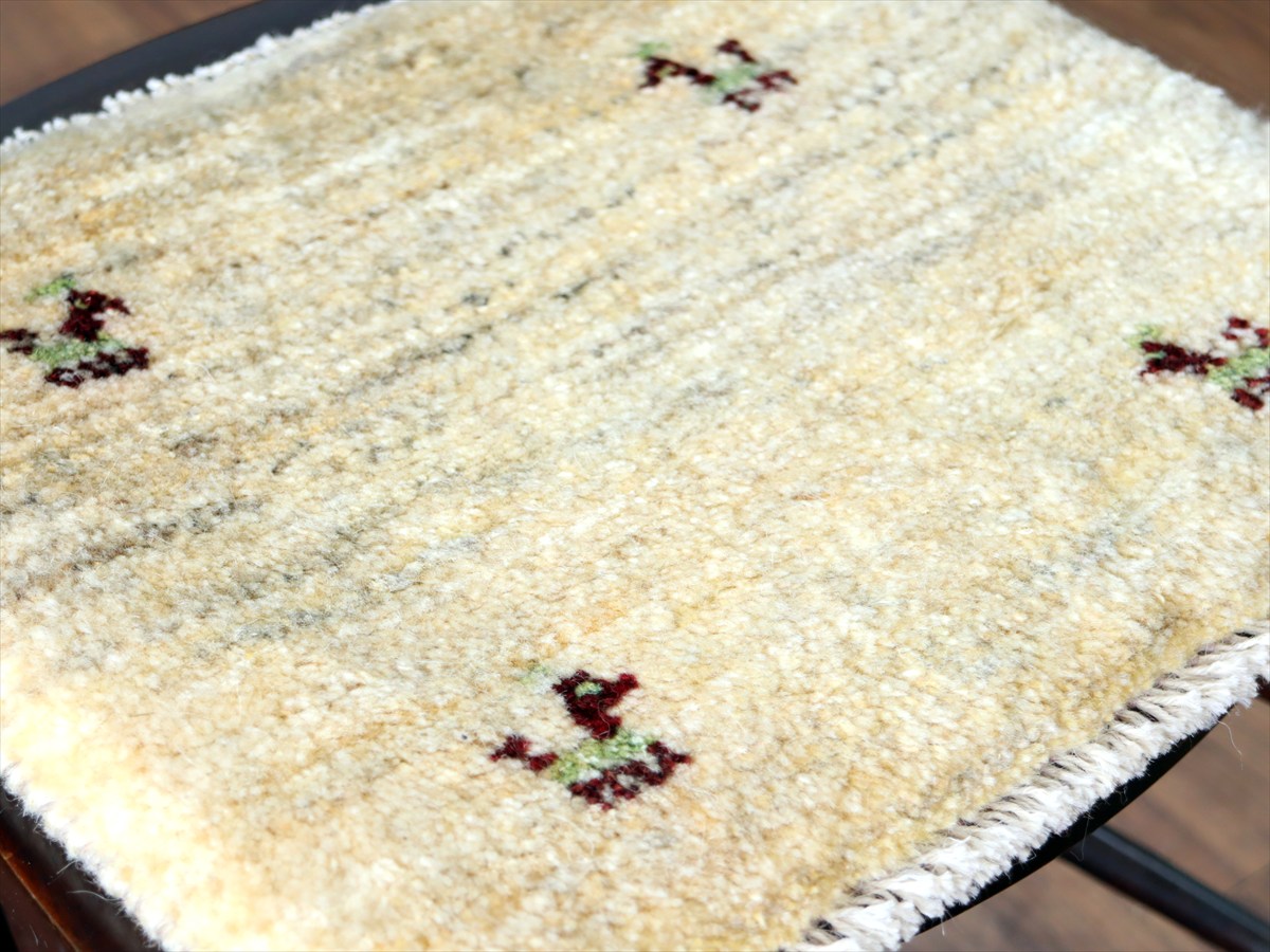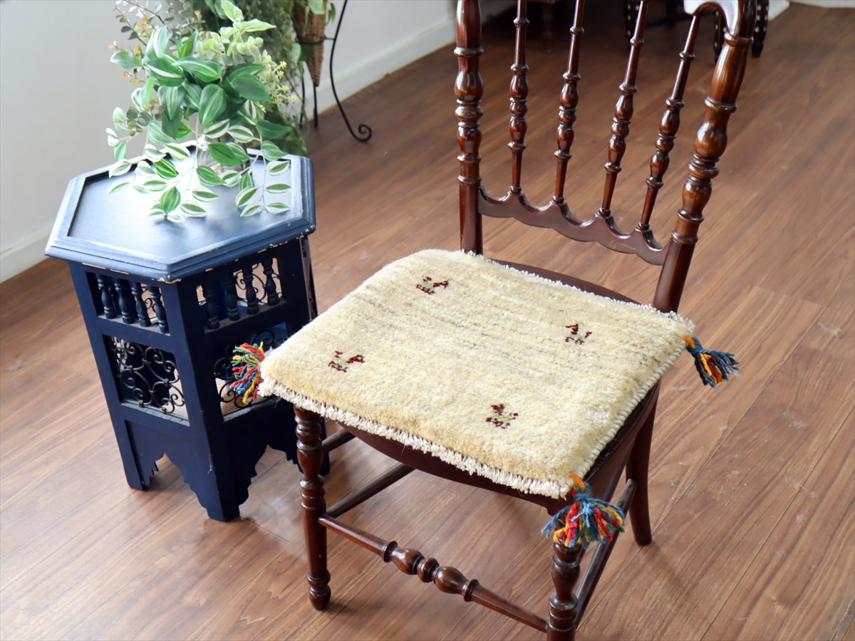 何枚も集めたくなる、40cm角の座布団サイズギャベ。四隅に大きなポンポンのついた、伝統的なスタイルで織られています。フローリングに並べて座布団がわりに使ったり、ベンチやダイニングチェアの座面など、使い方はいろいろ。壁にタペストリーのように飾るのもおすすめです。