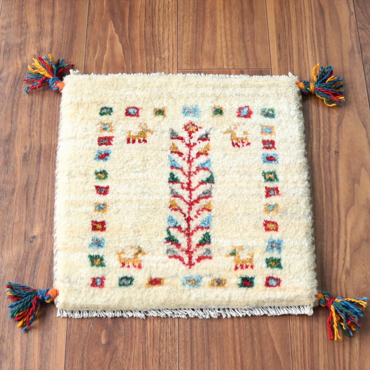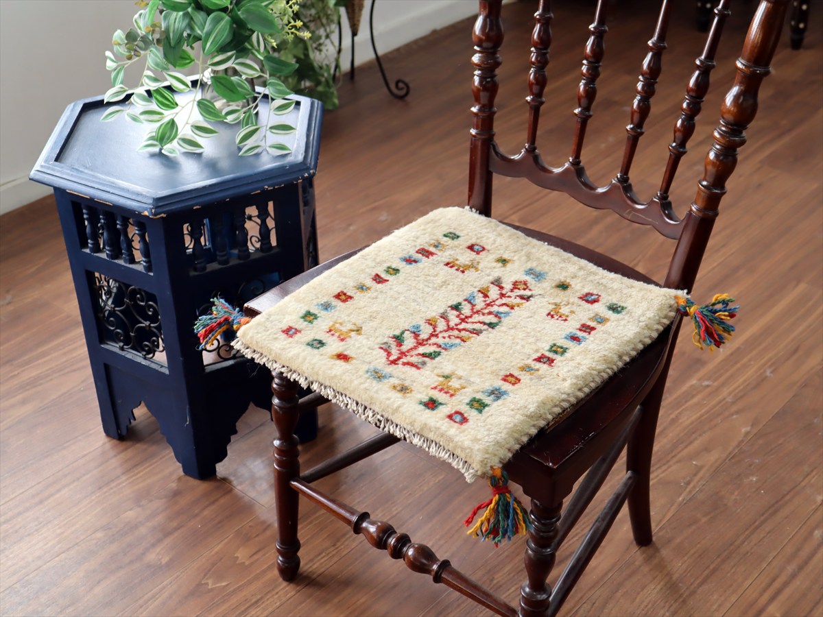 何枚も集めたくなる、40cm角の座布団サイズギャベ。四隅に大きなポンポンのついた、伝統的なスタイルで織られています。フローリングに並べて座布団がわりに使ったり、ベンチやダイニングチェアの座面など、使い方はいろいろ。壁にタペストリーのように飾るのもおすすめです。