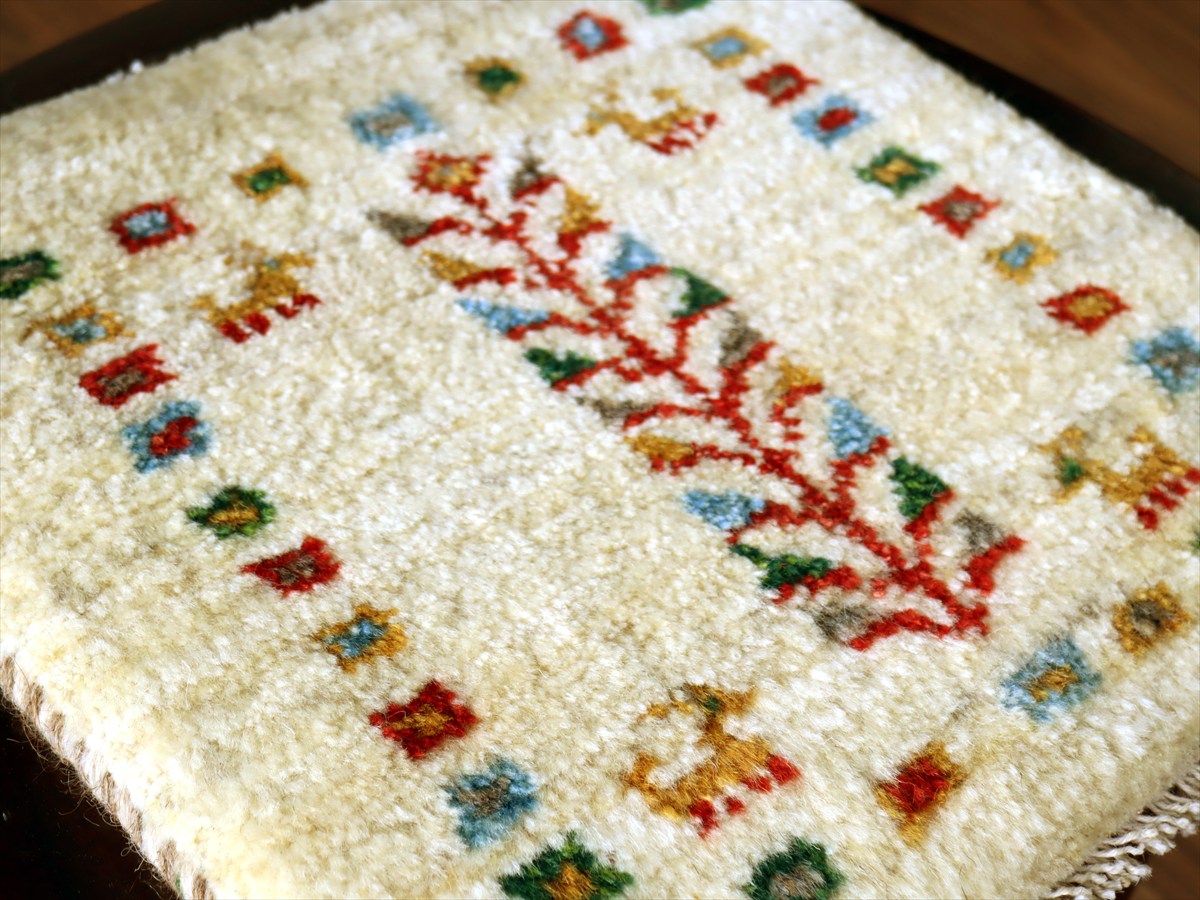 座布団サイズのギャッベとしては、すっきりとした毛足の刈り込みで、モチーフがくっきりと見えます。パイルを含めたギャベの厚みは、1.7-1.8cm程度です。