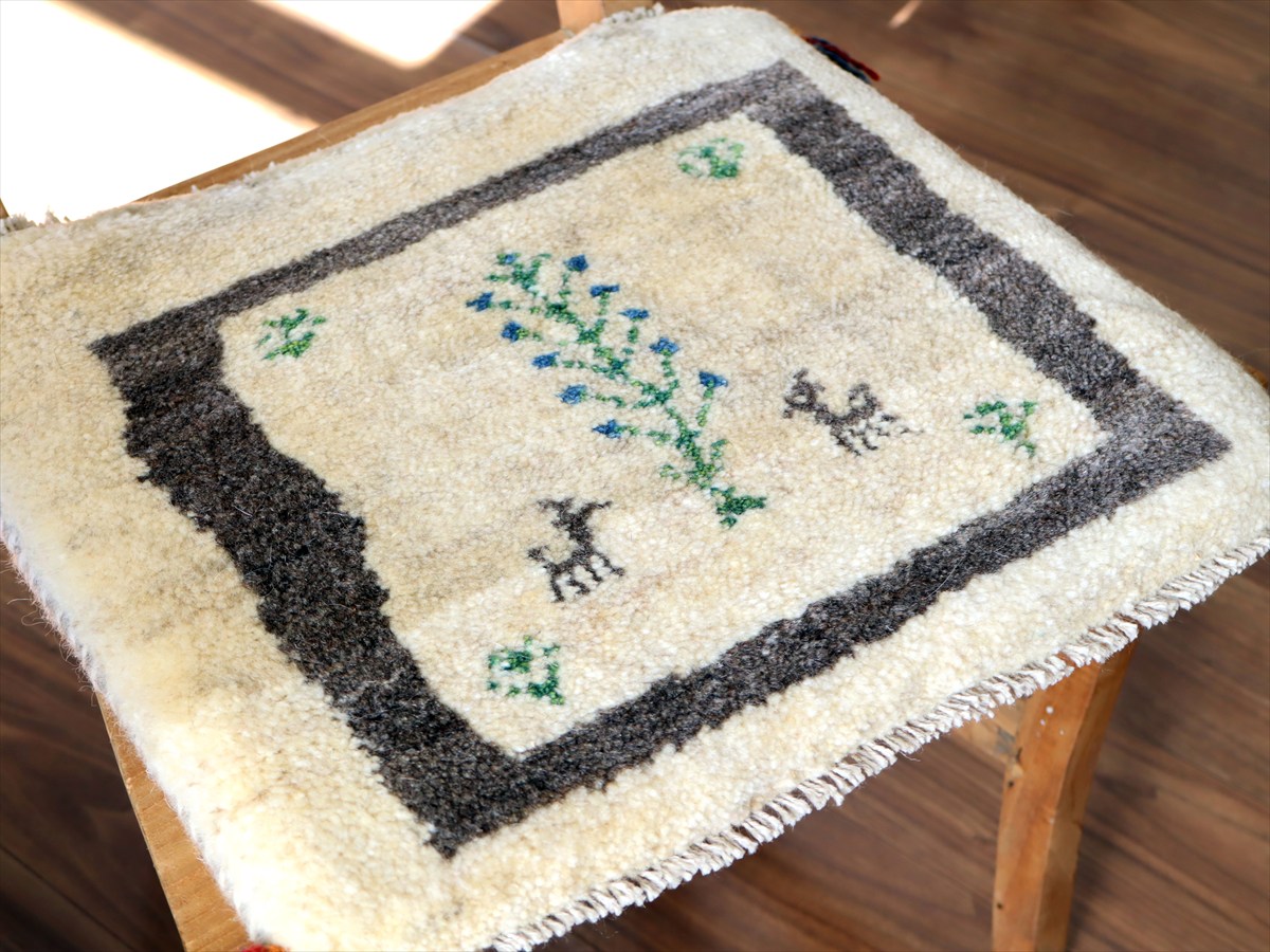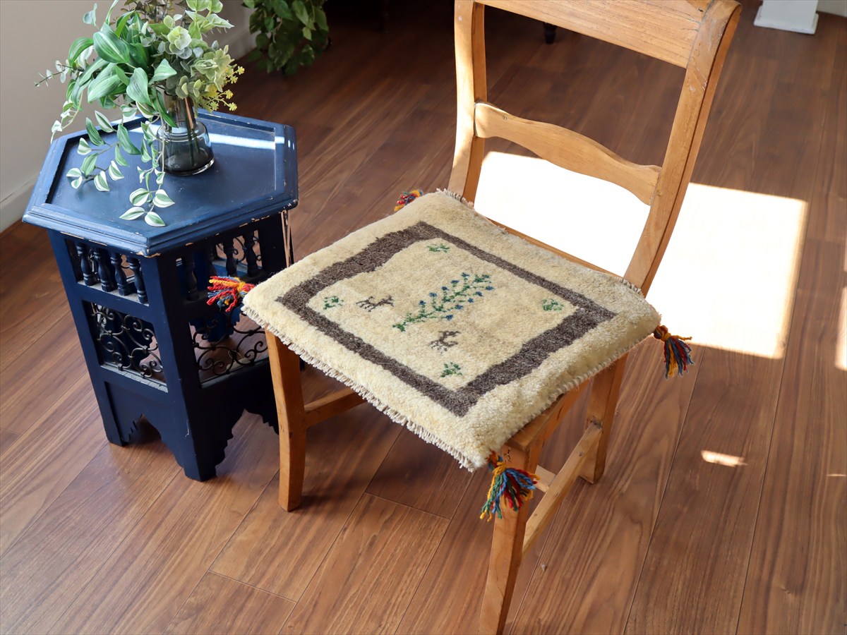 何枚も集めたくなる、40cm角の座布団サイズギャベ。四隅に大きなポンポンのついた、伝統的なスタイルで織られています。フローリングに並べて座布団がわりに使ったり、ベンチやダイニングチェアの座面など、使い方はいろいろ。壁にタペストリーのように飾るのもおすすめです。