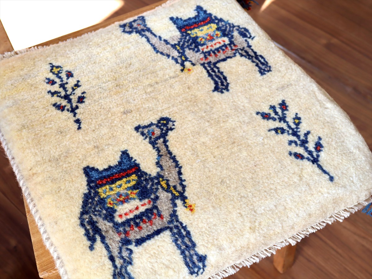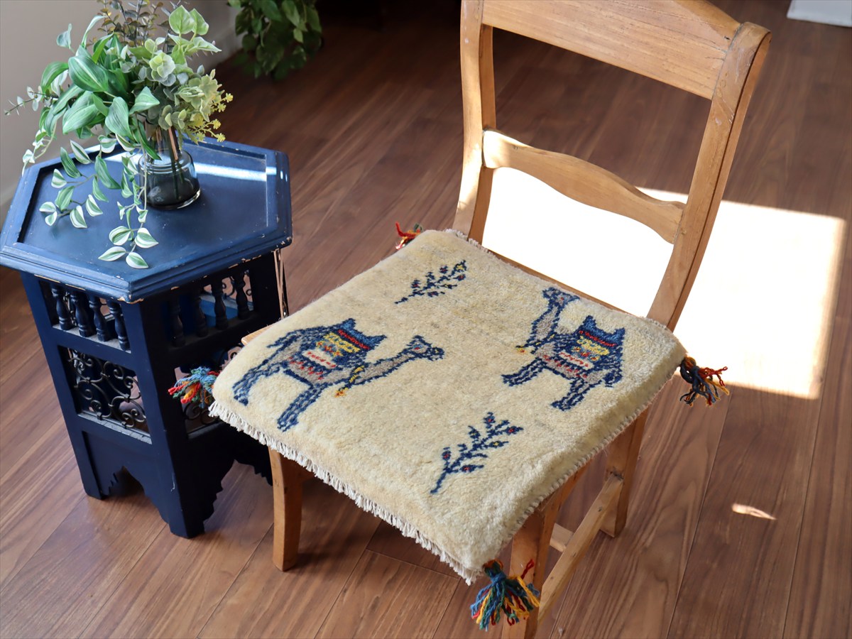 何枚も集めたくなる、40cm角の座布団サイズギャベ。四隅に大きなポンポンのついた、伝統的なスタイルで織られています。フローリングに並べて座布団がわりに使ったり、ベンチやダイニングチェアの座面など、使い方はいろいろ。壁にタペストリーのように飾るのもおすすめです。