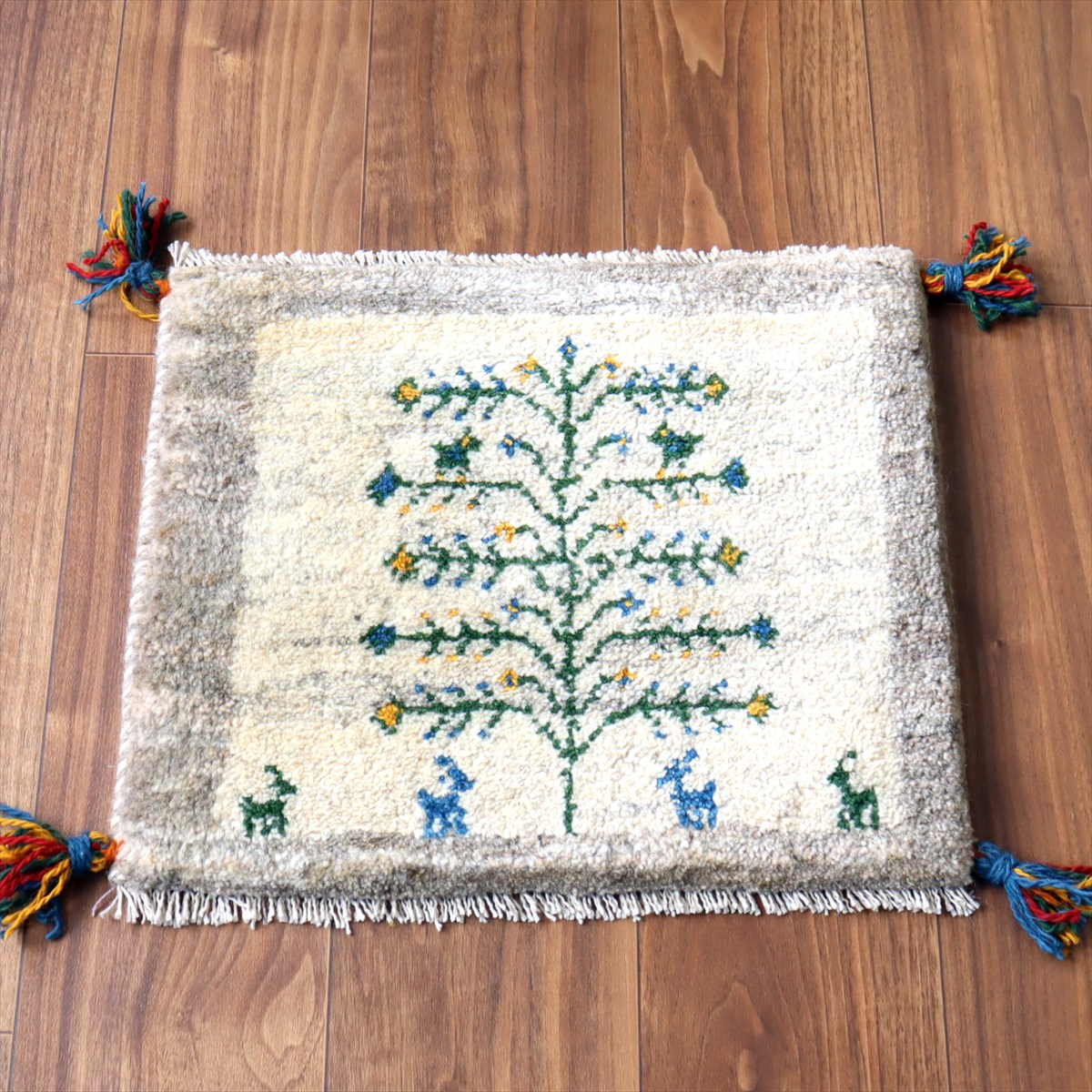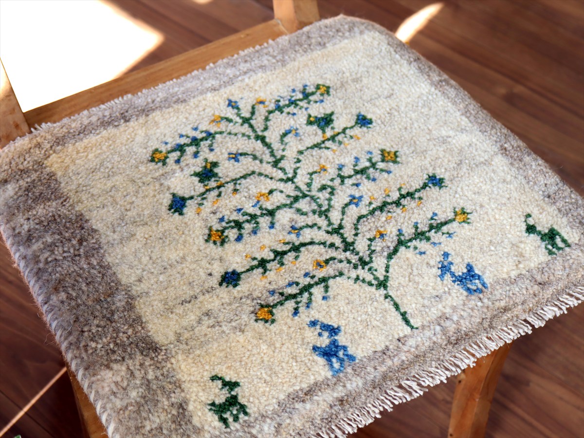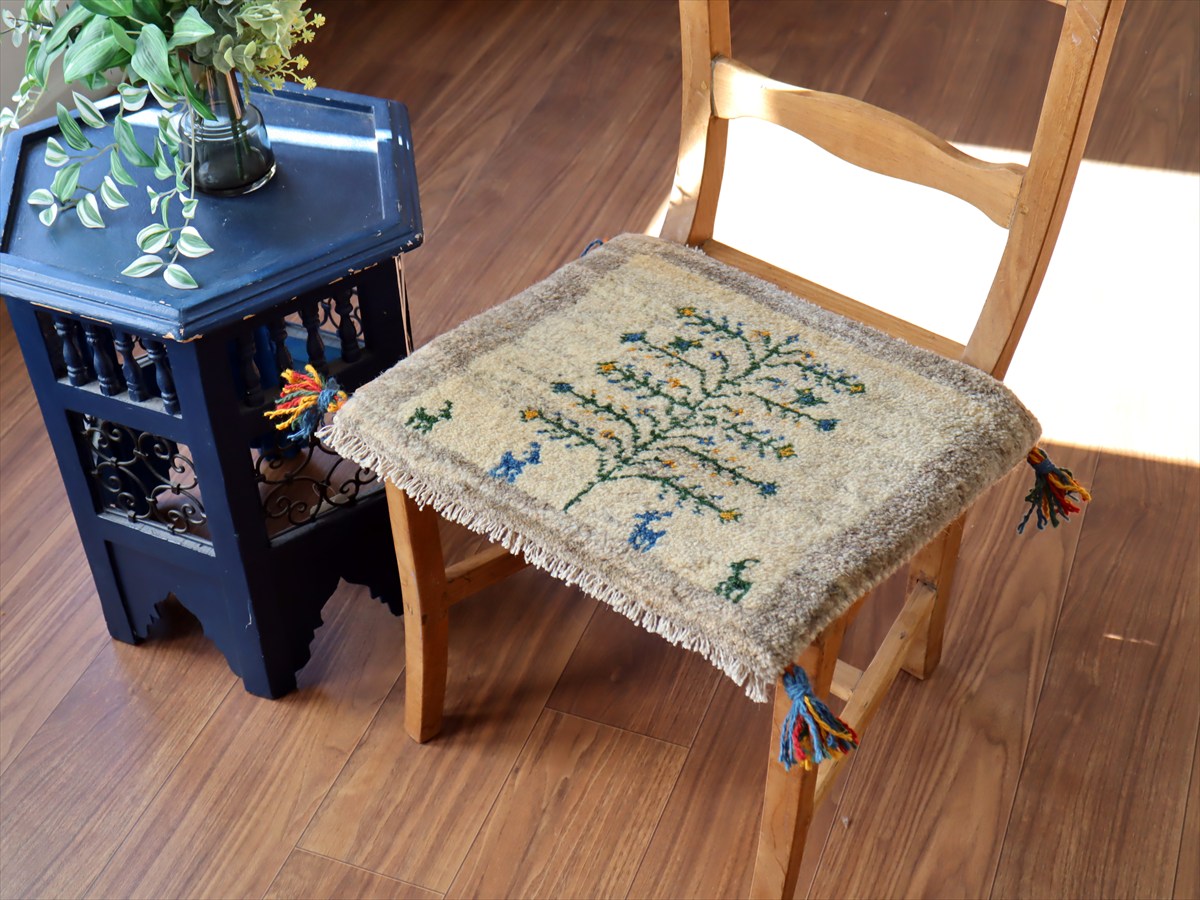 何枚も集めたくなる、40cm角の座布団サイズギャベ。四隅に大きなポンポンのついた、伝統的なスタイルで織られています。フローリングに並べて座布団がわりに使ったり、ベンチやダイニングチェアの座面など、使い方はいろいろ。壁にタペストリーのように飾るのもおすすめです。