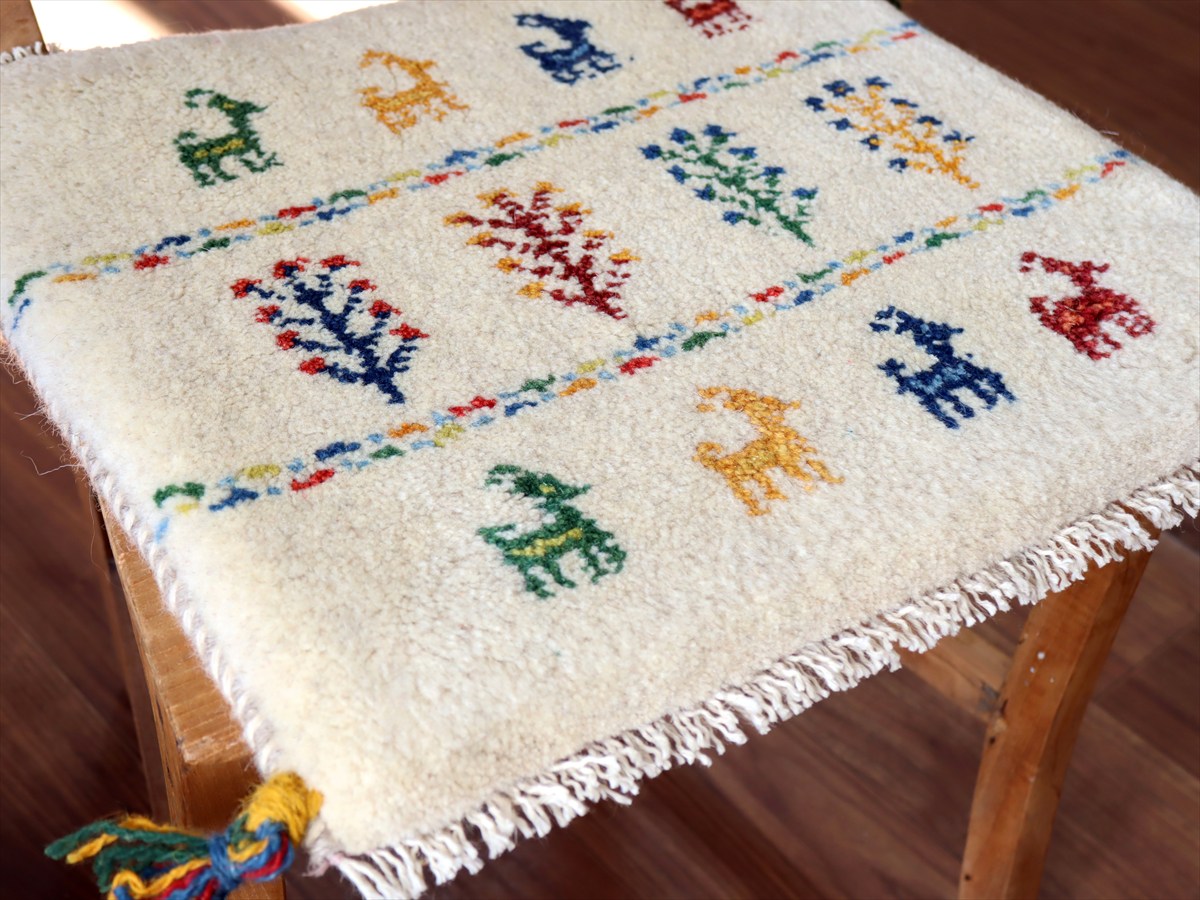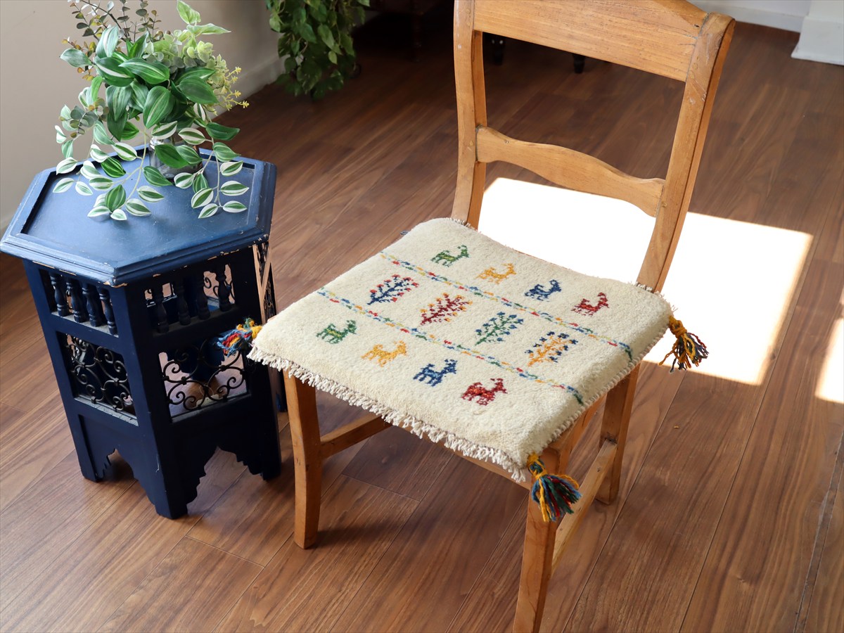 何枚も集めたくなる、40cm角の座布団サイズギャベ。四隅に大きなポンポンのついた、伝統的なスタイルで織られています。フローリングに並べて座布団がわりに使ったり、ベンチやダイニングチェアの座面など、使い方はいろいろ。壁にタペストリーのように飾るのもおすすめです。