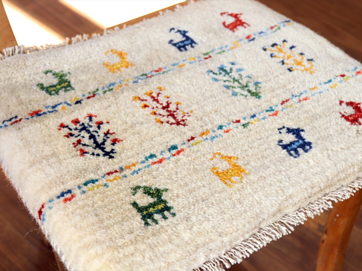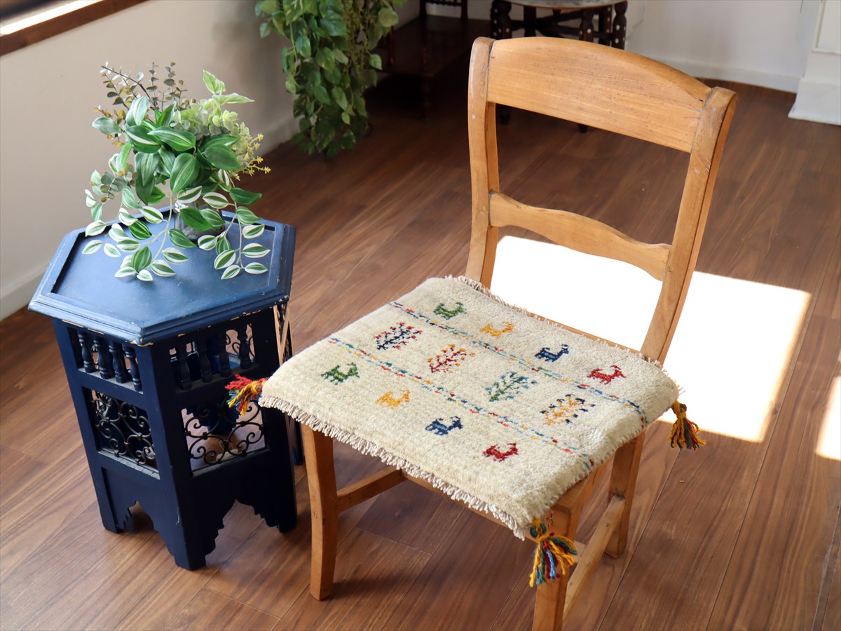 何枚も集めたくなる、40cm角の座布団サイズギャベ。四隅に大きなポンポンのついた、伝統的なスタイルで織られています。フローリングに並べて座布団がわりに使ったり、ベンチやダイニングチェアの座面など、使い方はいろいろ。壁にタペストリーのように飾るのもおすすめです。
