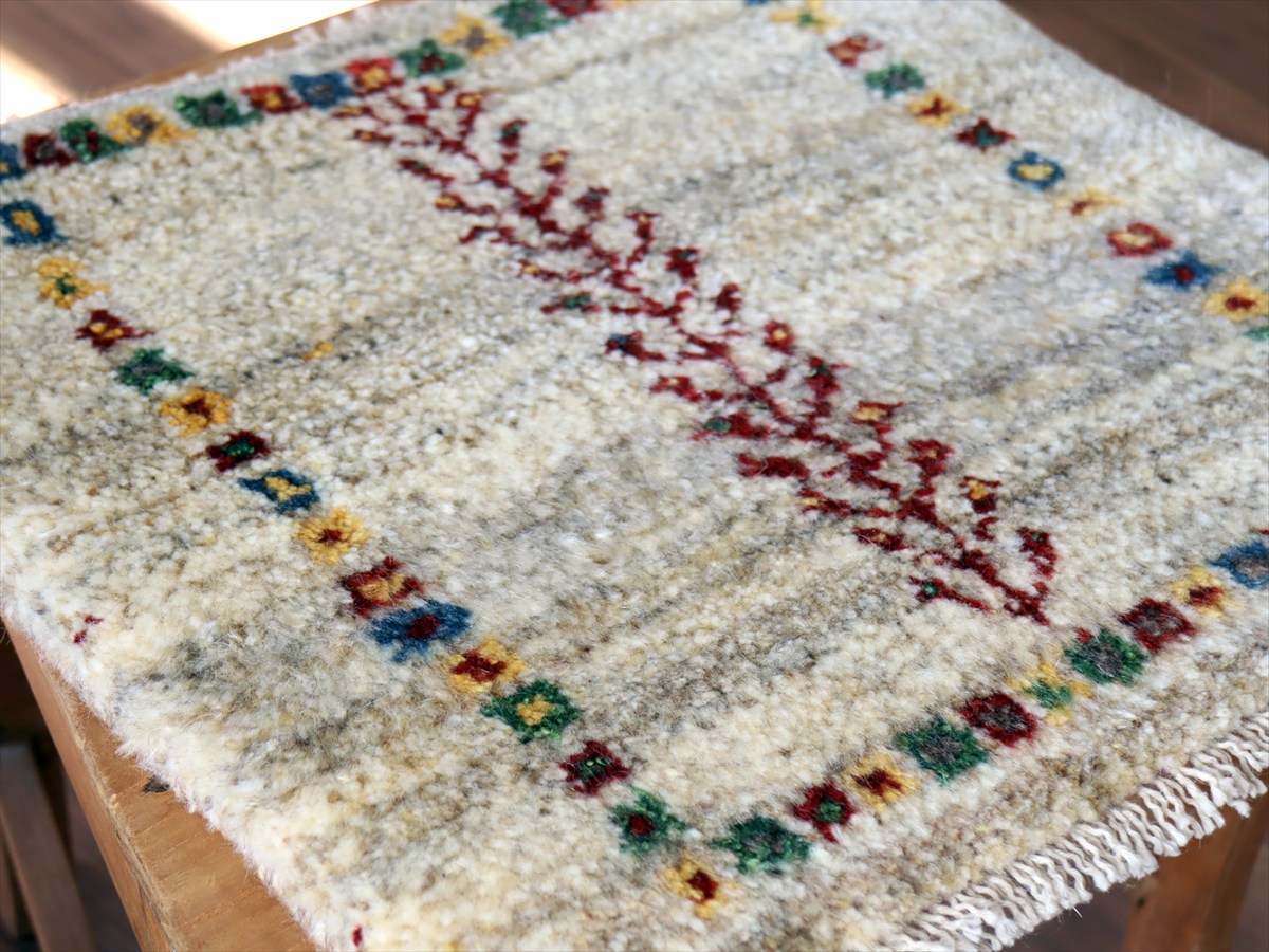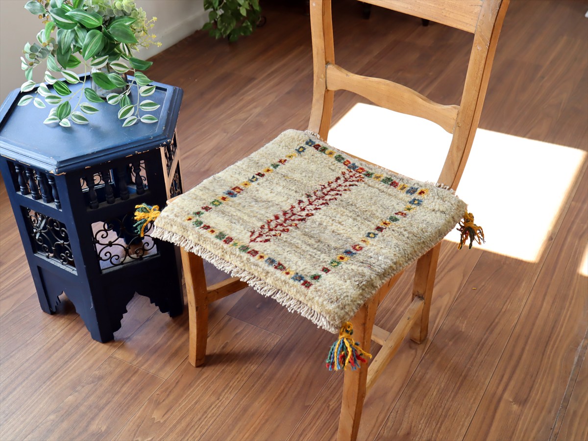 何枚も集めたくなる、40cm角の座布団サイズギャベ。四隅に大きなポンポンのついた、伝統的なスタイルで織られています。フローリングに並べて座布団がわりに使ったり、ベンチやダイニングチェアの座面など、使い方はいろいろ。壁にタペストリーのように飾るのもおすすめです。