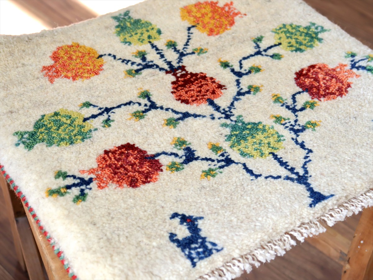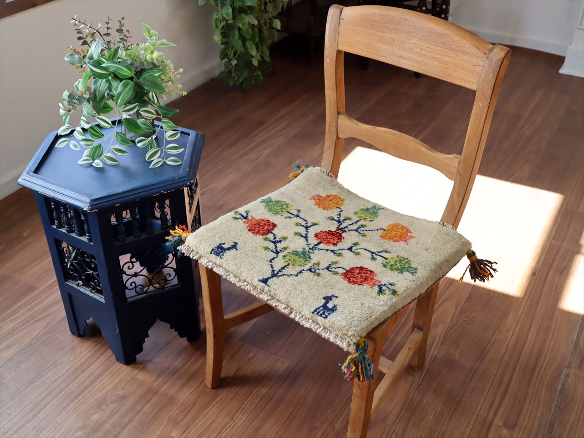 何枚も集めたくなる、40cm角の座布団サイズギャベ。四隅に大きなポンポンのついた、伝統的なスタイルで織られています。フローリングに並べて座布団がわりに使ったり、ベンチやダイニングチェアの座面など、使い方はいろいろ。壁にタペストリーのように飾るのもおすすめです。