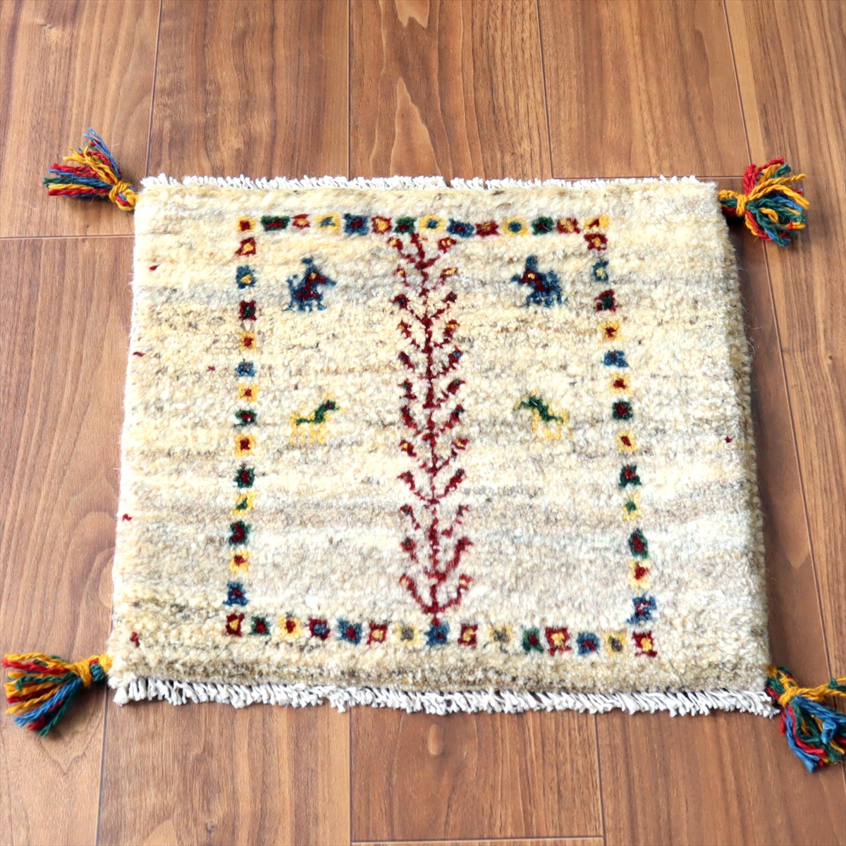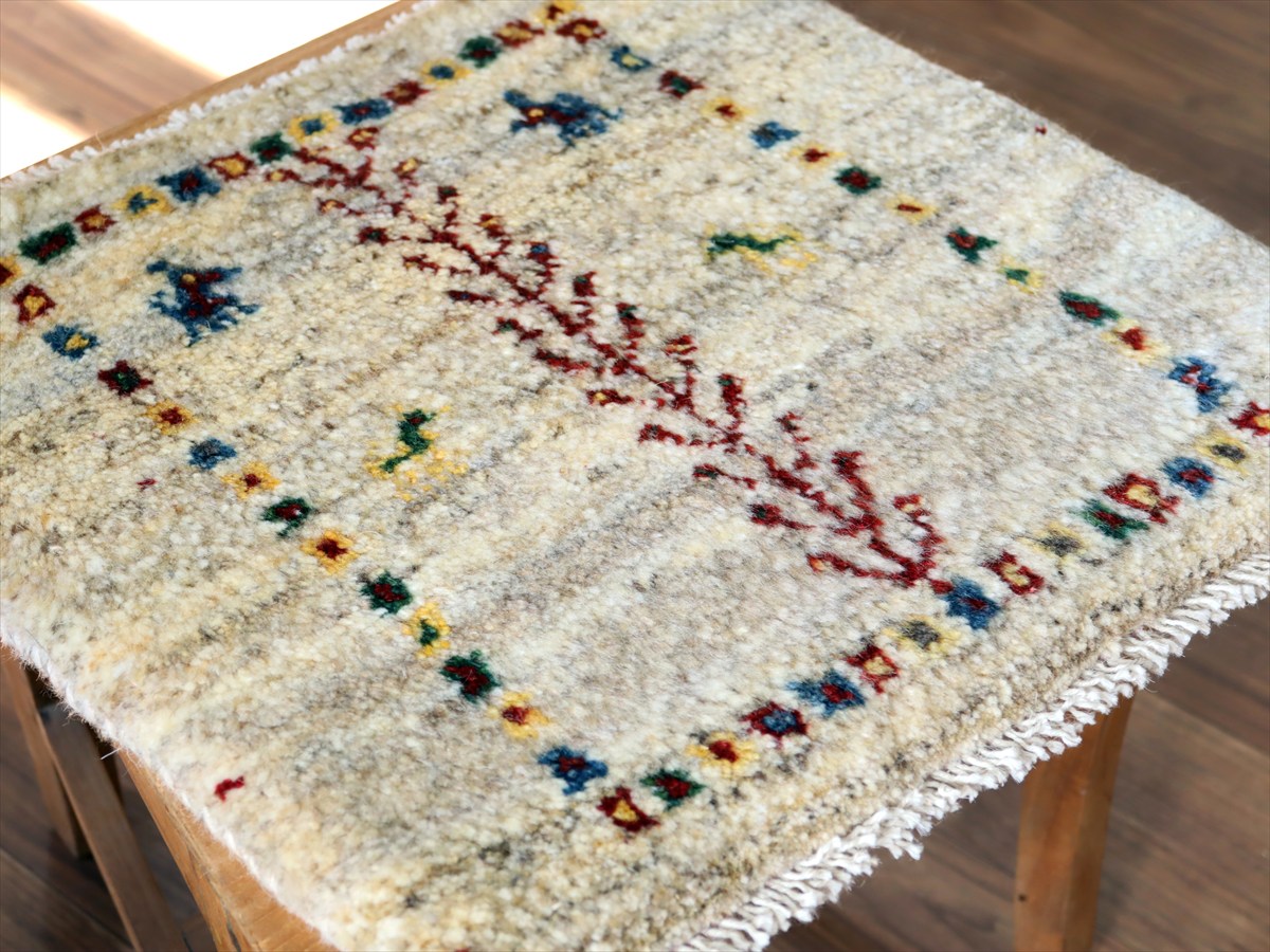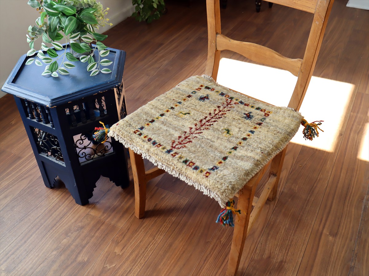 何枚も集めたくなる、40cm角の座布団サイズギャベ。四隅に大きなポンポンのついた、伝統的なスタイルで織られています。フローリングに並べて座布団がわりに使ったり、ベンチやダイニングチェアの座面など、使い方はいろいろ。壁にタペストリーのように飾るのもおすすめです。