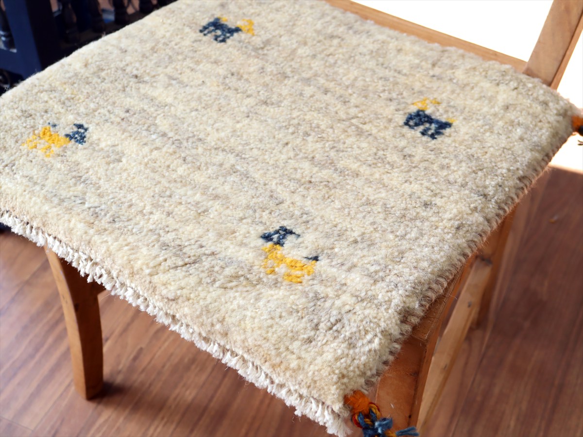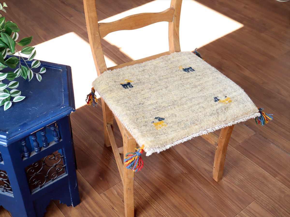 何枚も集めたくなる、40cm角の座布団サイズギャベ。四隅に大きなポンポンのついた、伝統的なスタイルで織られています。フローリングに並べて座布団がわりに使ったり、ベンチやダイニングチェアの座面など、使い方はいろいろ。壁にタペストリーのように飾るのもおすすめです。