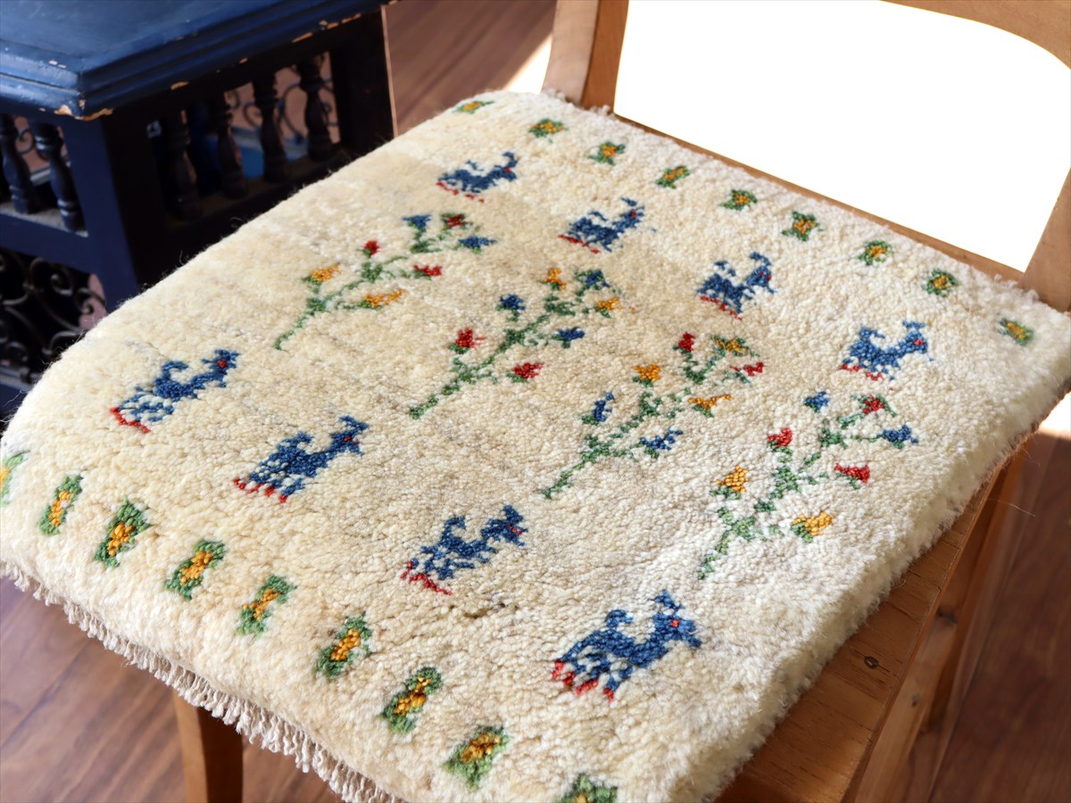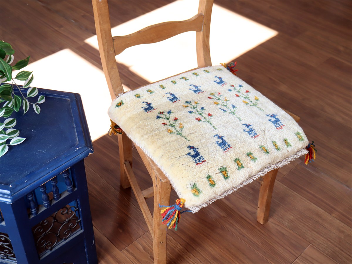 何枚も集めたくなる、40cm角の座布団サイズギャベ。四隅に大きなポンポンのついた、伝統的なスタイルで織られています。フローリングに並べて座布団がわりに使ったり、ベンチやダイニングチェアの座面など、使い方はいろいろ。壁にタペストリーのように飾るのもおすすめです。
