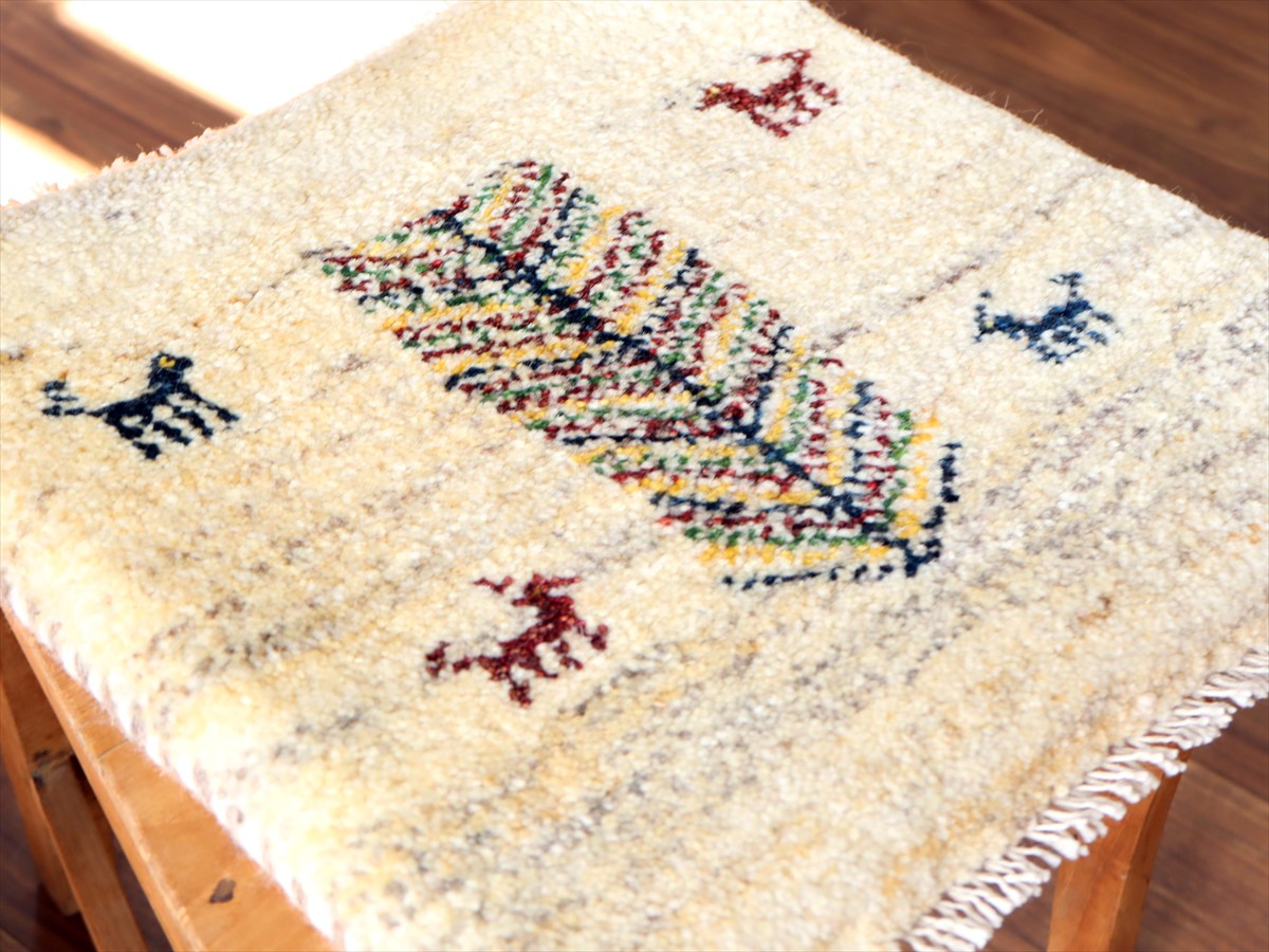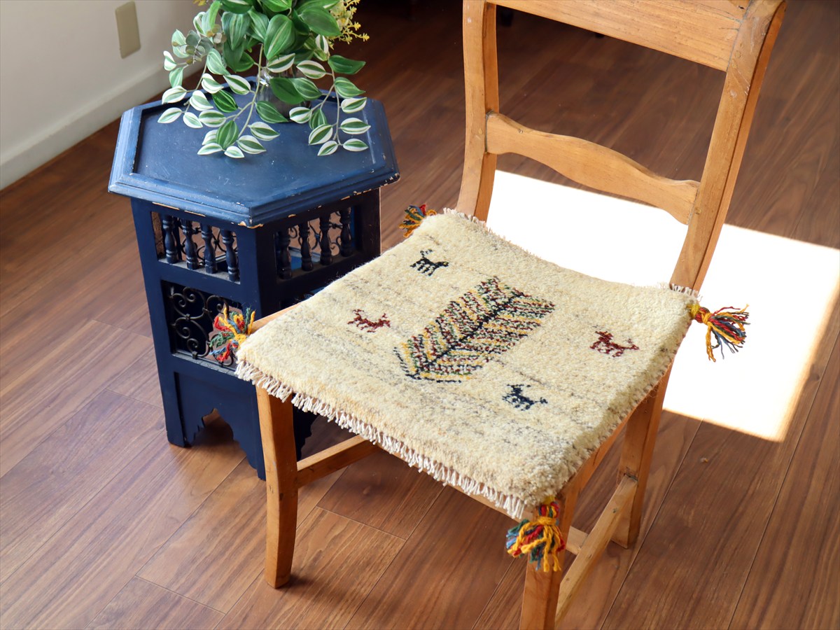 何枚も集めたくなる、40cm角の座布団サイズギャベ。四隅に大きなポンポンのついた、伝統的なスタイルで織られています。フローリングに並べて座布団がわりに使ったり、ベンチやダイニングチェアの座面など、使い方はいろいろ。壁にタペストリーのように飾るのもおすすめです。