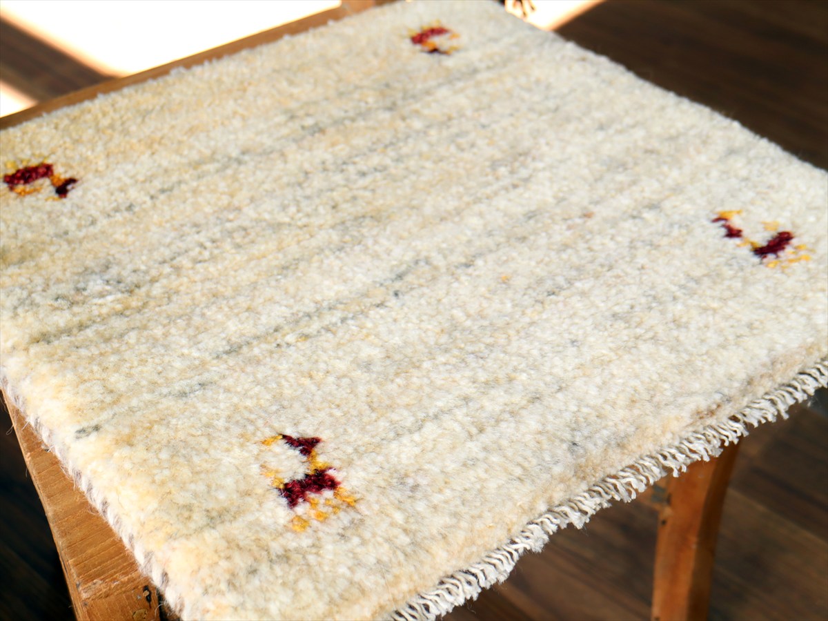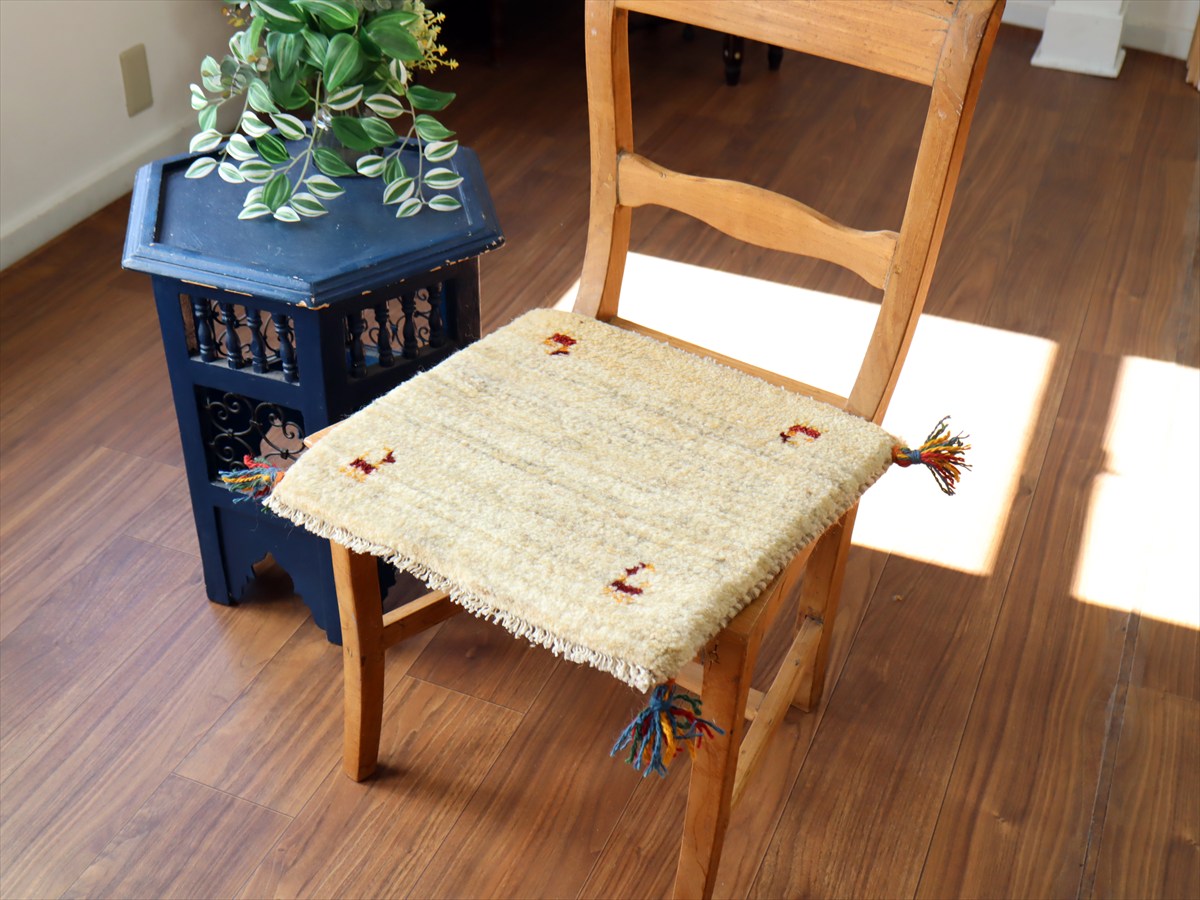 何枚も集めたくなる、40cm角の座布団サイズギャベ。四隅に大きなポンポンのついた、伝統的なスタイルで織られています。フローリングに並べて座布団がわりに使ったり、ベンチやダイニングチェアの座面など、使い方はいろいろ。壁にタペストリーのように飾るのもおすすめです。