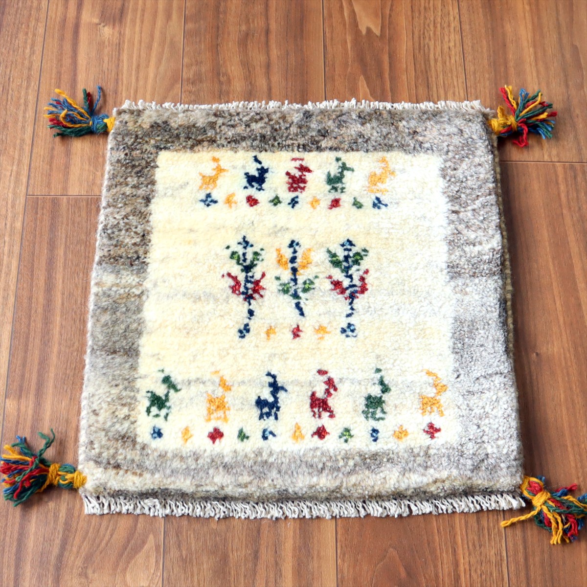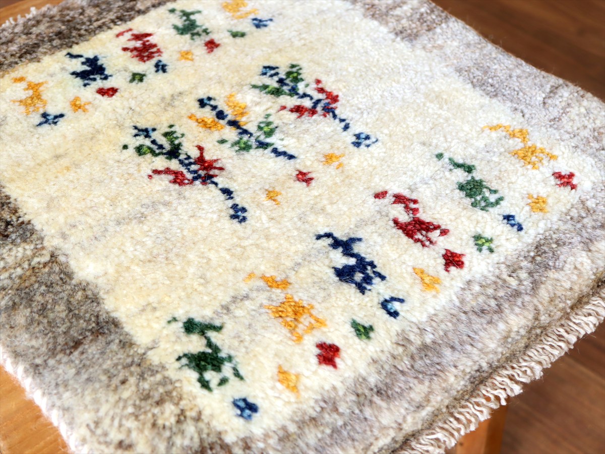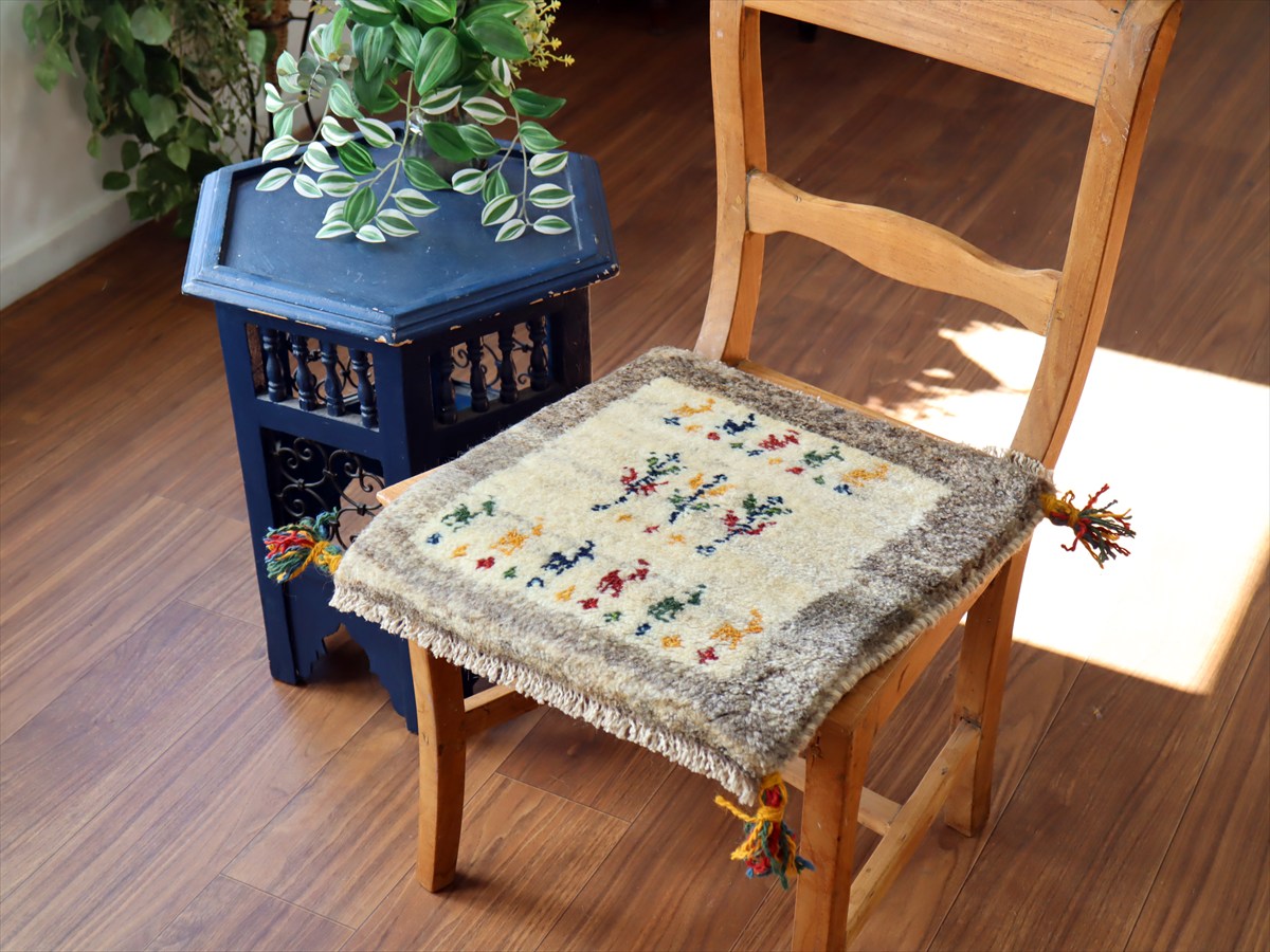 何枚も集めたくなる、40cm角の座布団サイズギャベ。四隅に大きなポンポンのついた、伝統的なスタイルで織られています。フローリングに並べて座布団がわりに使ったり、ベンチやダイニングチェアの座面など、使い方はいろいろ。壁にタペストリーのように飾るのもおすすめです。