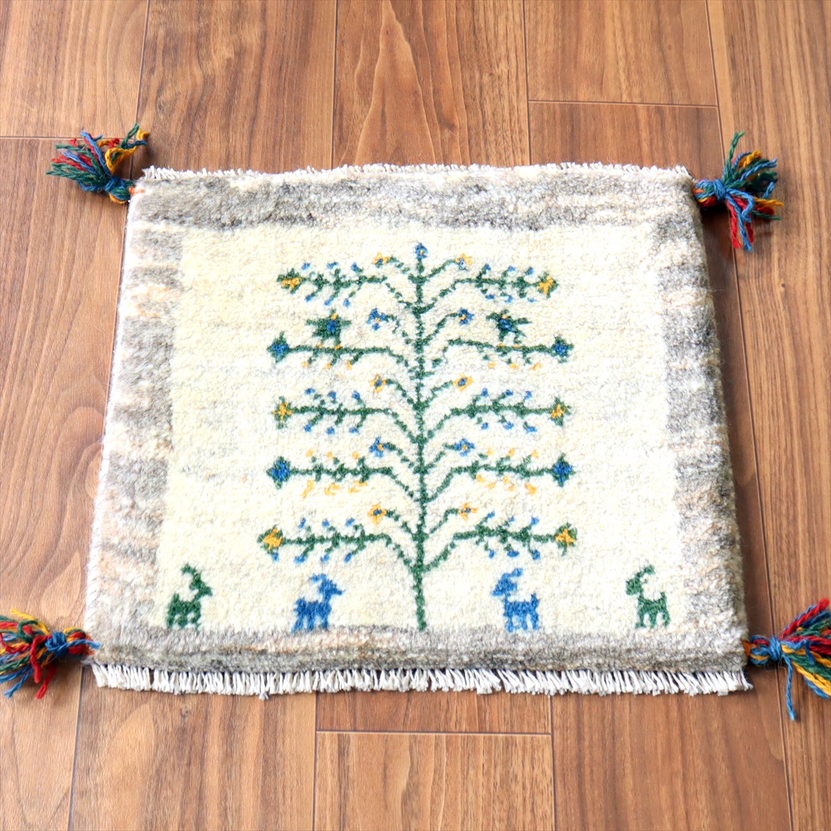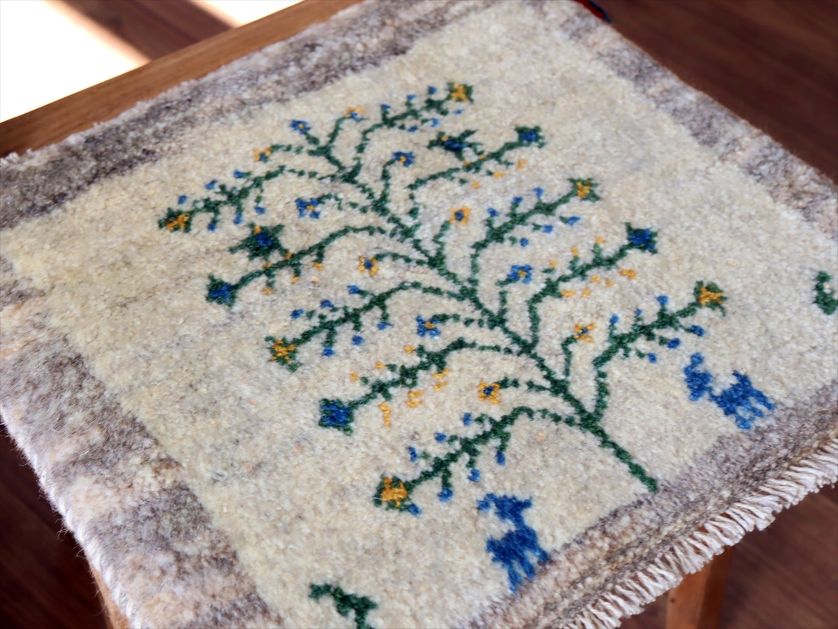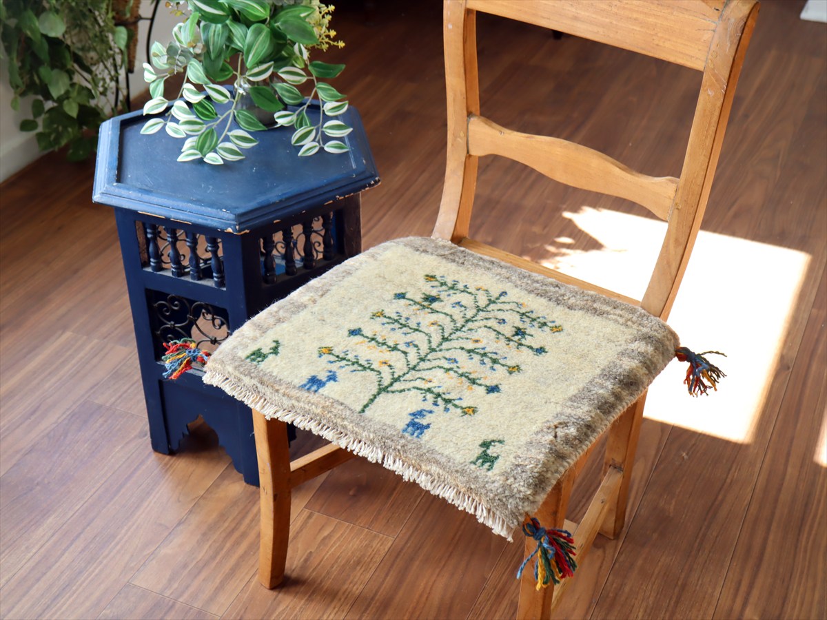 何枚も集めたくなる、40cm角の座布団サイズギャベ。四隅に大きなポンポンのついた、伝統的なスタイルで織られています。フローリングに並べて座布団がわりに使ったり、ベンチやダイニングチェアの座面など、使い方はいろいろ。壁にタペストリーのように飾るのもおすすめです。