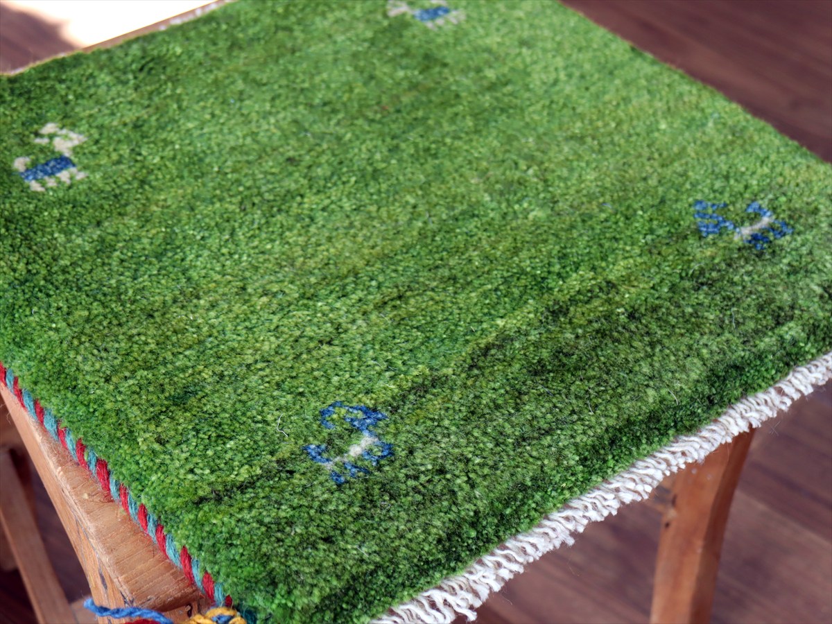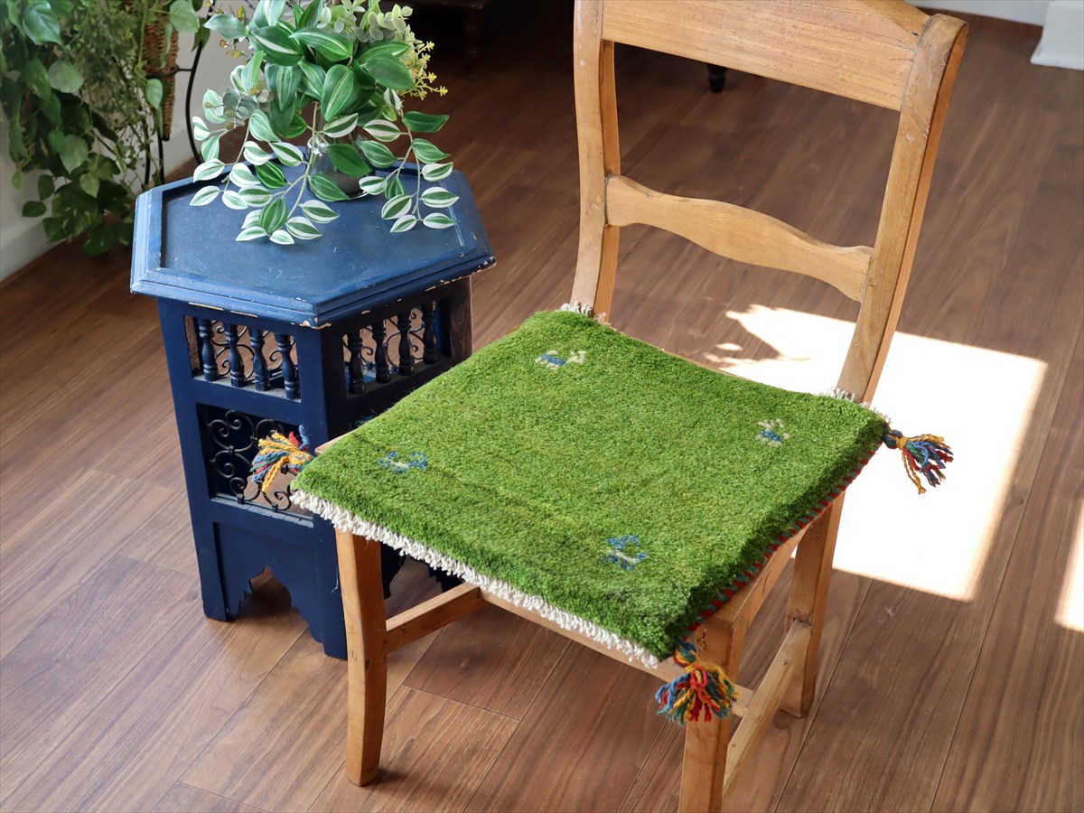 何枚も集めたくなる、40cm角の座布団サイズギャベ。四隅に大きなポンポンのついた、伝統的なスタイルで織られています。フローリングに並べて座布団がわりに使ったり、ベンチやダイニングチェアの座面など、使い方はいろいろ。壁にタペストリーのように飾るのもおすすめです。