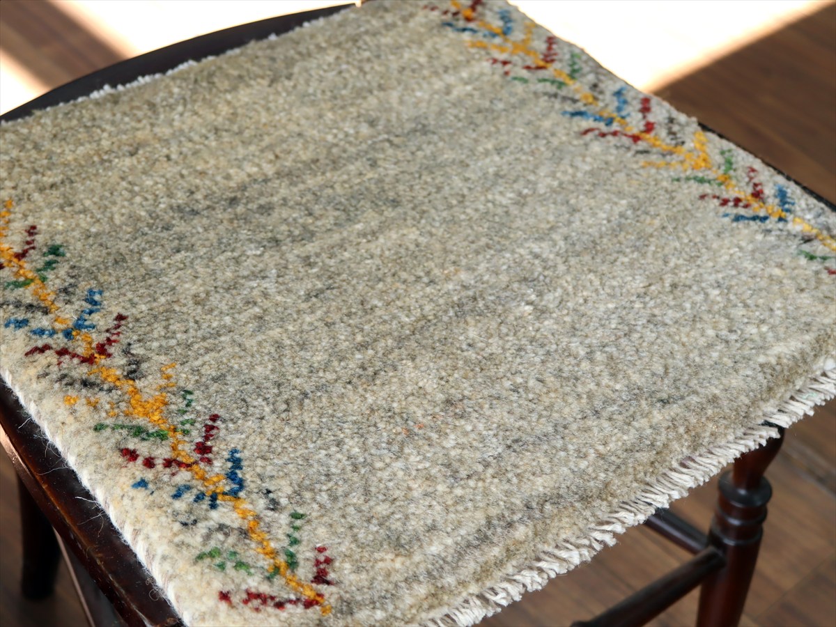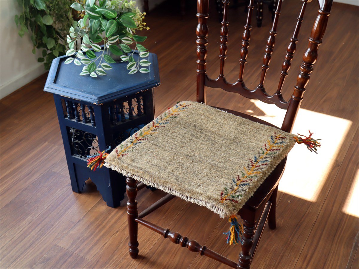 何枚も集めたくなる、40cm角の座布団サイズギャベ。四隅に大きなポンポンのついた、伝統的なスタイルで織られています。フローリングに並べて座布団がわりに使ったり、ベンチやダイニングチェアの座面など、使い方はいろいろ。壁にタペストリーのように飾るのもおすすめです。