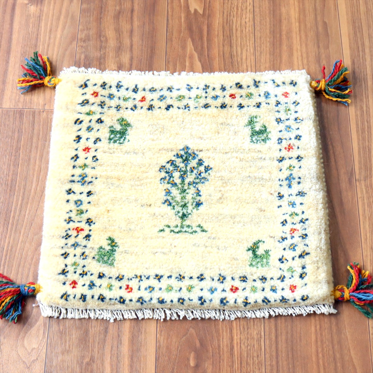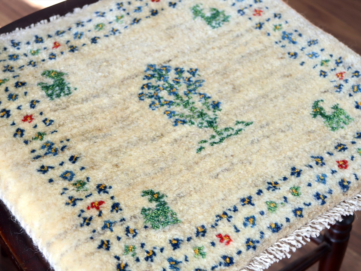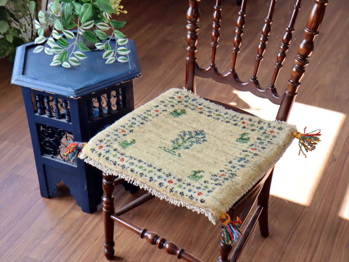 何枚も集めたくなる、40cm角の座布団サイズギャベ。四隅に大きなポンポンのついた、伝統的なスタイルで織られています。フローリングに並べて座布団がわりに使ったり、ベンチやダイニングチェアの座面など、使い方はいろいろ。壁にタペストリーのように飾るのもおすすめです。