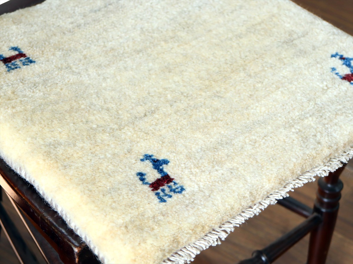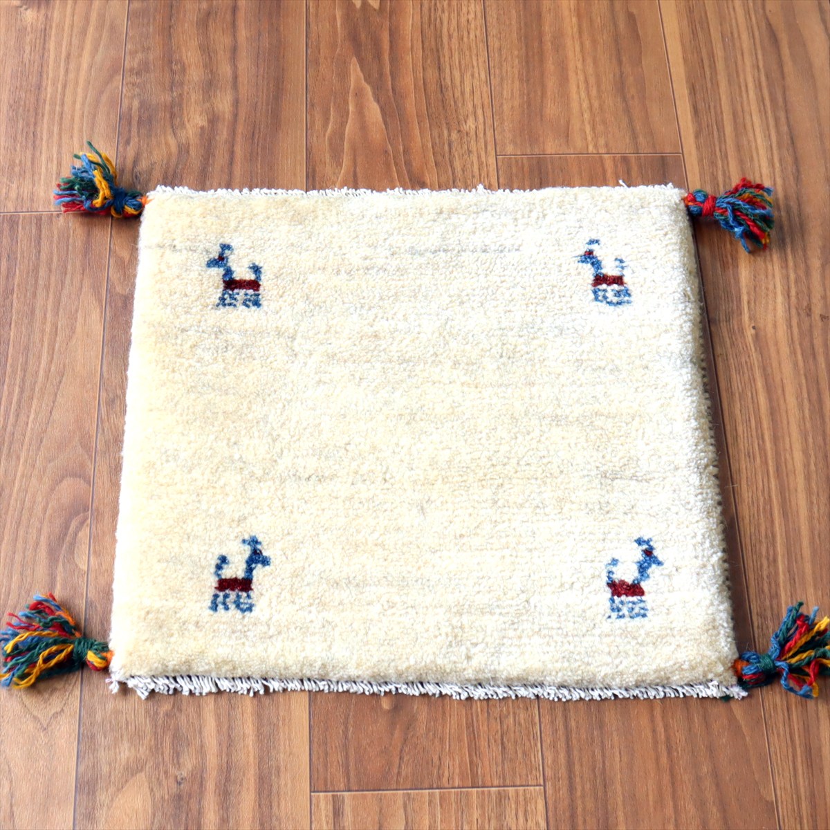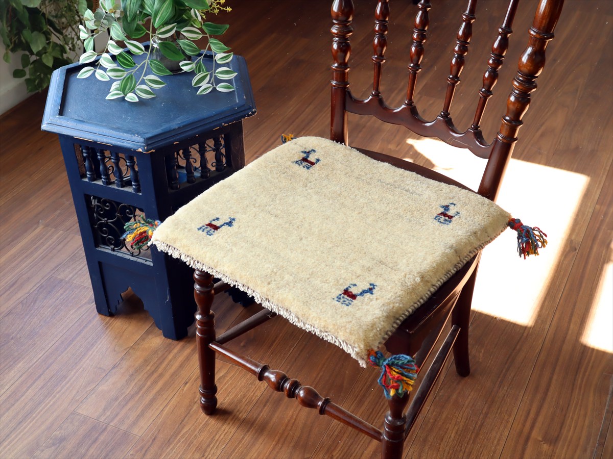 何枚も集めたくなる、40cm角の座布団サイズギャベ。四隅に大きなポンポンのついた、伝統的なスタイルで織られています。フローリングに並べて座布団がわりに使ったり、ベンチやダイニングチェアの座面など、使い方はいろいろ。壁にタペストリーのように飾るのもおすすめです。