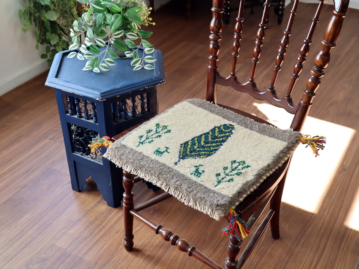 何枚も集めたくなる、40cm角の座布団サイズギャベ。四隅に大きなポンポンのついた、伝統的なスタイルで織られています。フローリングに並べて座布団がわりに使ったり、ベンチやダイニングチェアの座面など、使い方はいろいろ。壁にタペストリーのように飾るのもおすすめです。