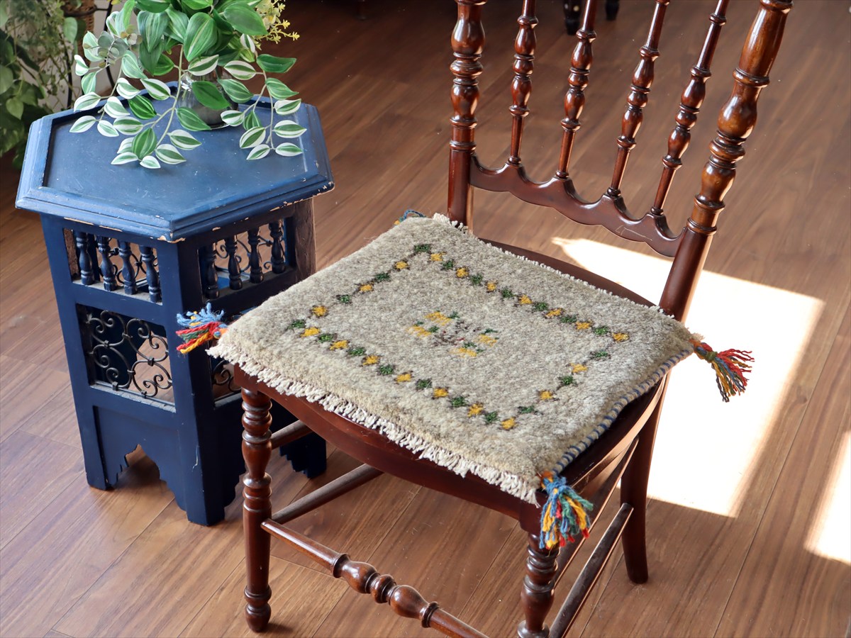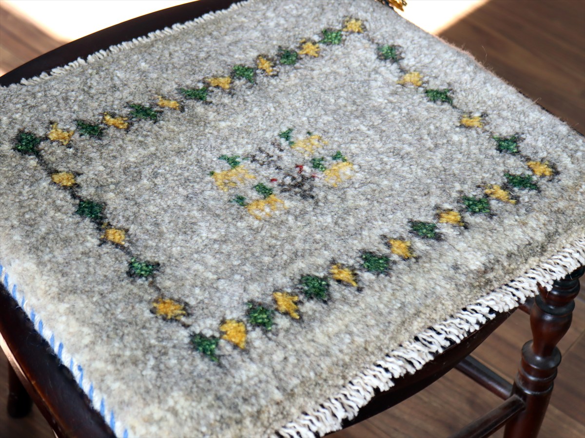 何枚も集めたくなる、40cm角の座布団サイズギャベ。四隅に大きなポンポンのついた、伝統的なスタイルで織られています。フローリングに並べて座布団がわりに使ったり、ベンチやダイニングチェアの座面など、使い方はいろいろ。壁にタペストリーのように飾るのもおすすめです。