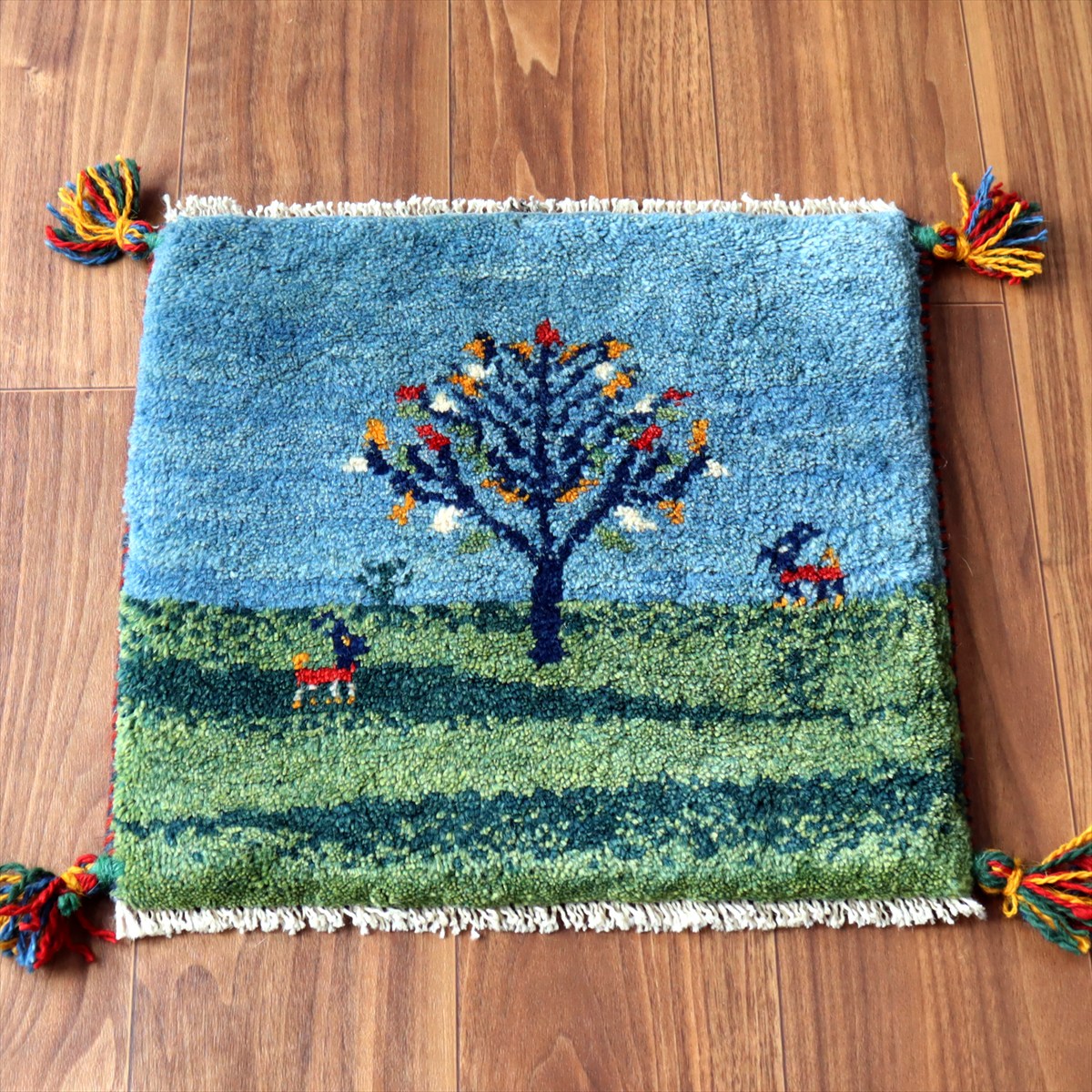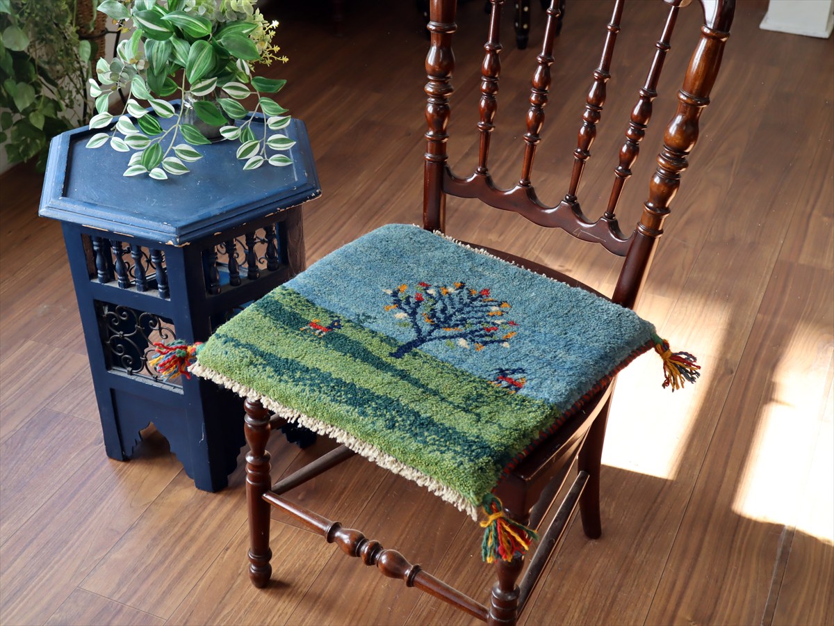 何枚も集めたくなる、40cm角の座布団サイズギャベ。四隅に大きなポンポンのついた、伝統的なスタイルで織られています。フローリングに並べて座布団がわりに使ったり、ベンチやダイニングチェアの座面など、使い方はいろいろ。壁にタペストリーのように飾るのもおすすめです。