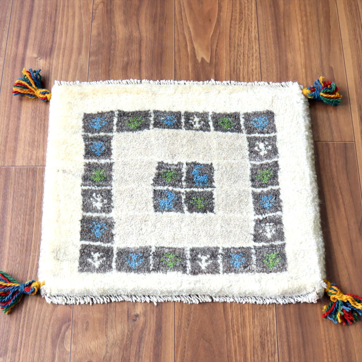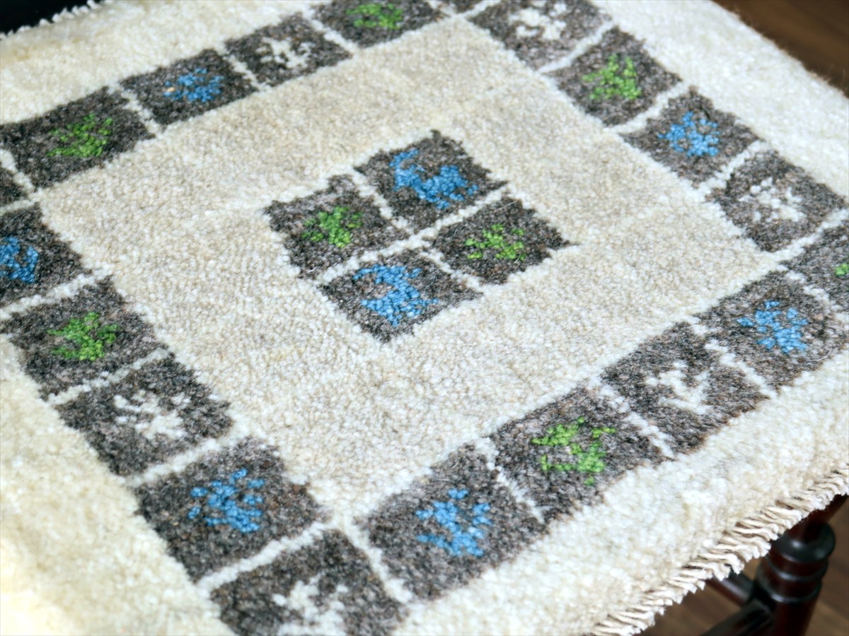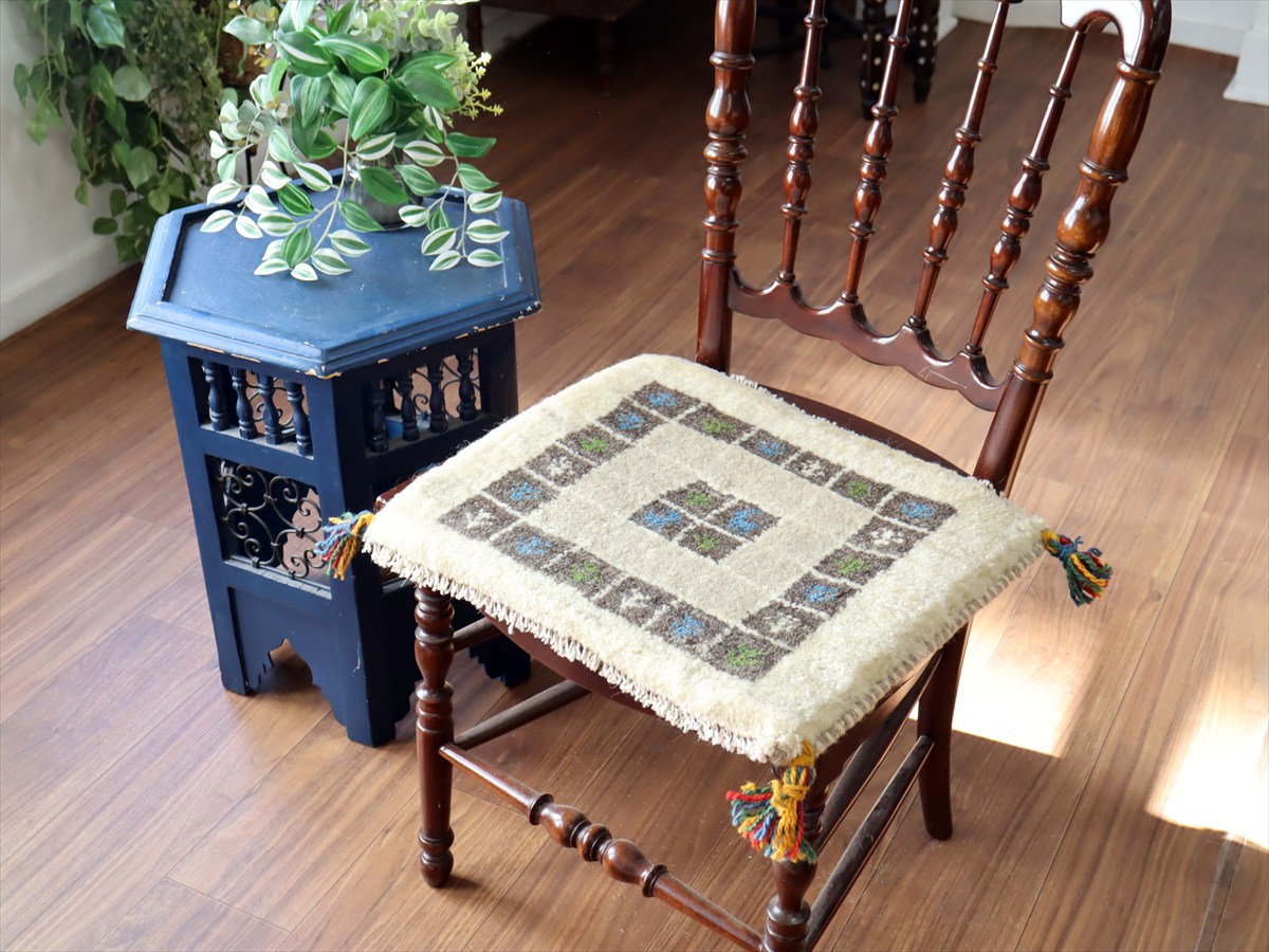何枚も集めたくなる、40cm角の座布団サイズギャベ。四隅に大きなポンポンのついた、伝統的なスタイルで織られています。フローリングに並べて座布団がわりに使ったり、ベンチやダイニングチェアの座面など、使い方はいろいろ。壁にタペストリーのように飾るのもおすすめです。