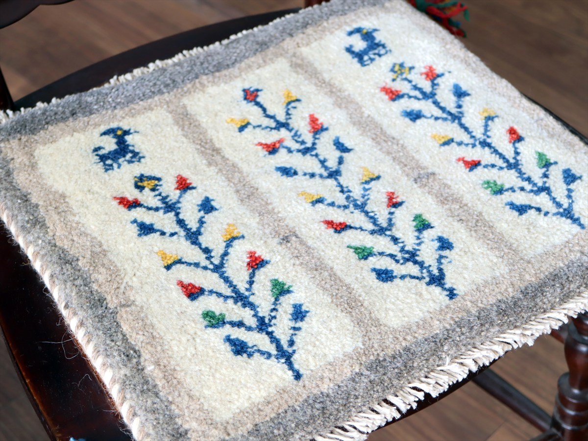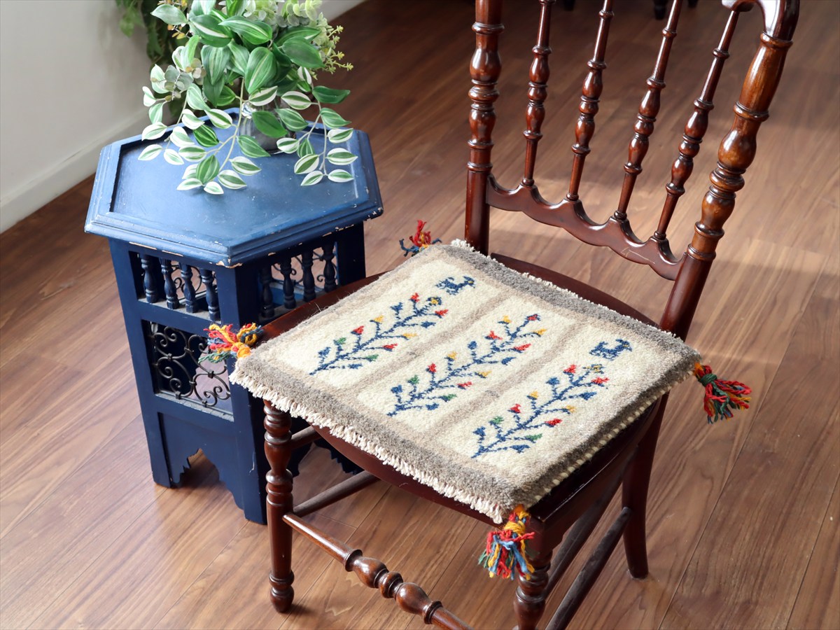 何枚も集めたくなる、40cm角の座布団サイズギャベ。四隅に大きなポンポンのついた、伝統的なスタイルで織られています。フローリングに並べて座布団がわりに使ったり、ベンチやダイニングチェアの座面など、使い方はいろいろ。壁にタペストリーのように飾るのもおすすめです。