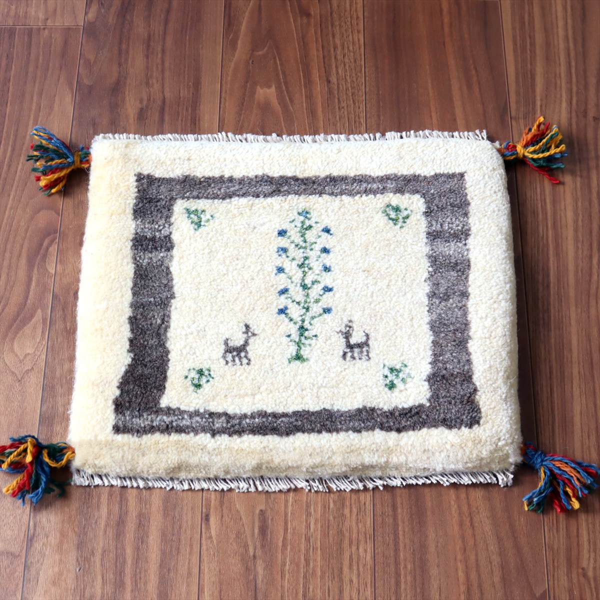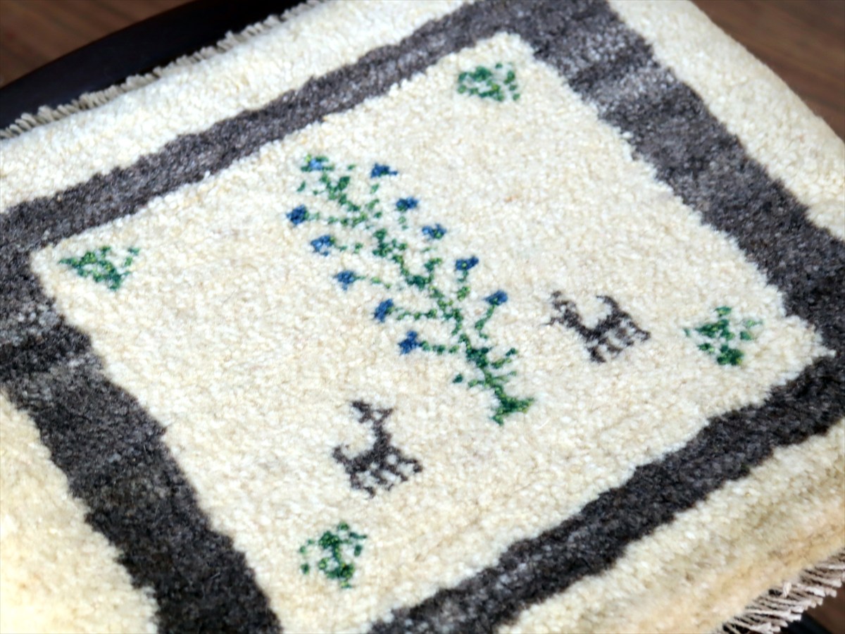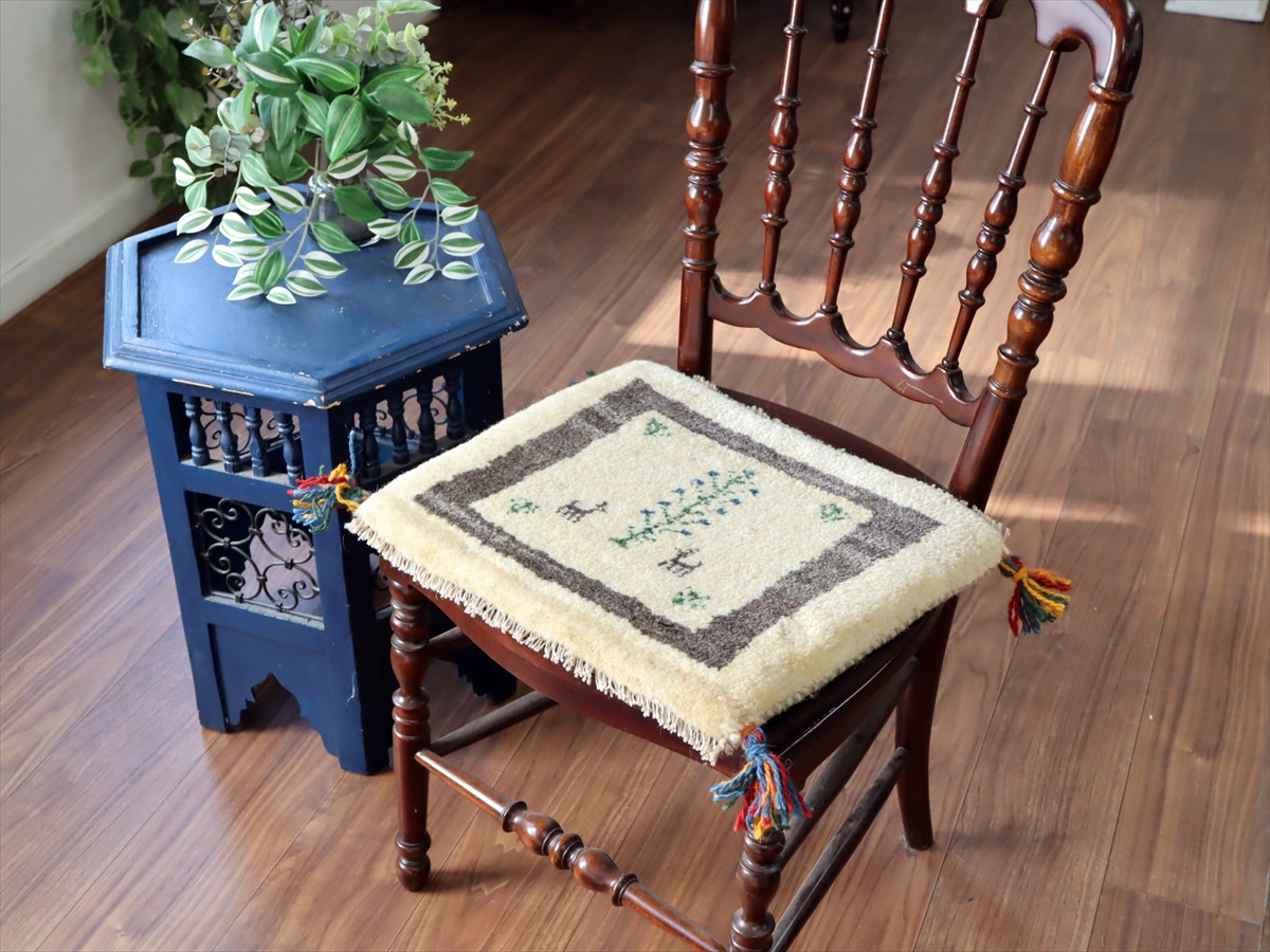 何枚も集めたくなる、40cm角の座布団サイズギャベ。四隅に大きなポンポンのついた、伝統的なスタイルで織られています。フローリングに並べて座布団がわりに使ったり、ベンチやダイニングチェアの座面など、使い方はいろいろ。壁にタペストリーのように飾るのもおすすめです。